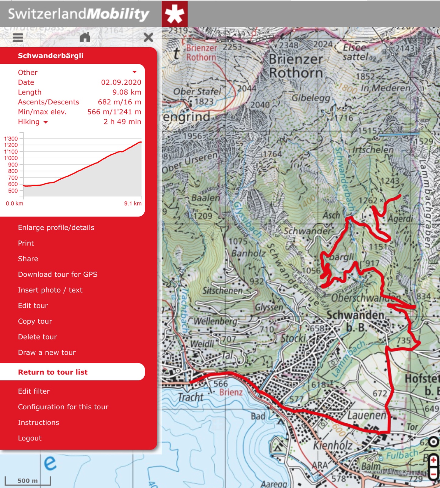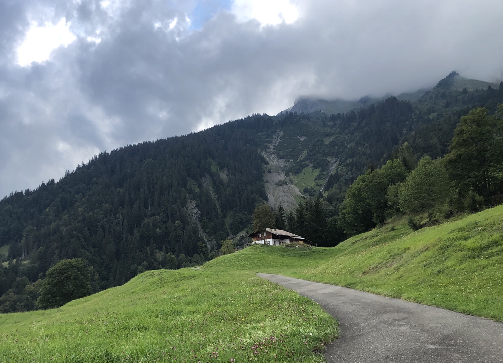 Ich habe Schwanden noch nicht erreicht, als plötzlich schwere Tropfen fallen. Einen halben Kilometer weiter ist es wieder trocken und auch ich trockne im warmen Wind sehr rasch wieder ab.