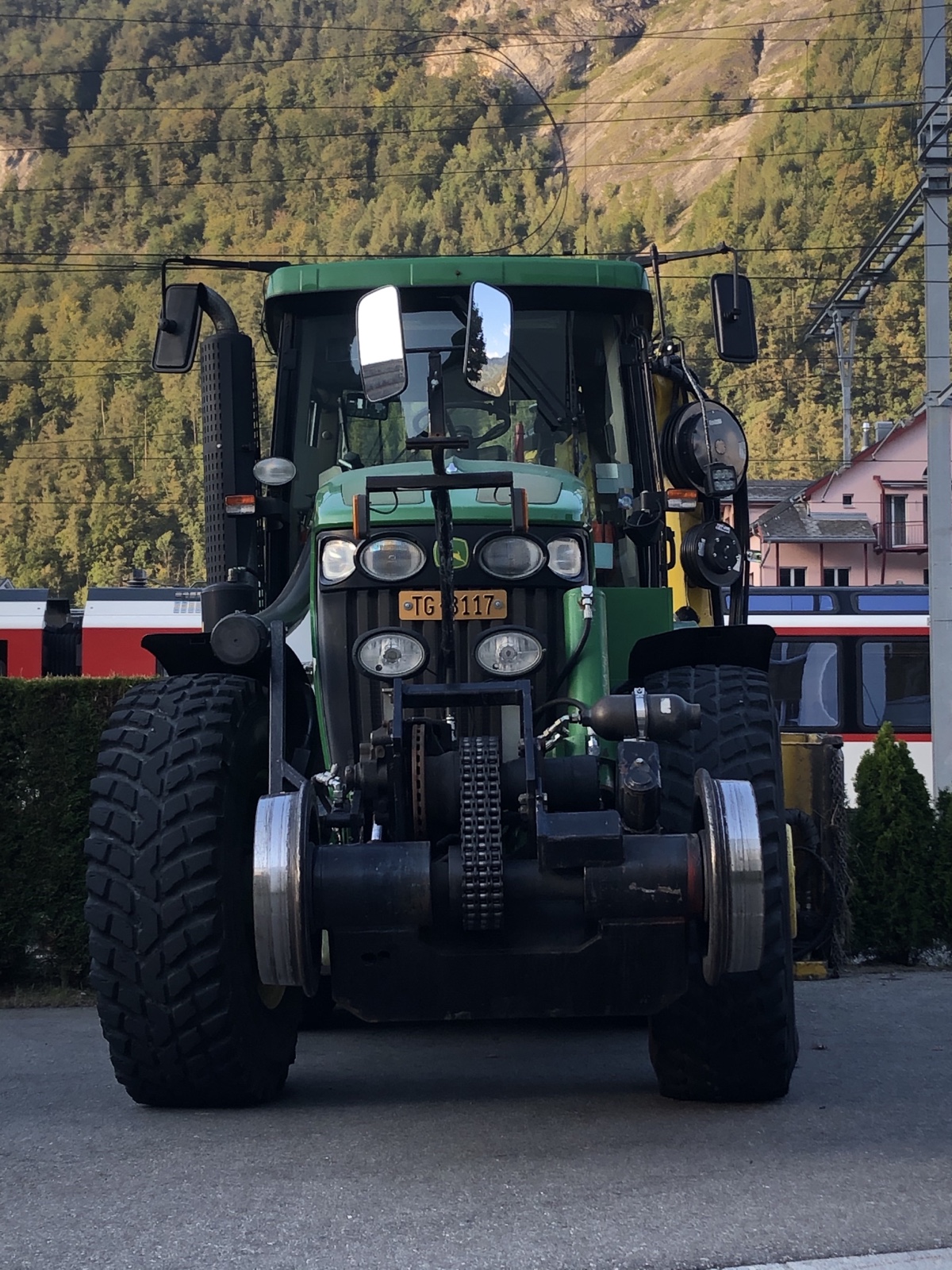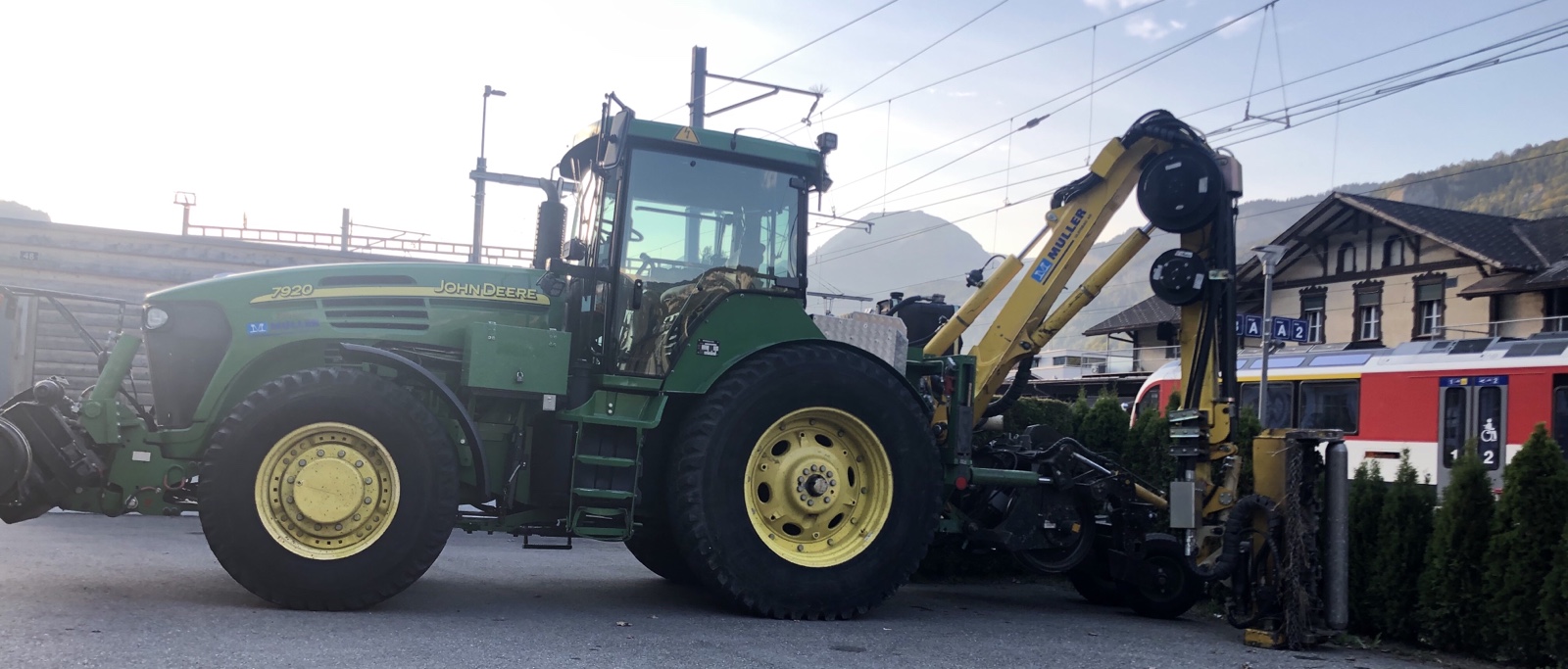 Diese Strasse-Schiene-Traktoren werden zum Mähen der Böschungen beidseits der Gleise verwendet. Das Fahrwerk für auf die Schienen ist nicht symmetrisch angebaut.