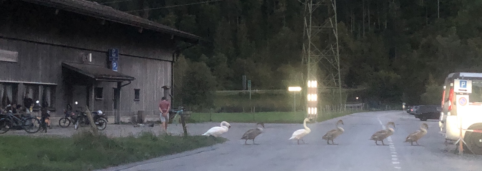 Schwäne im Gänsemarsch: 3 Elterntiere mit 5 jungen Schwänen. Welches der 3 Alttiere ist der Vater?