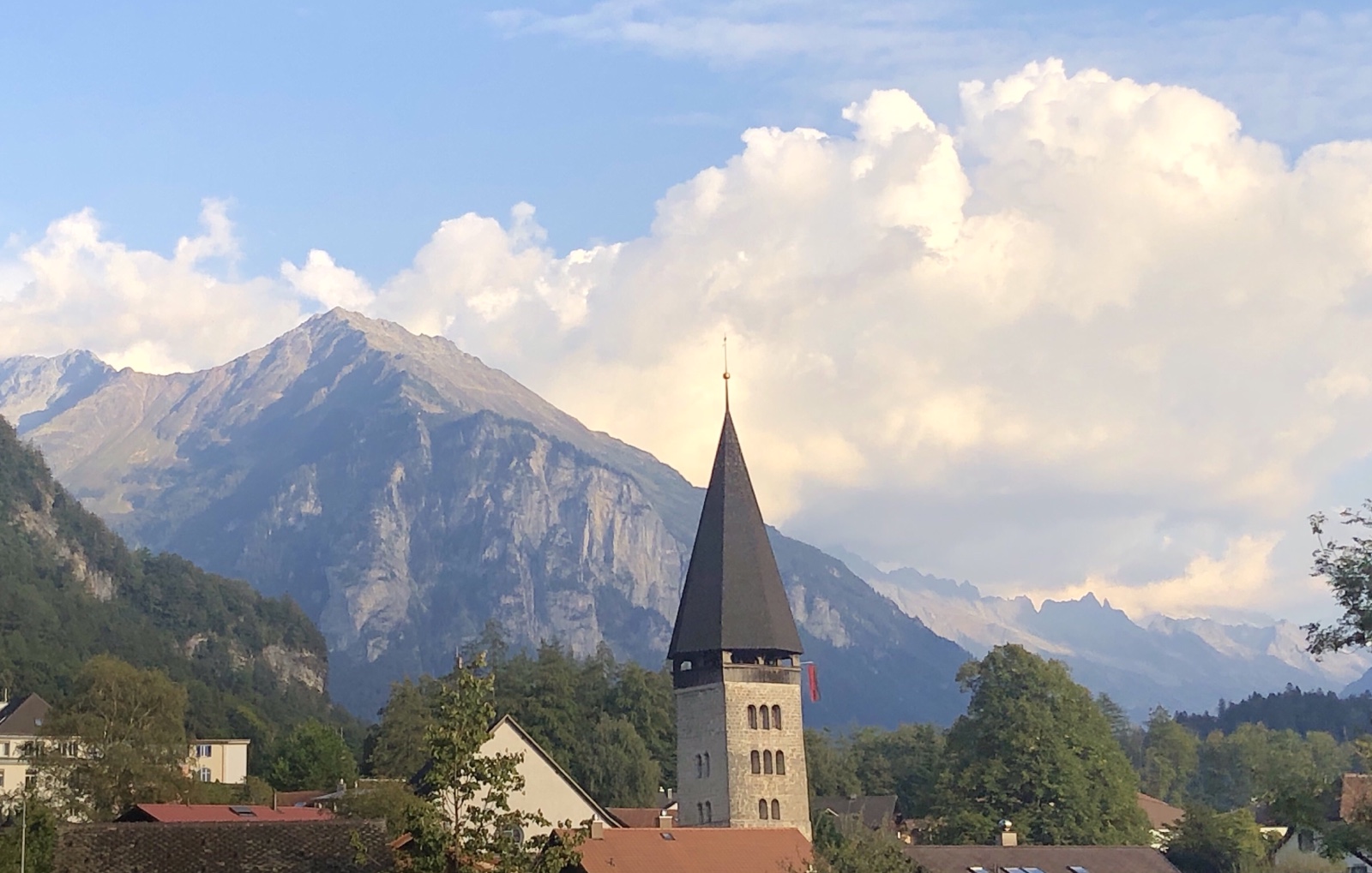 Reformierte Kirche in Meiringen. Interessant ist, dass der Turm baulich komplett von der Kirche getrennt dasteht.