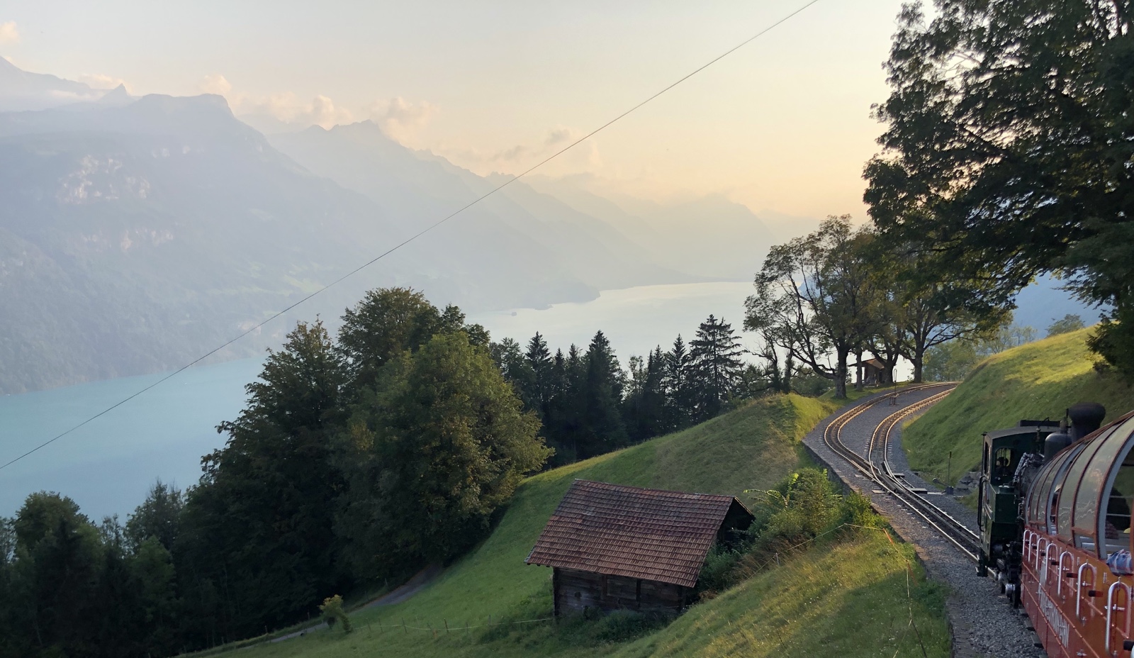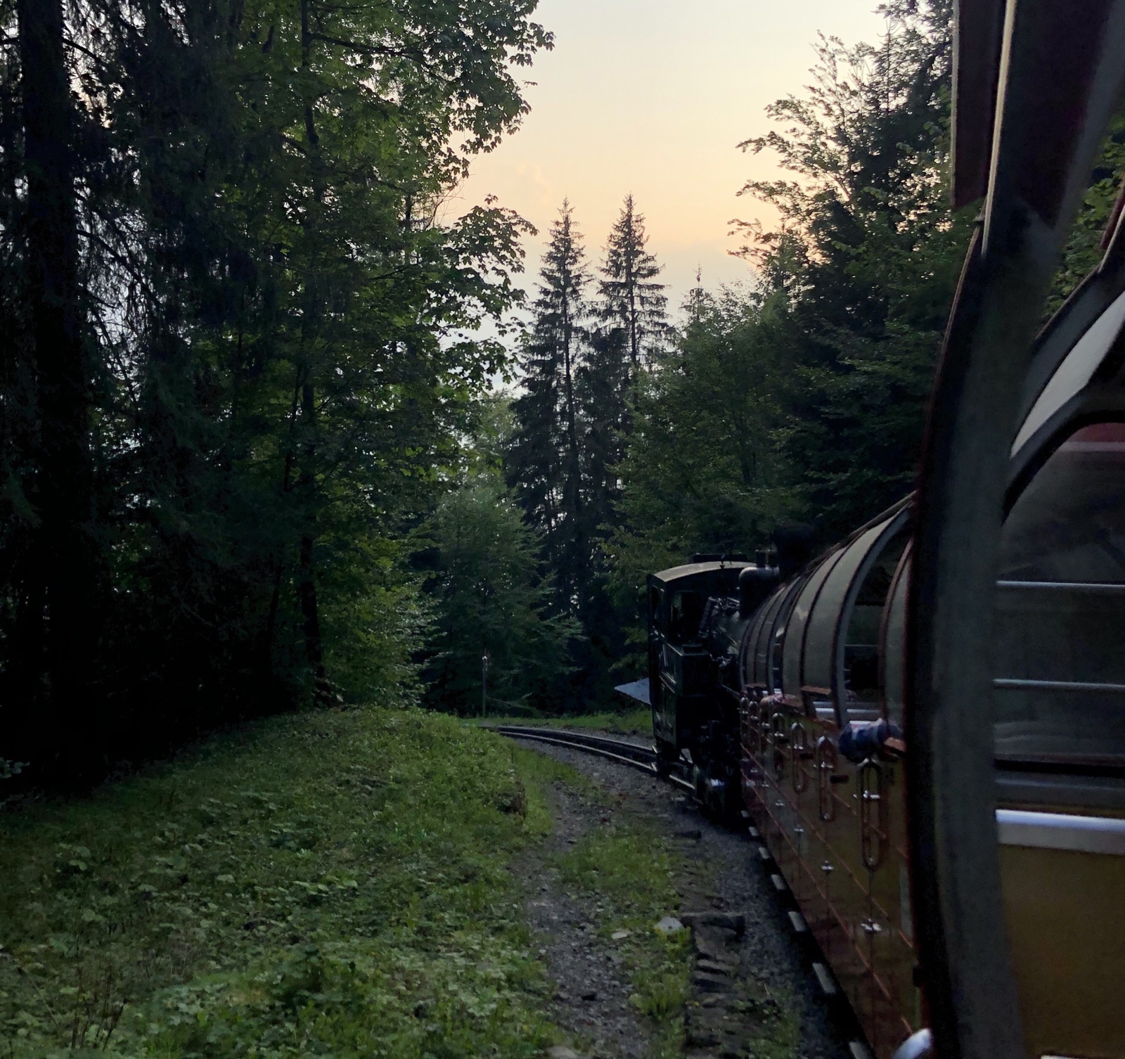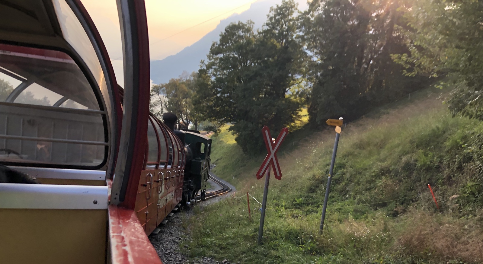 Ich bin ganz erstaunt, dass nur ein knappes Dutzend Fahrgäste im letzten Zug sitzen. Die letzte Talfahrt ist ein ganz besonderer Genuss im Abendlicht.