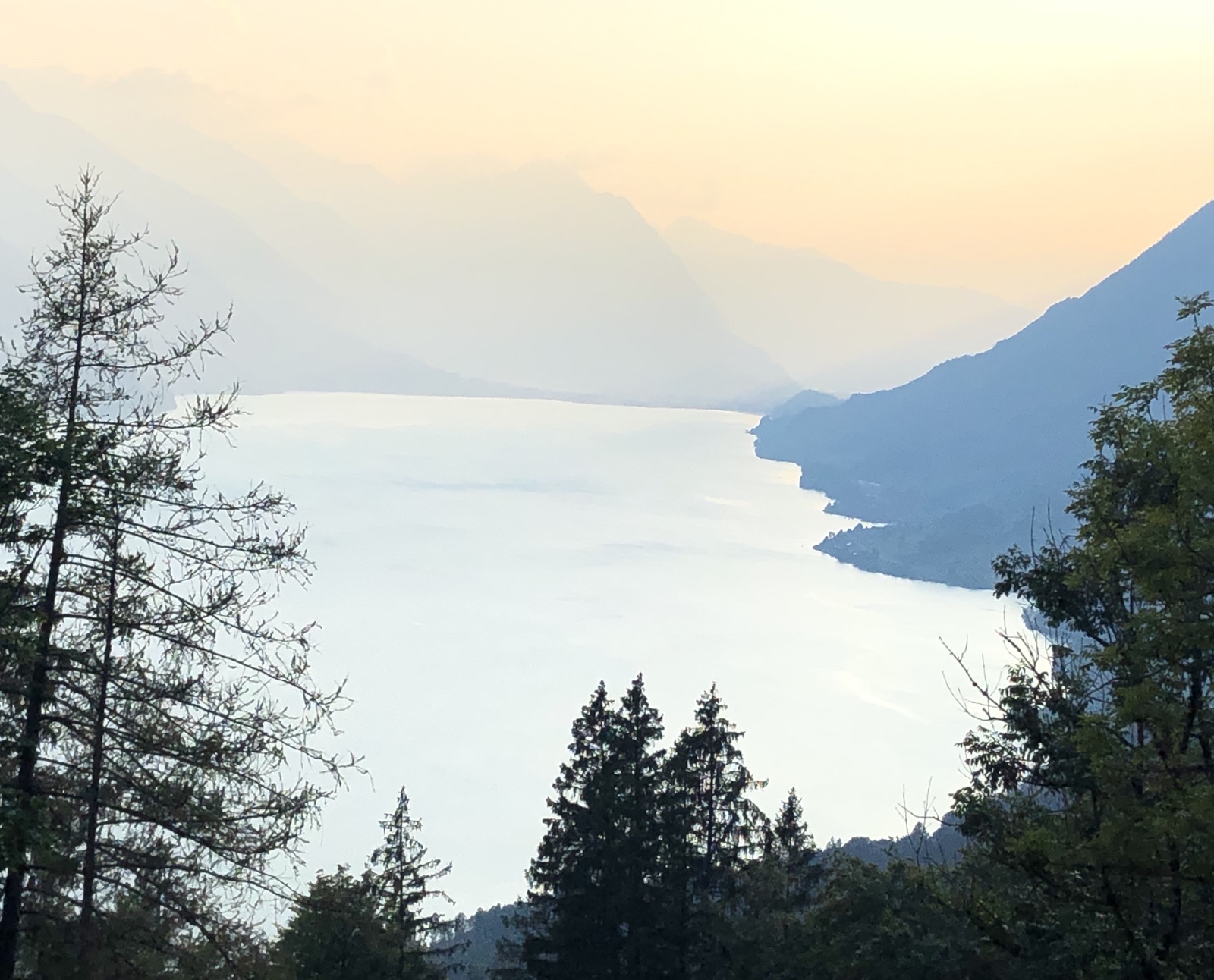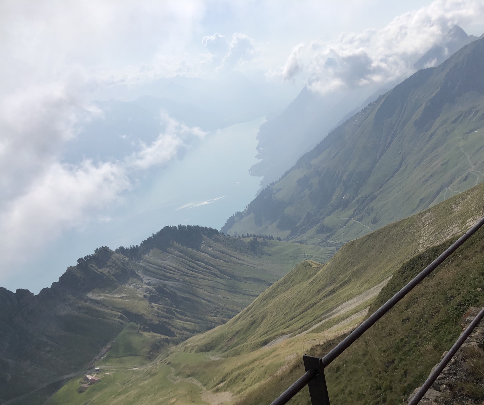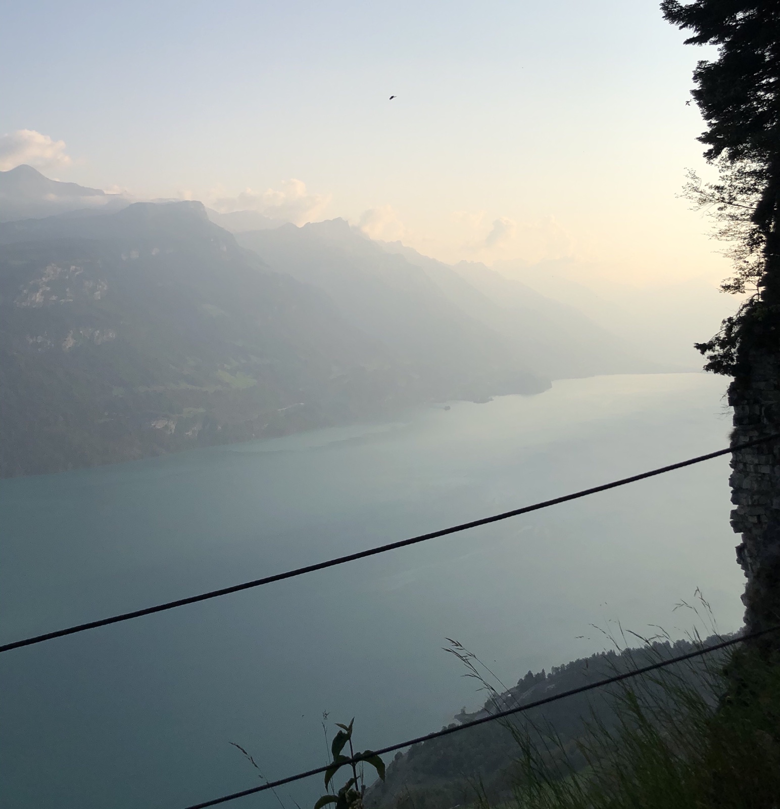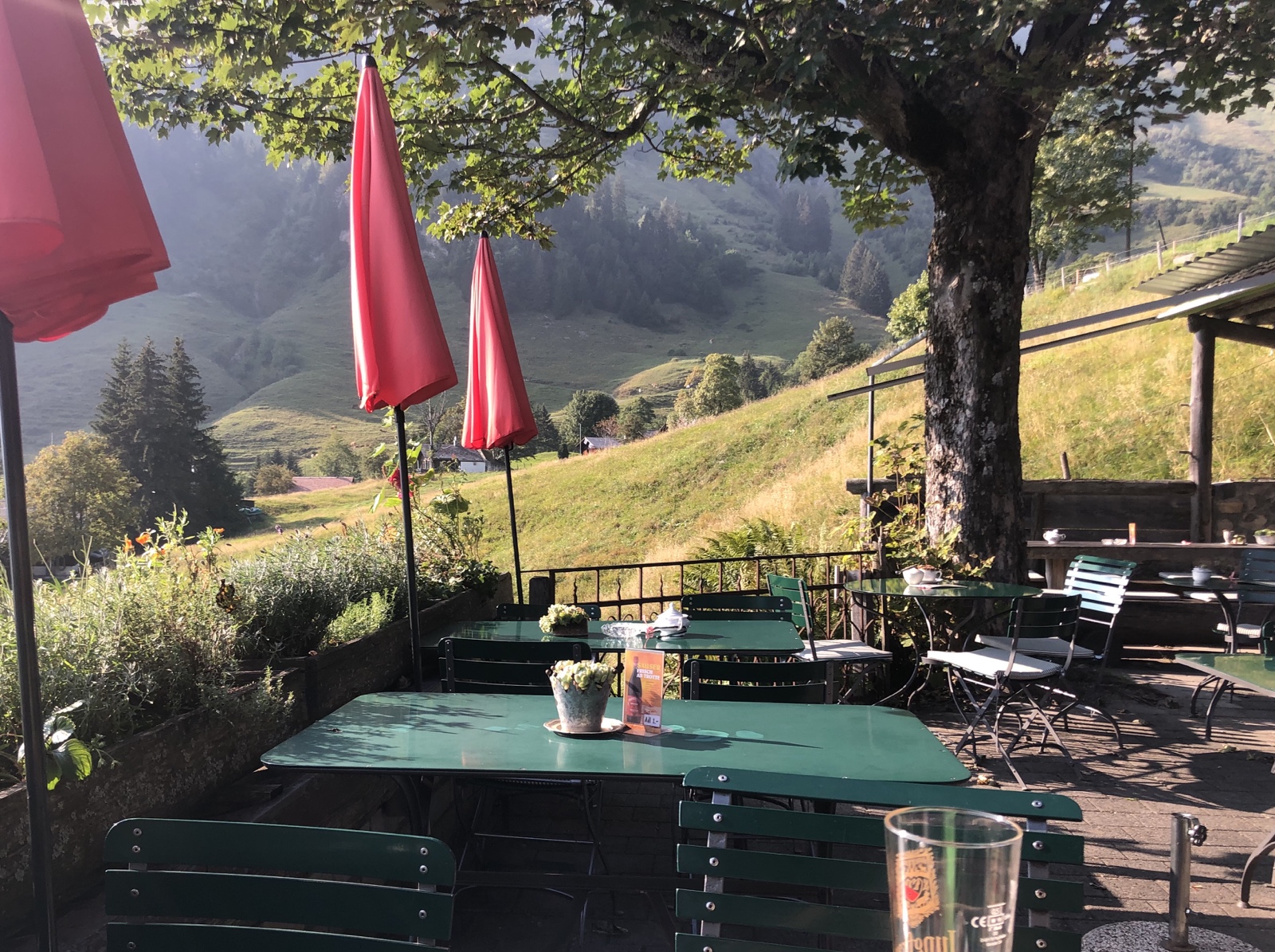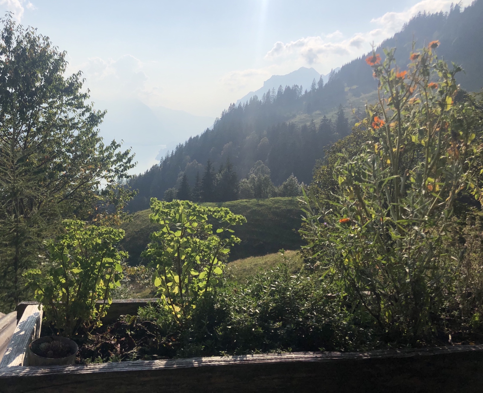 Ich bin alleine auf der schönen Berghausterrasse. Geniesse ein Bierchen, die Aussicht in den Dunst über dem Brienzersee und ein Gespräch mit der Gastgeberin.