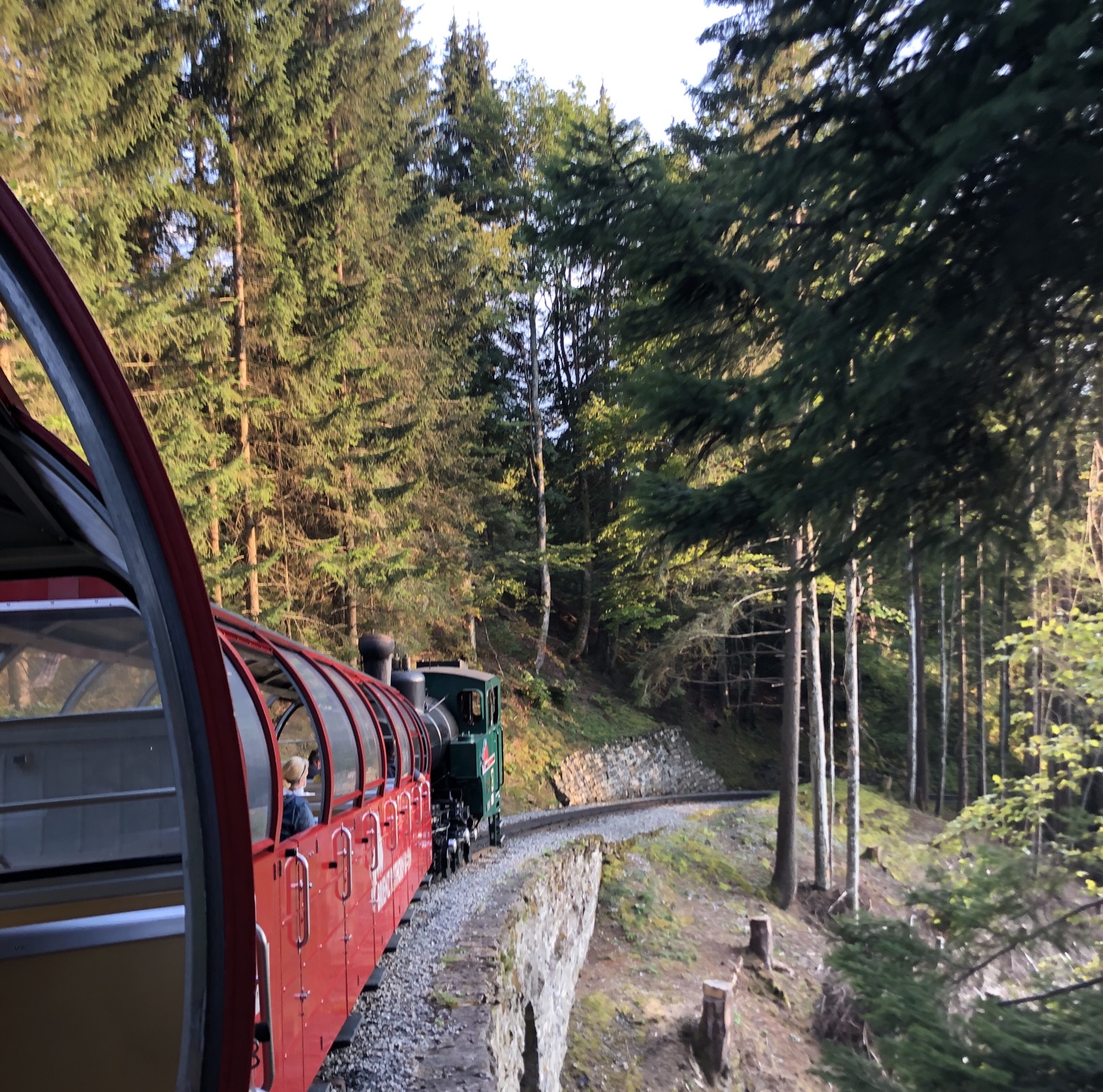 Auf die Sekunde pünktlich erhält unser Zug vom Bahnhofsvorstand mit der Kelle das Abfahrtssignal. Kurzum haben wir das Dorf verlassen und steigen im Bergwald empor