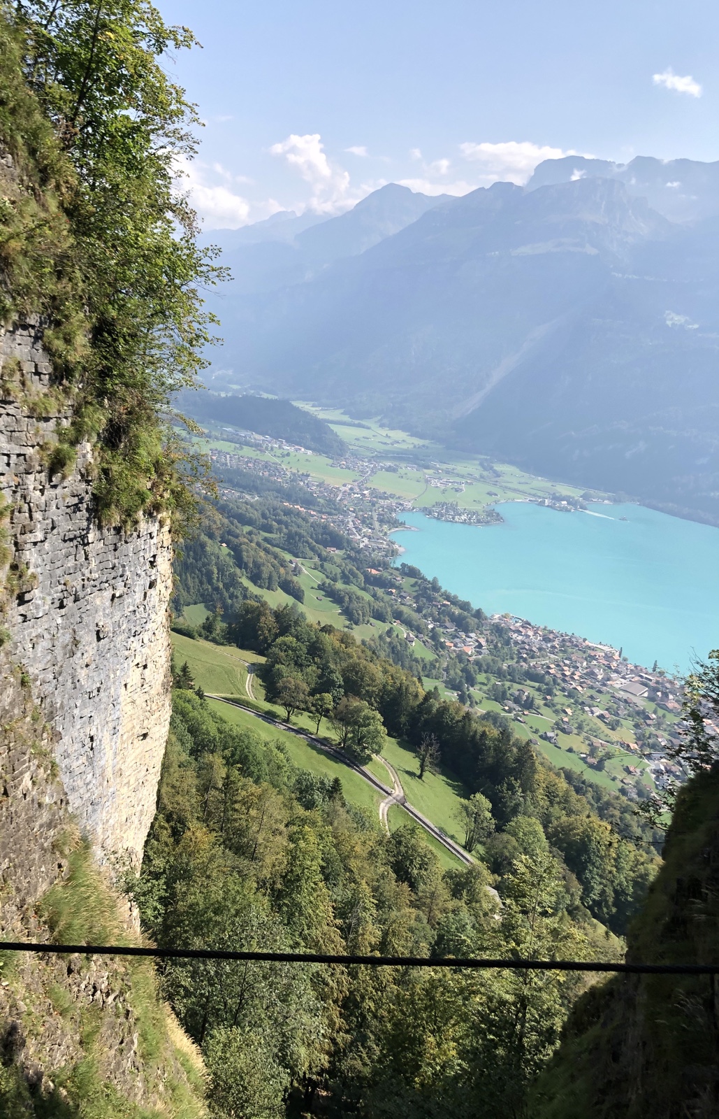 In der Bildmitte unten sehen wir vom 3, Tunnelfenster aus runter auf die Kreuzungsstation Geldried, das Dorf Brienz, den Brienzersee, den Ballenberg, das Aaretal und die Berge.