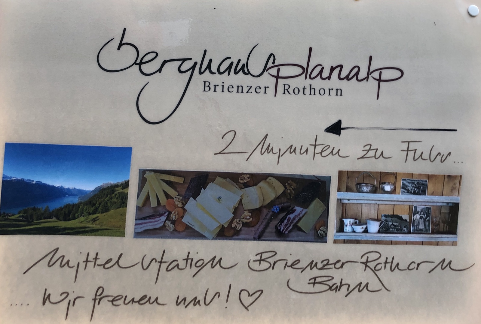 Ein neues Hinweisschild zum Berghaus verspricht einen 2 Minuten Spaziergang. Allerdings ist mir nicht ganz klar, wie die zwei Frauen, die das Berghaus seit dieser Saison führen, den 350 Meter kurzen Weg in nur 2 Minuten spazieren können.