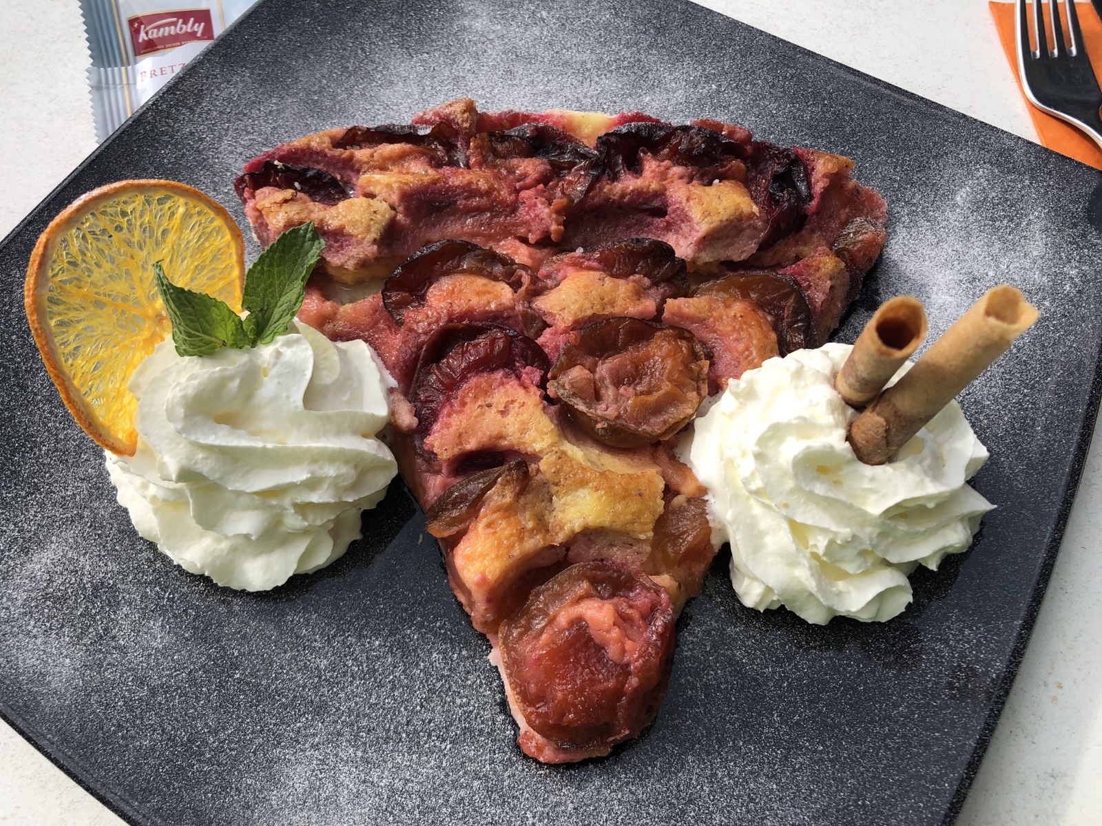 Also mache ich einen Halt in der Waldegg. Das Restaurant mit Hotel liegt etwas abseits der grossen Hauptstrasse über den Pass. Ich setze mich draussen auf die Terrasse an die Sonne. Kurzum kann ich ein Stück herrlichen Zwetschgenkuchen und einen Kaffee geniessen.