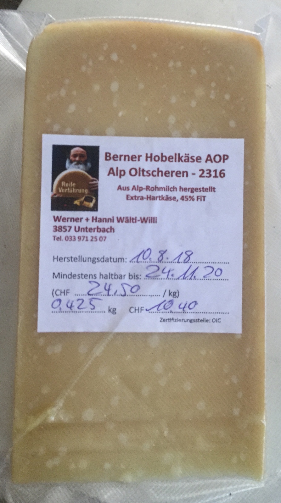 Mensch kann hier bei Werner + Hanni Wälti-Willi (033 971 25 07) den weitherum bekannten Käse von der Alp Oltscheren kaufen. Ich habe Glück: ich kann das letzte Stück 2018er Hobelkäse, produziert am 10. August 2018, erwerben. Erst kurz vor Weihnachten wird der 2019er Hobelkäse angeschnitten und in den Verkauf kommen.