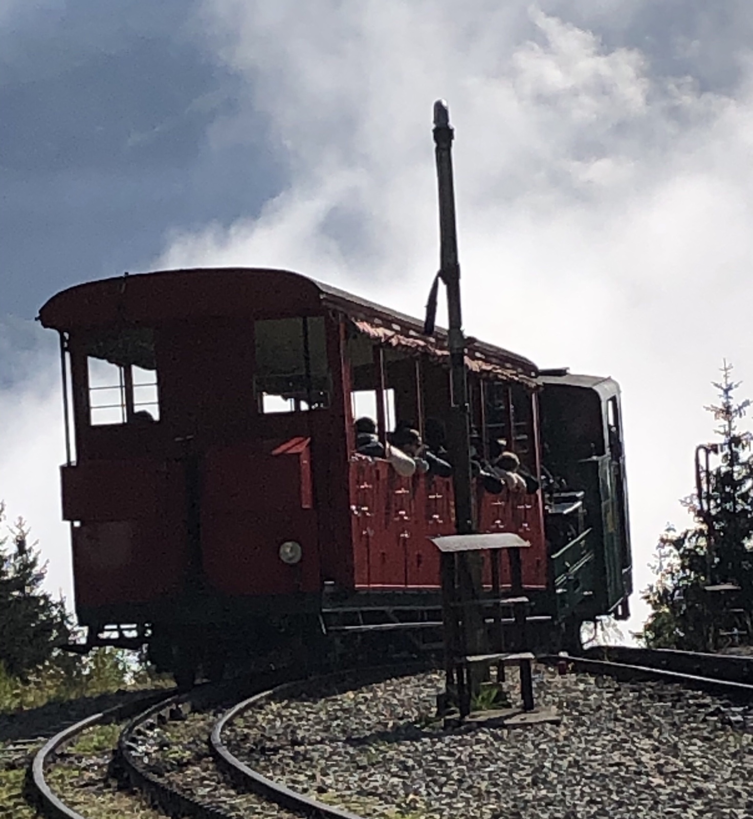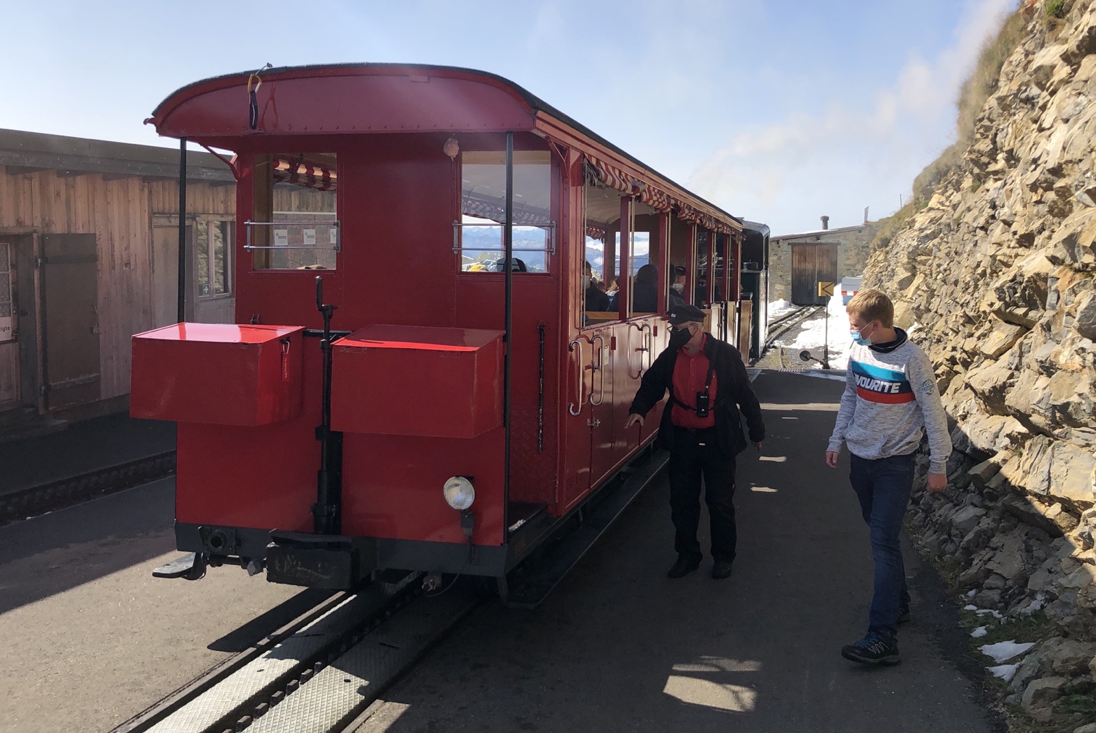 Diese sogenannt kleine Lok, aus der Zeit des Bahnbaus 1891 kann nur einen Wagen bergwärts schieben. Nach einer längeren Pause hier oben, fährt sie jetzt wieder runter.
