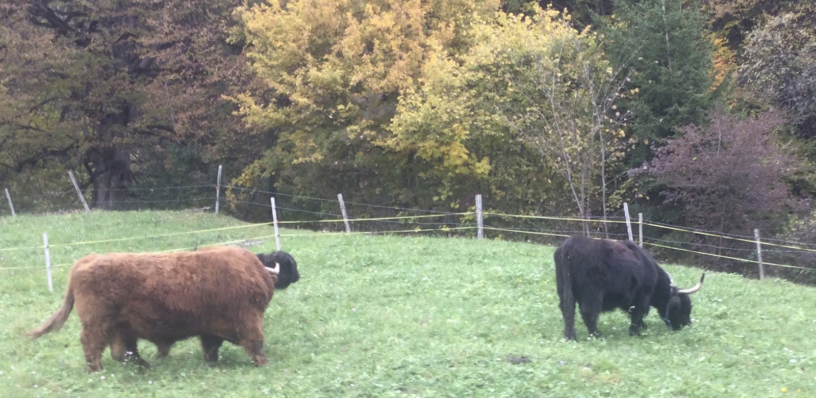 Im Park Weiden noch immer die schottischen Hochland Rinder. Weder eine schnaubende Dampflok noch das gellende, unnatürliche, neuzeitliche Pfeifen dieser Loks, kann diese Tiere aus der Ruhe bringen.