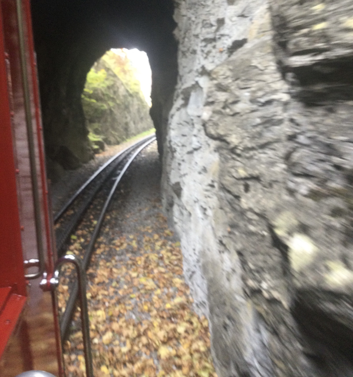 … folgt ein kurzer Einschnitt und der nur 19 Meter lange Schwarzenfluhtunnel. Wer knapp oberhalb des Tunnels, auf der Bergseite, aus den Wagen gen Nordwesten schaut, sieht ganz kurz den “Ausguss“ des Mühlebachfalls!