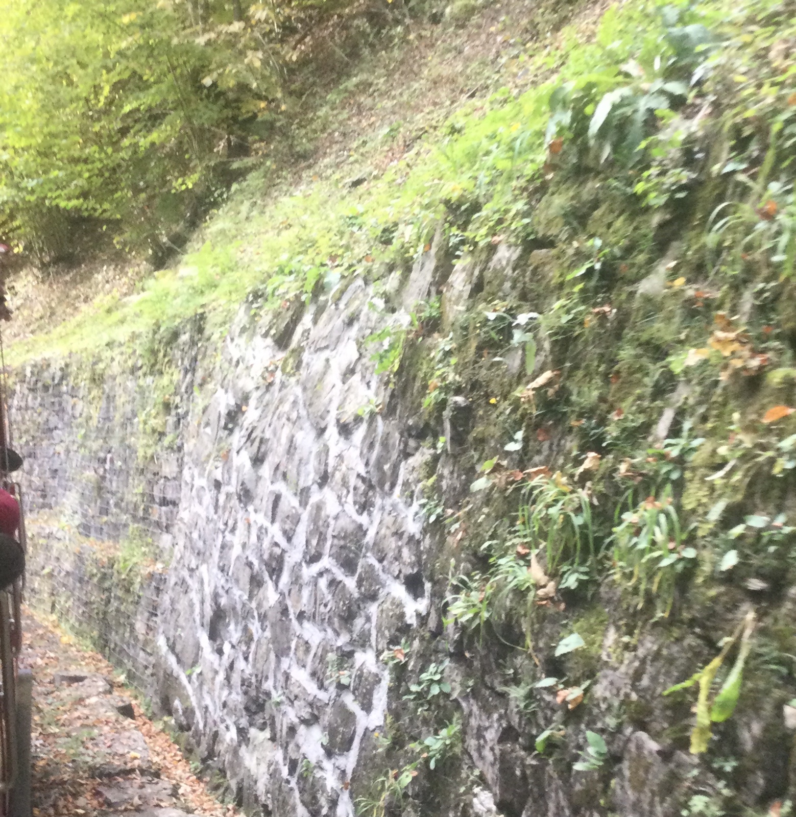 Früher bestanden die Verbauungen entlang der Strecke aus Bruchstein-Trockenmauern. Heutzutage werden sie allesamt mit Zement fixiert. Die alte Mauer hielt während über 125 Jahren dem Bergdruck stand; ich bezweifle, dass die neu zementierte Mauer während der Hälfte der Zeit der bisherigen Trockenmauer steht.