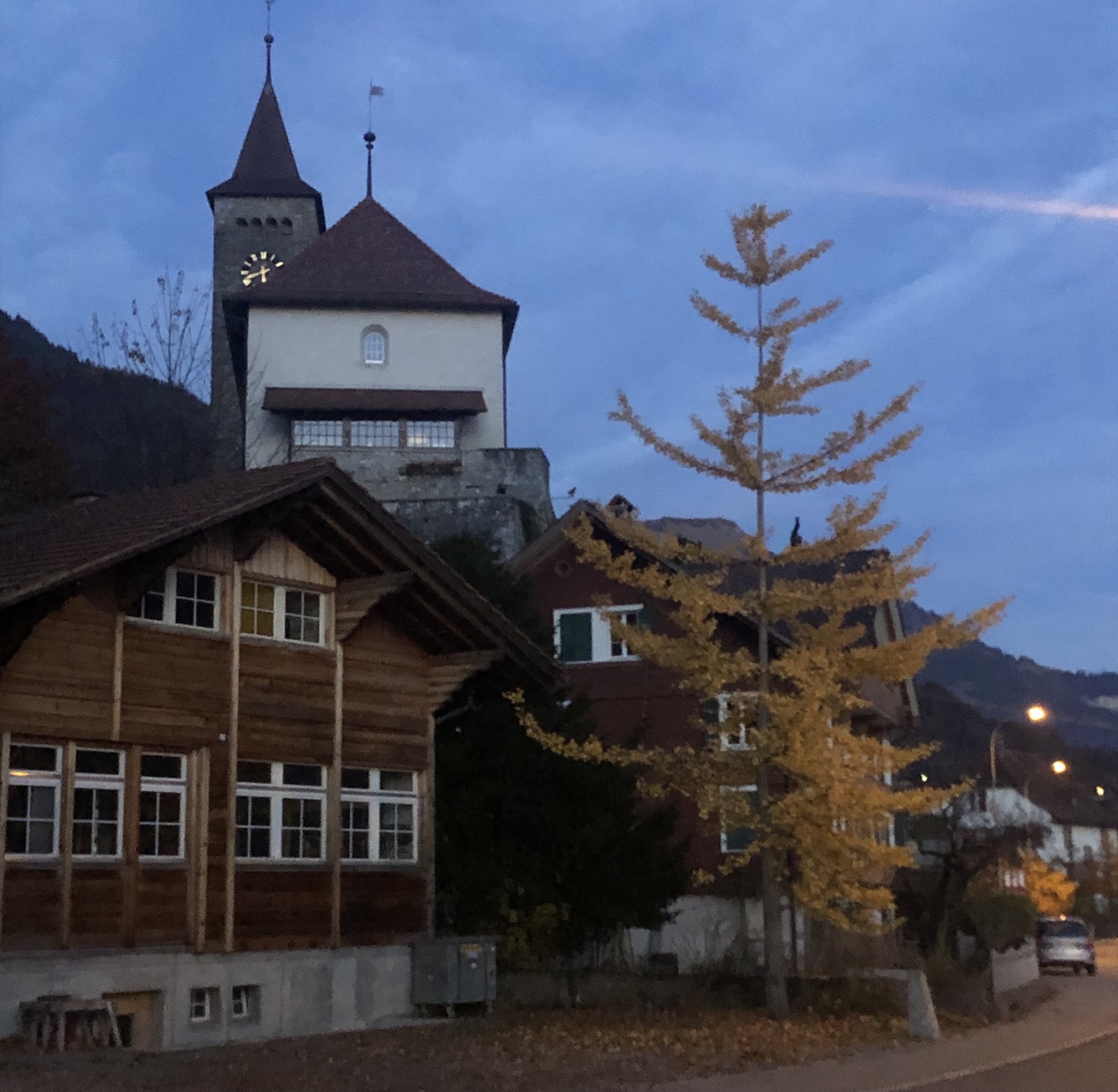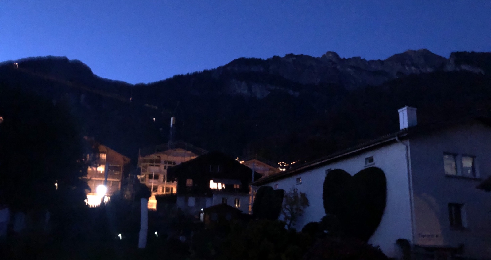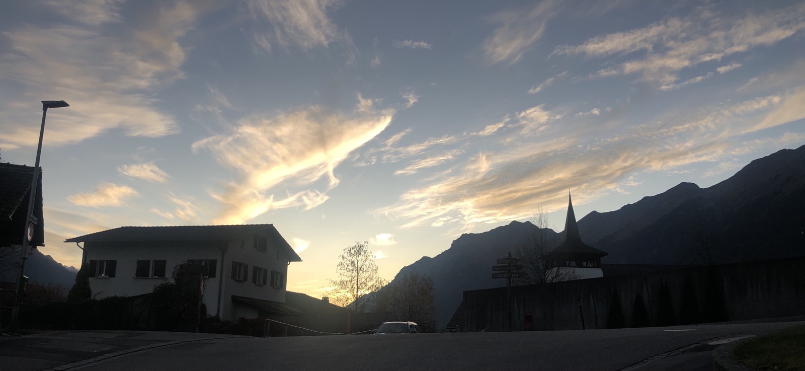 Die Schneeberge im Osten sind schon abweisend kalt. In Dorf brennen schon die ersten Lichter.