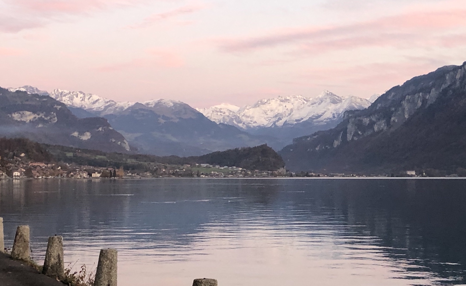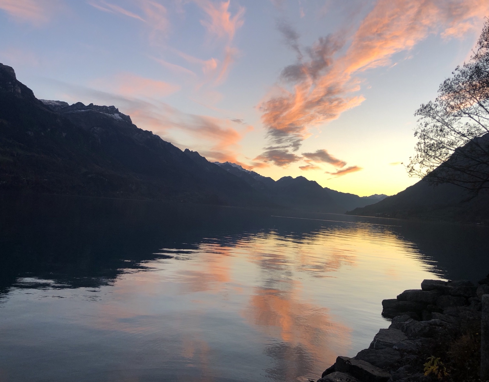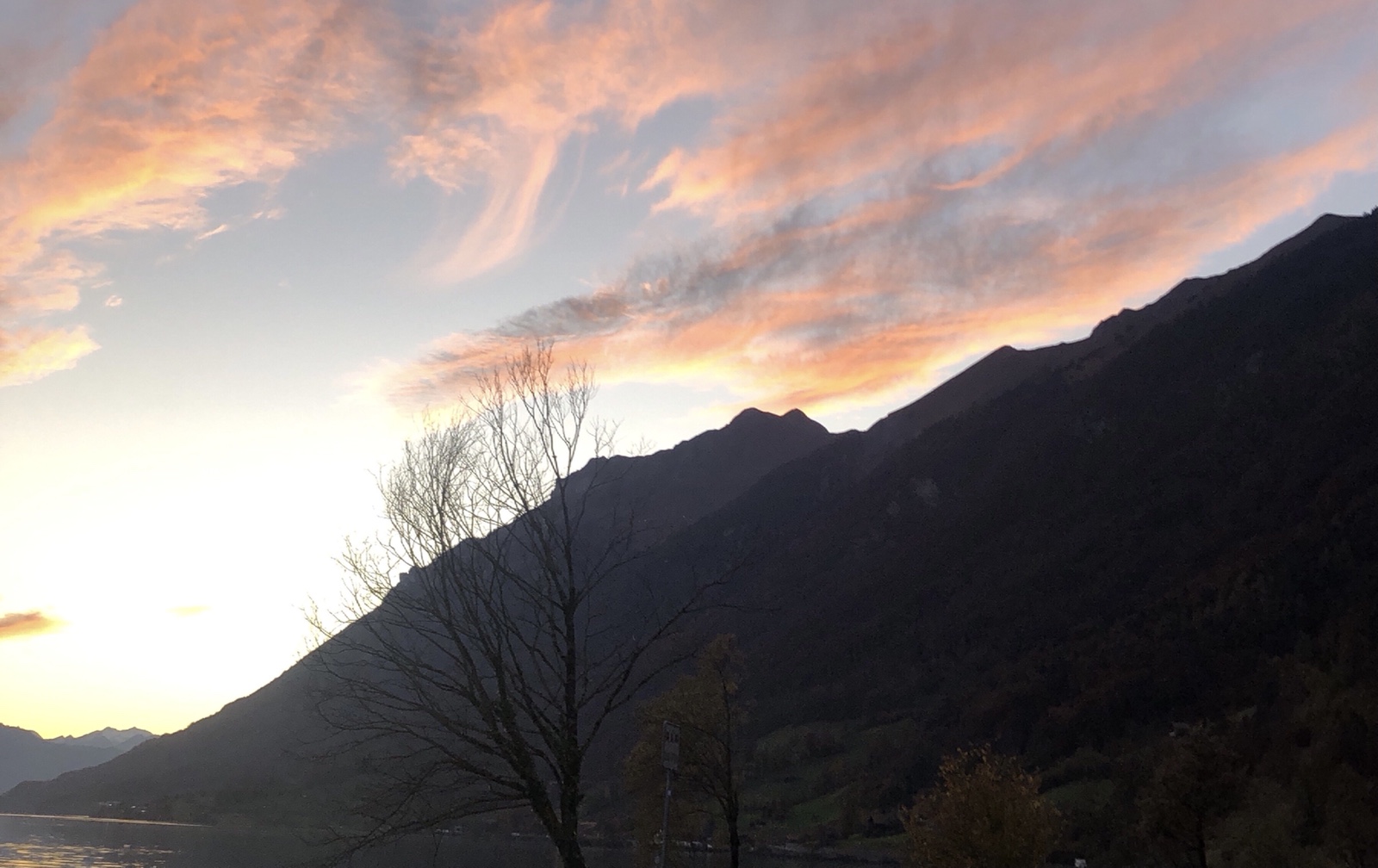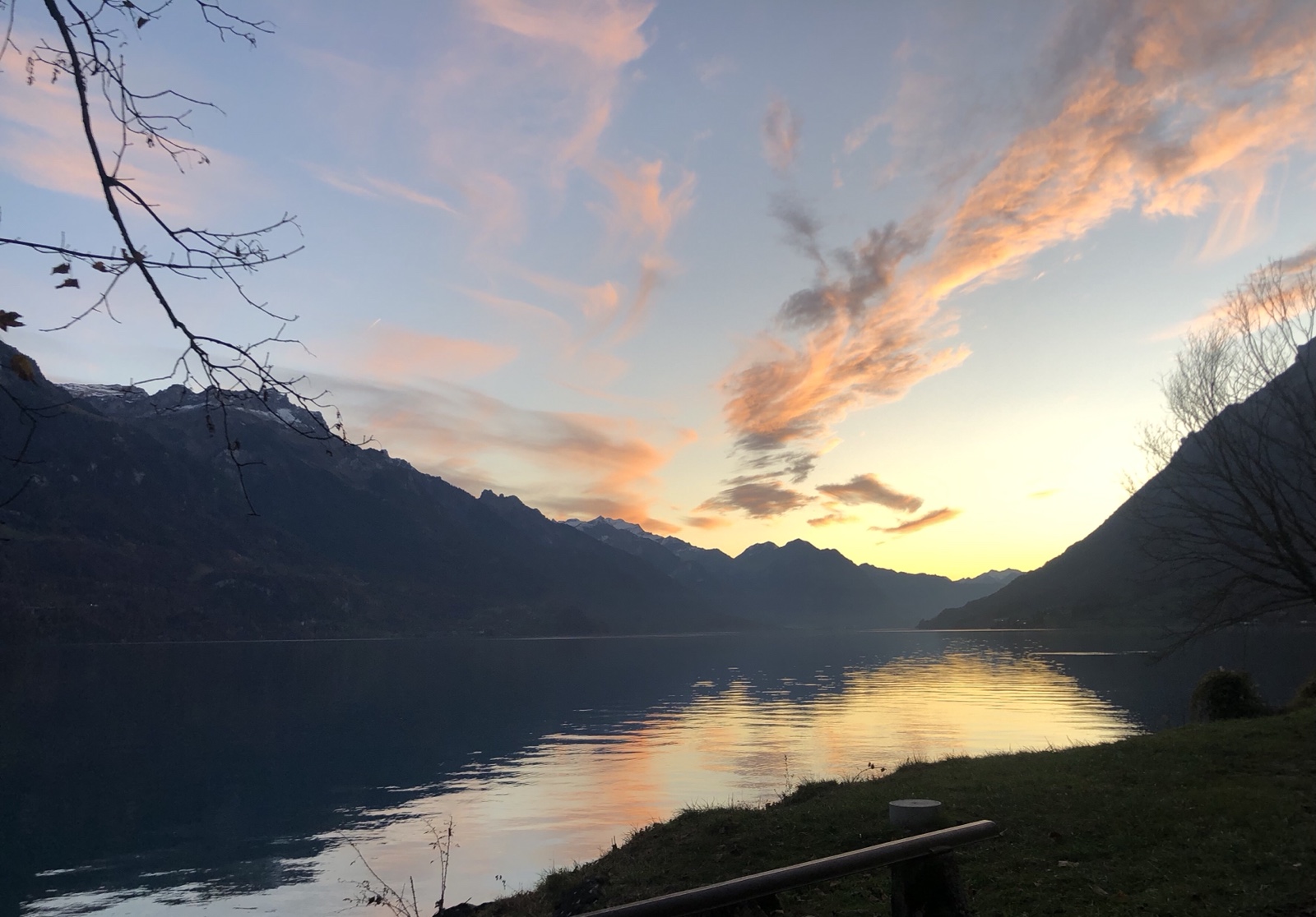 Ich weiss gar nicht wohin ich gucken soll. Am Himmel leuchten gegenwärtig überall ‚Glutnester‘. Die Berge scheinen grösstenteils schon dunkel, nur die Gletscher leuchten noch zart rosa