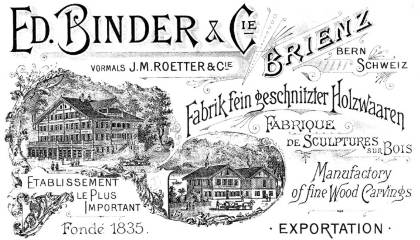 Die Manufaktur der Ed. Jobin AG, an der Hauptstrasse 111 hier in Brienz, war für mich in frühester Kindheit der Inbegriff einer Schnätzi. Die Firma wurde 1835 gegründet von einem Ed. Binder. 1900 wurde dieses Gebäude gebaut. 1926 starb Ed. Binder und sein Schwiegersohn Ed. Jobin übernahm die Firma, die auch heute noch von einem Jobin der 5. Generation geführt wird.