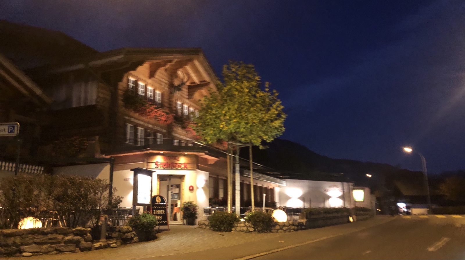 Auf der Terrasse des Giessbach-Hotels brennt Licht. Heute Abend wird wohl der Abschluss der Saison 2021 gefeiert.