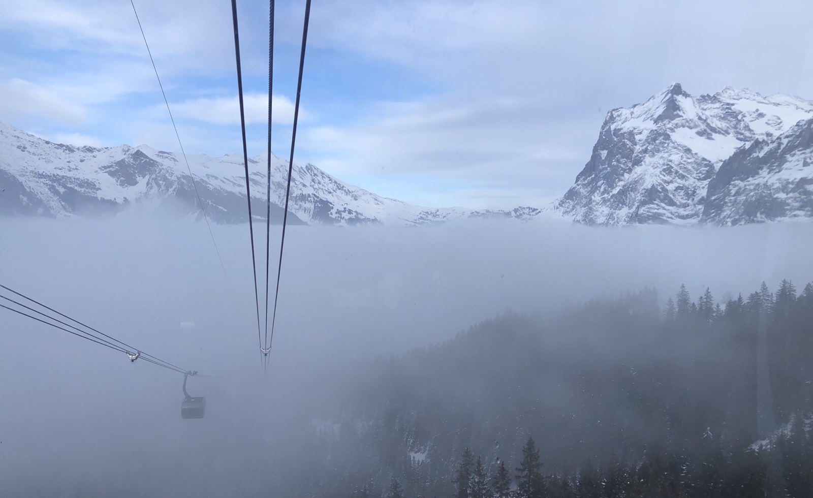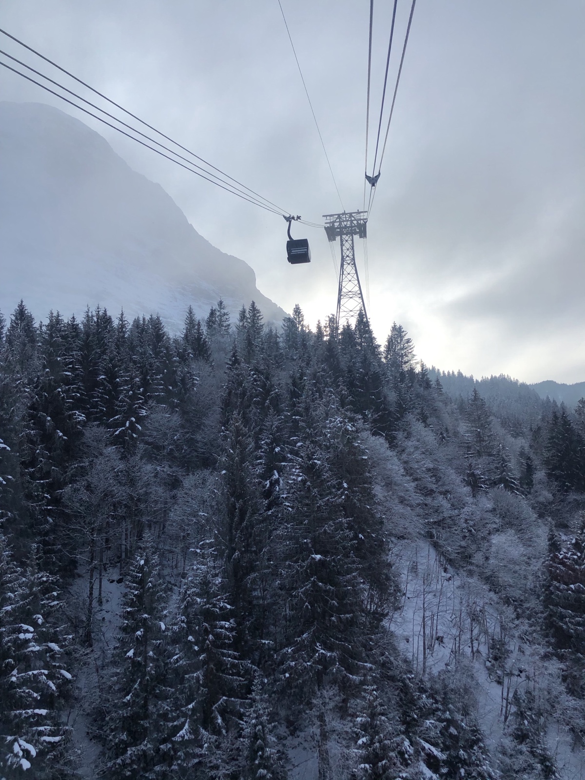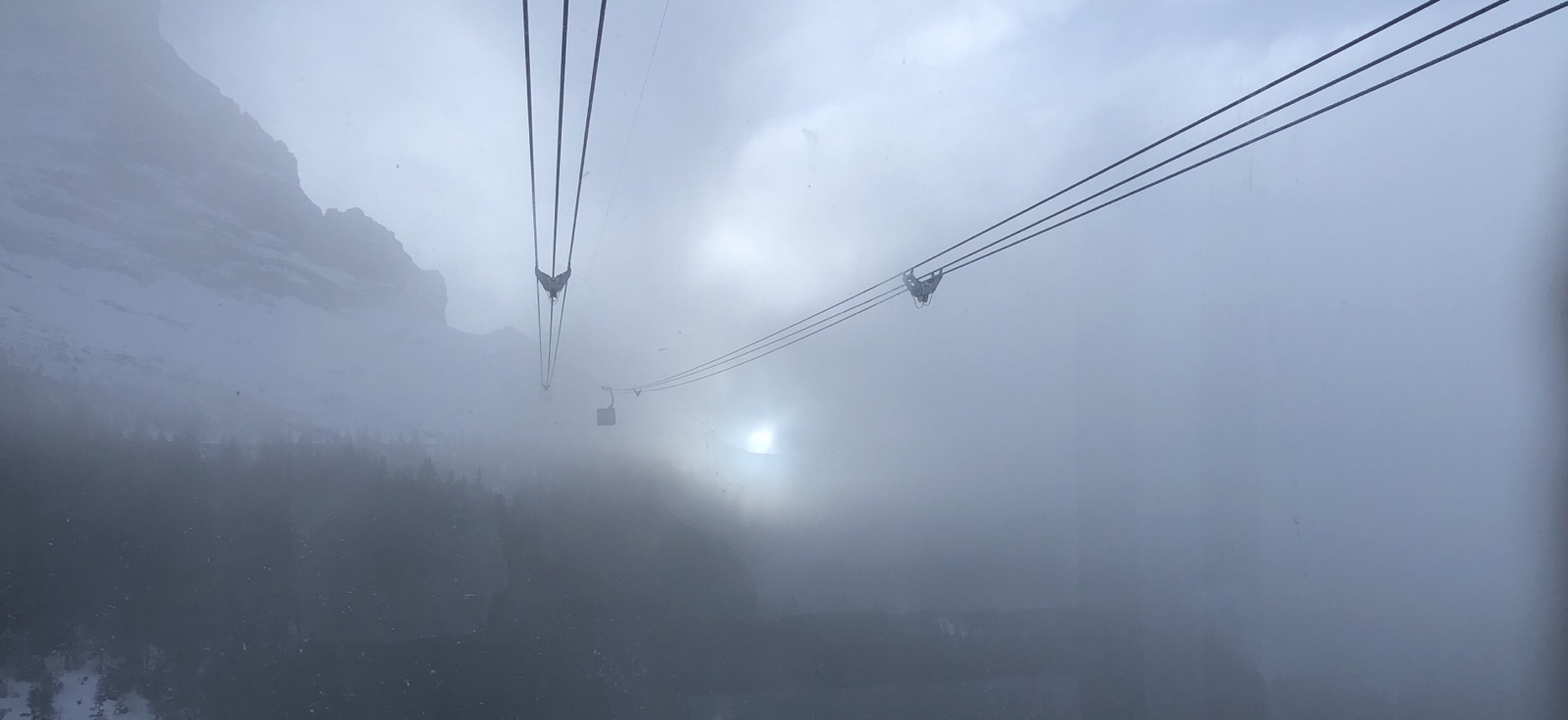 Knapp 6.5 Kilometer lang ist die 3S-Luftseilbahn. Sie überwindet dabei 1’385 Höhenmeter. Nebelfetzen streichen um die Gondeln herum.