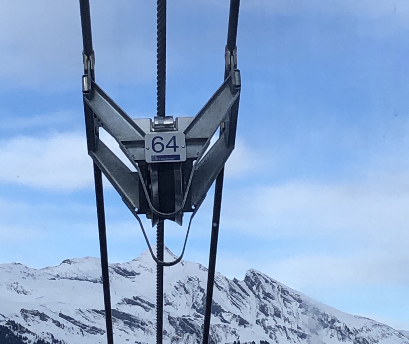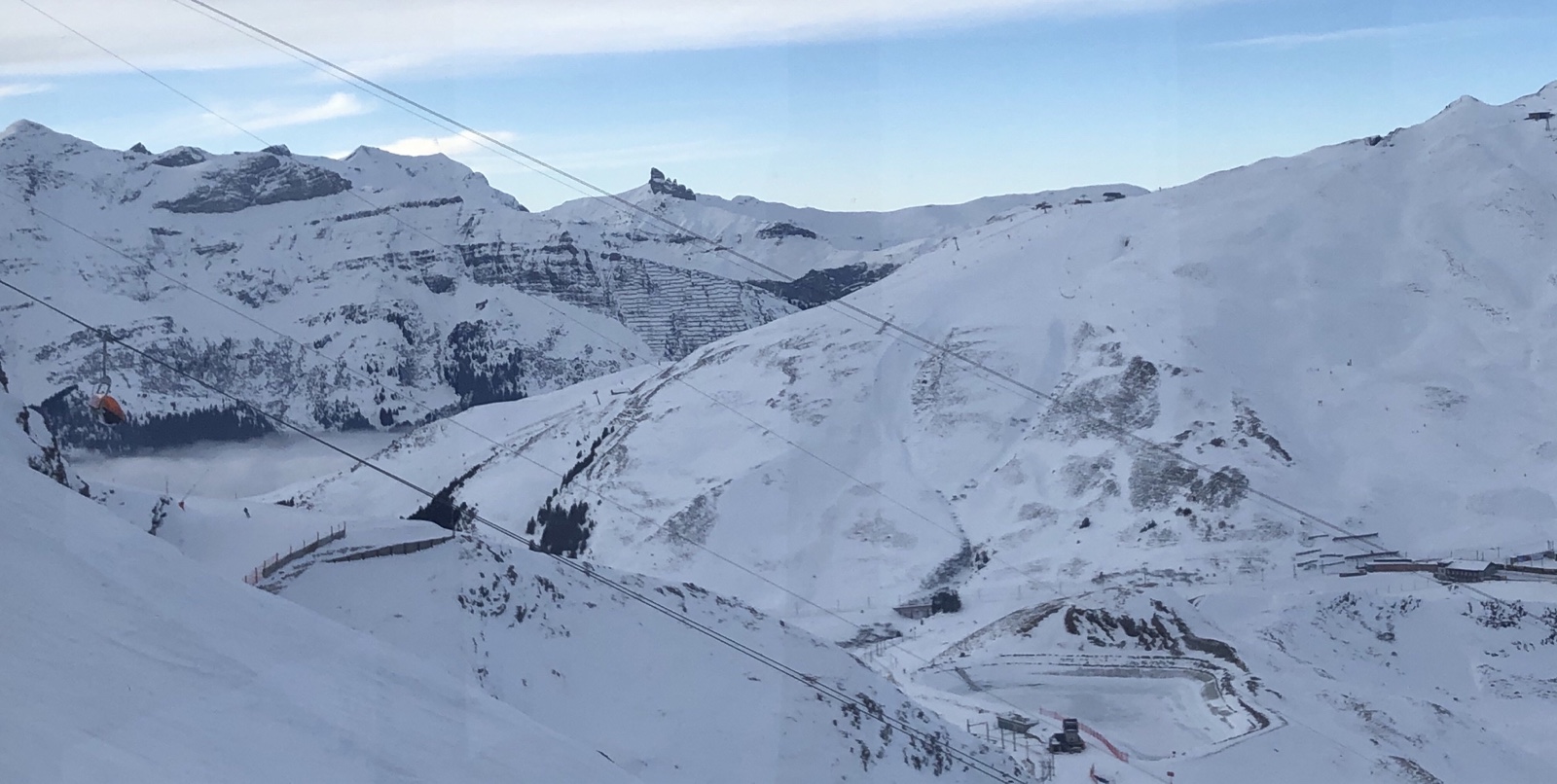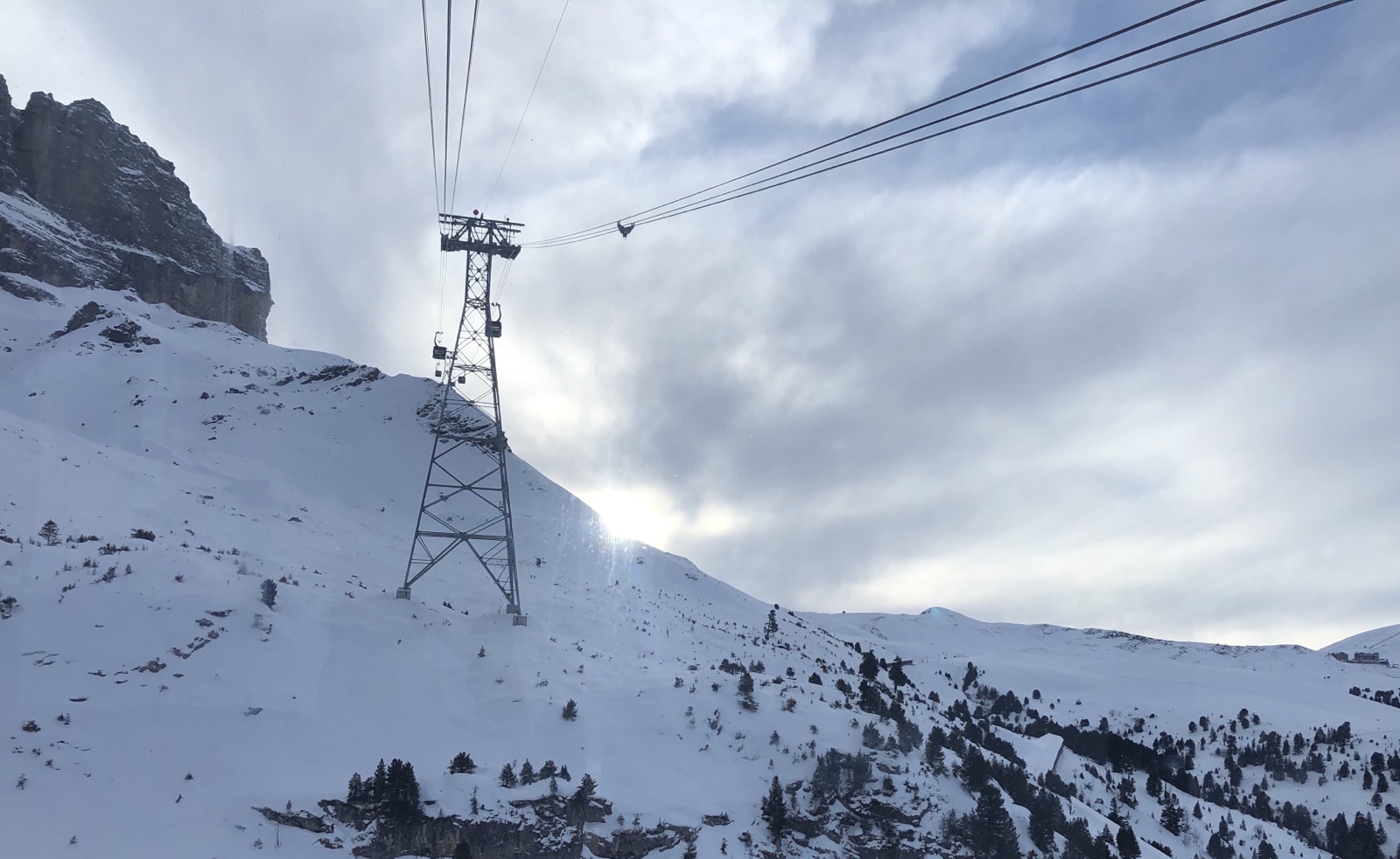 Knapp 6.5 Kilometer lang ist die 3S-Luftseilbahn. Sie überwindet dabei 1’385 Höhenmeter. Nebelfetzen streichen um die Gondeln herum.