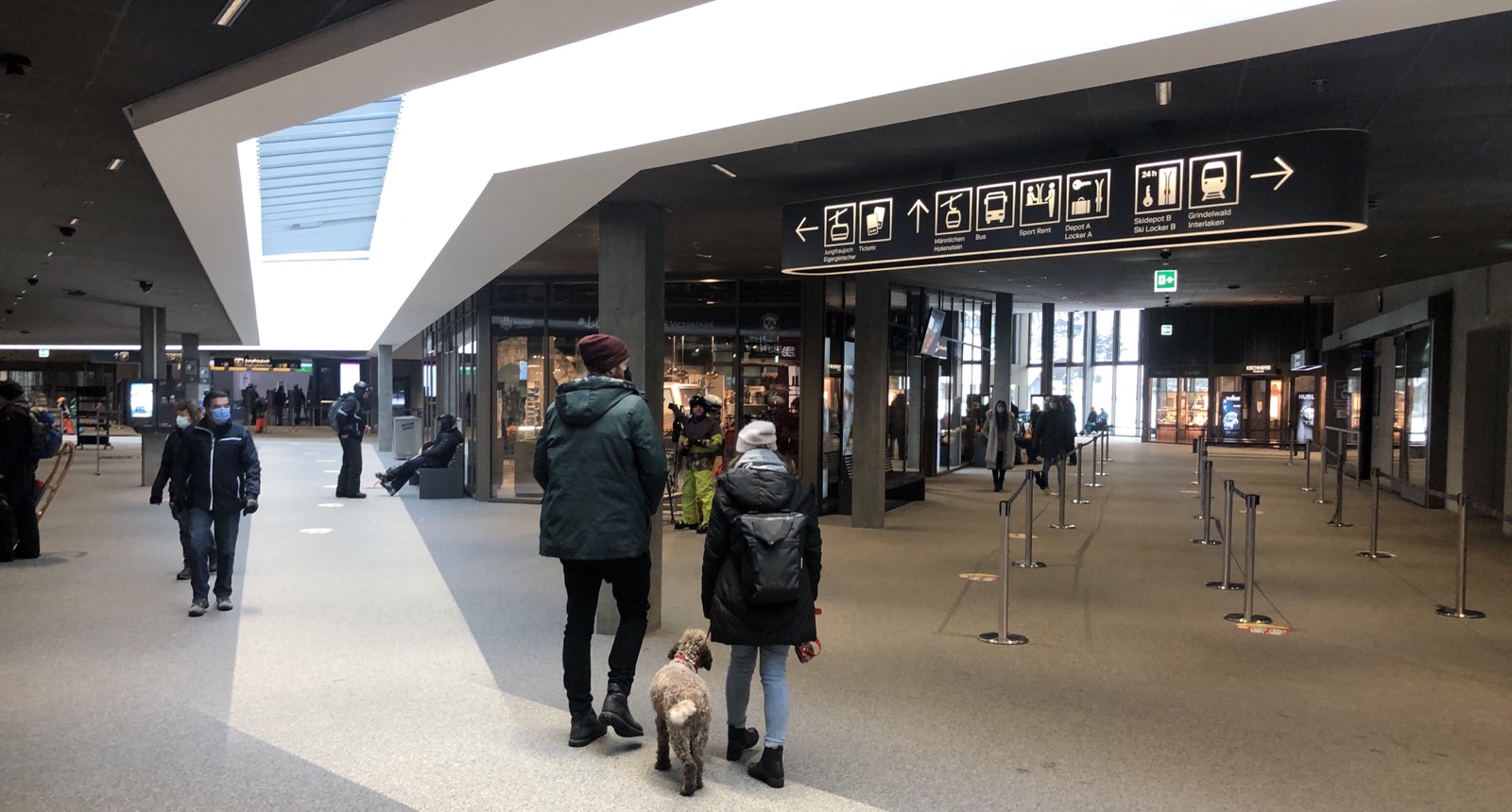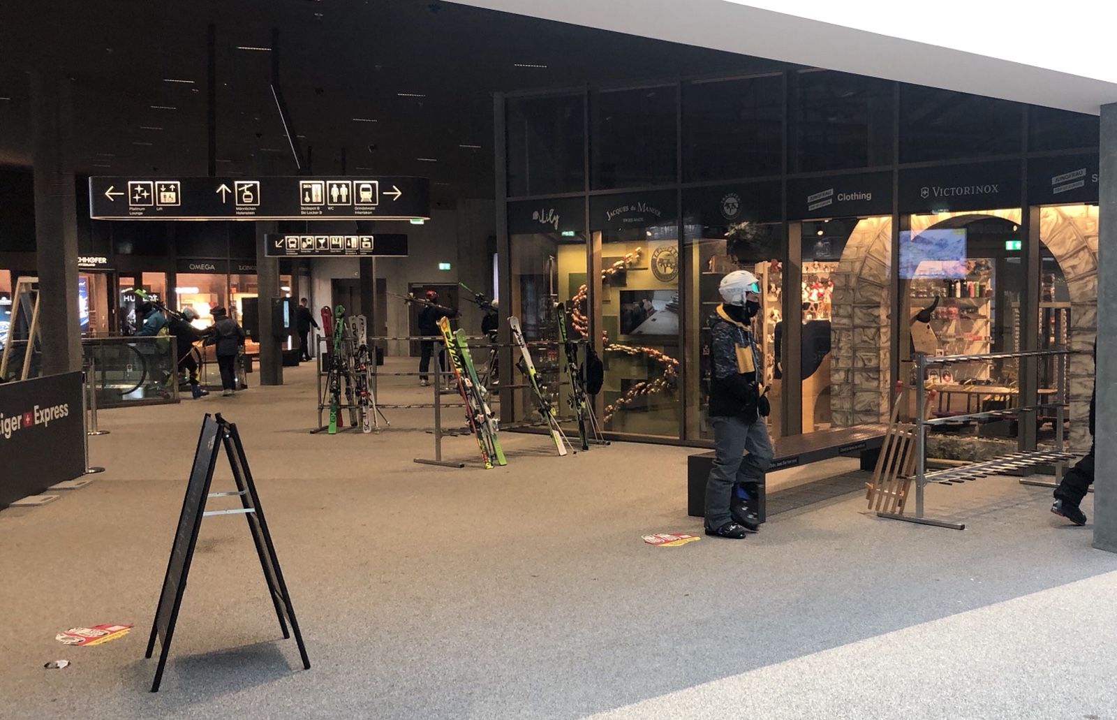 Buvetten und Nudelshops hier oben sind geöffnet, nicht aber bediente Gaststätten Allerdings ist nur der Corona bedingte «ausser Haus» Konsum erlaubt. So kommt es, dass unzählige Sportler auf den Böden der Bahnhofshalle und auf Treppen sitzen und hier Erholungspausen machen undoder ihr Mittagessen einnehmen.