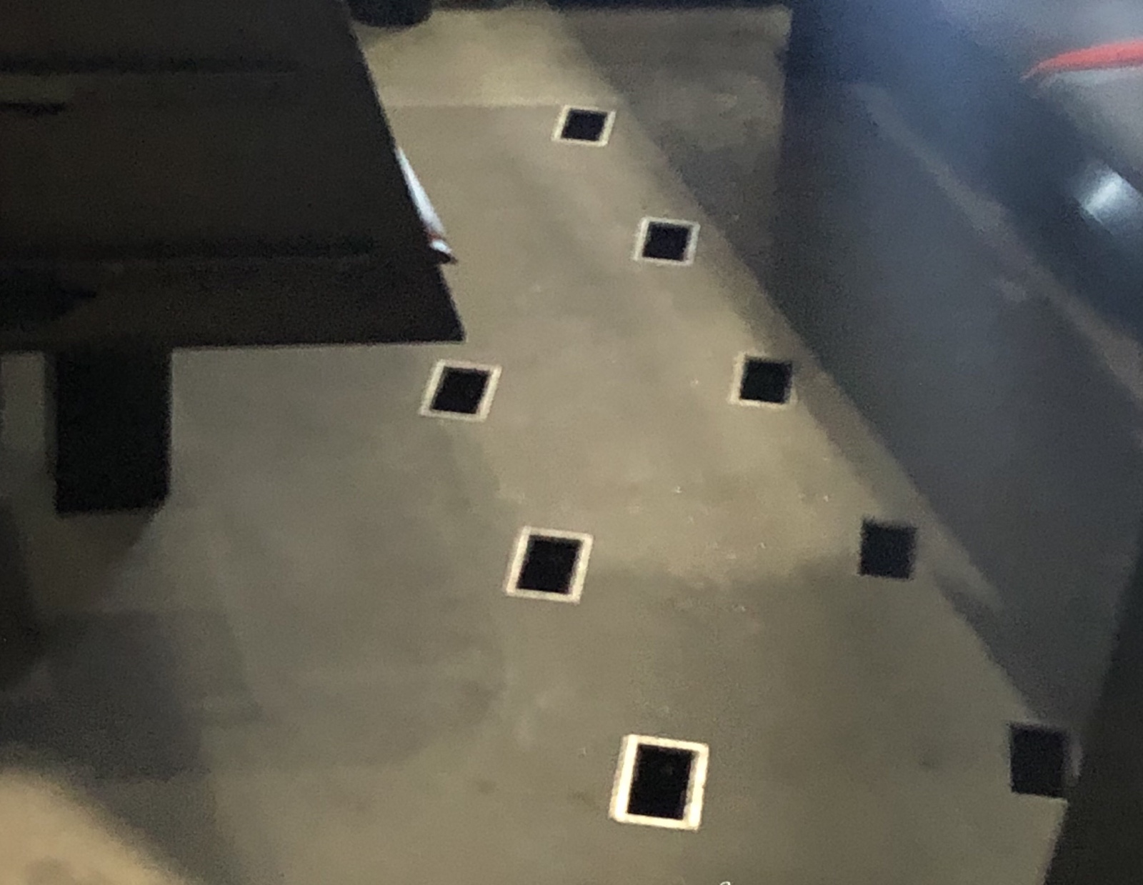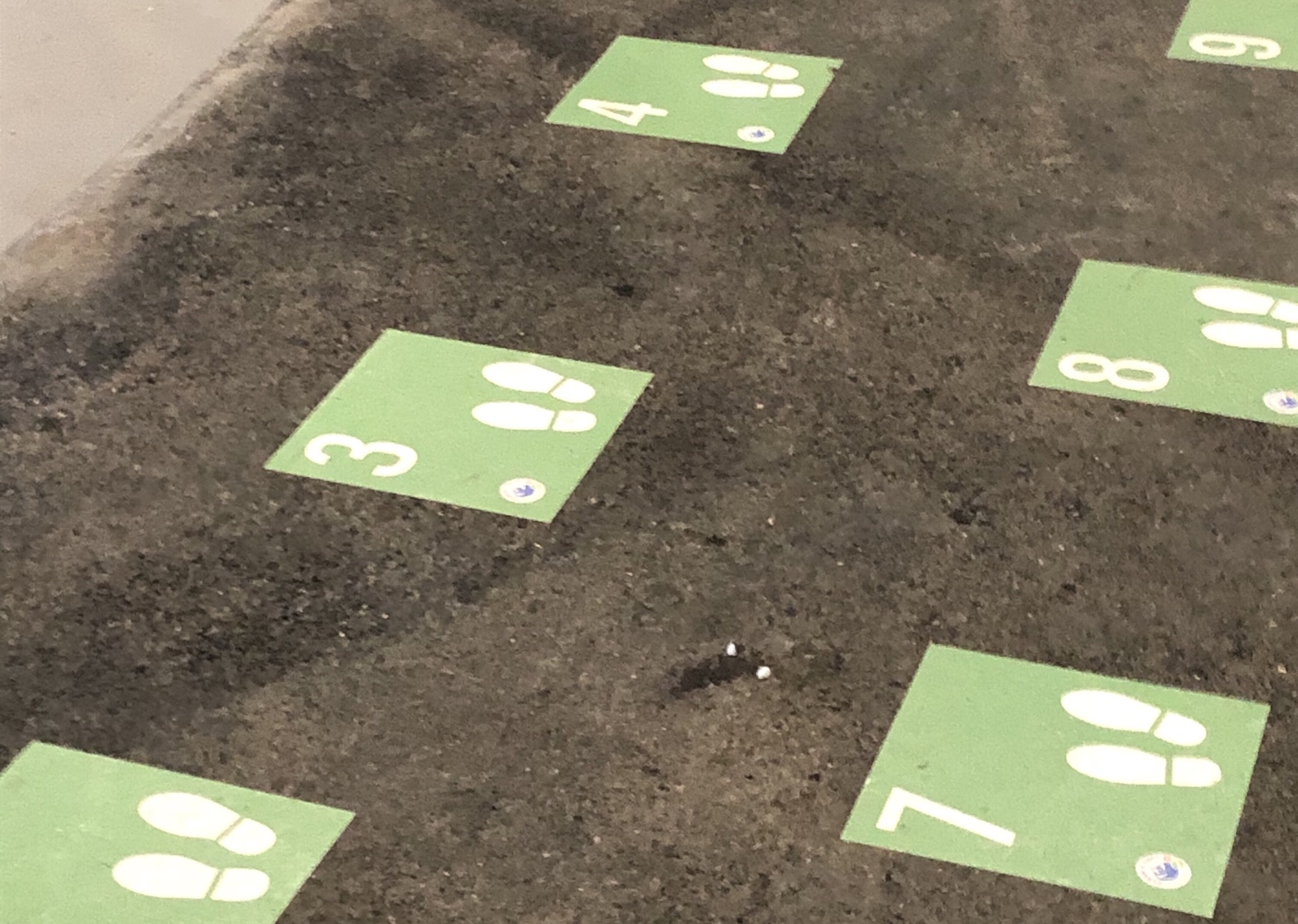 Der Einstiegsbereich vor der Gondel ist klar markiert. Bodenmarkierungen zeigen, leider aber wenig Corona konform, wie Menschen sich aufzustellen haben, um in die langsam vorbei fahrenden Gondeln einzusteigen.