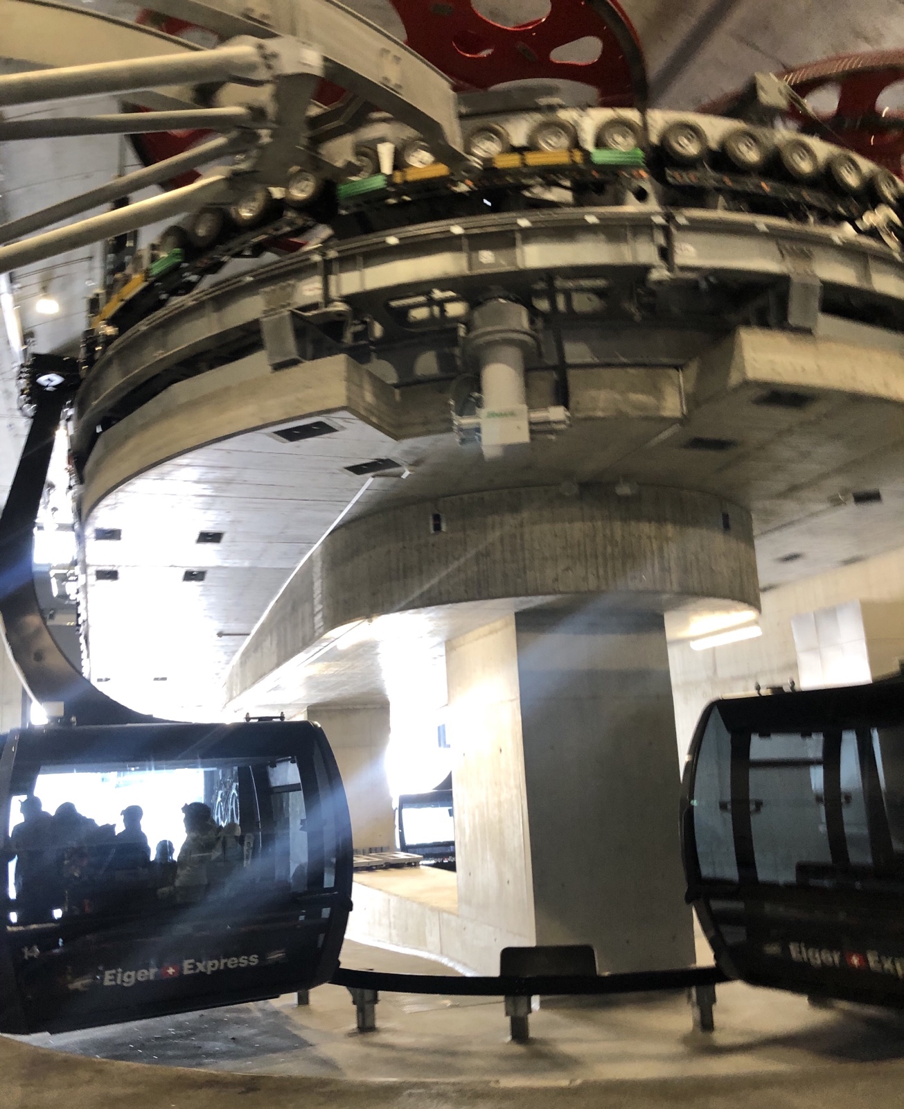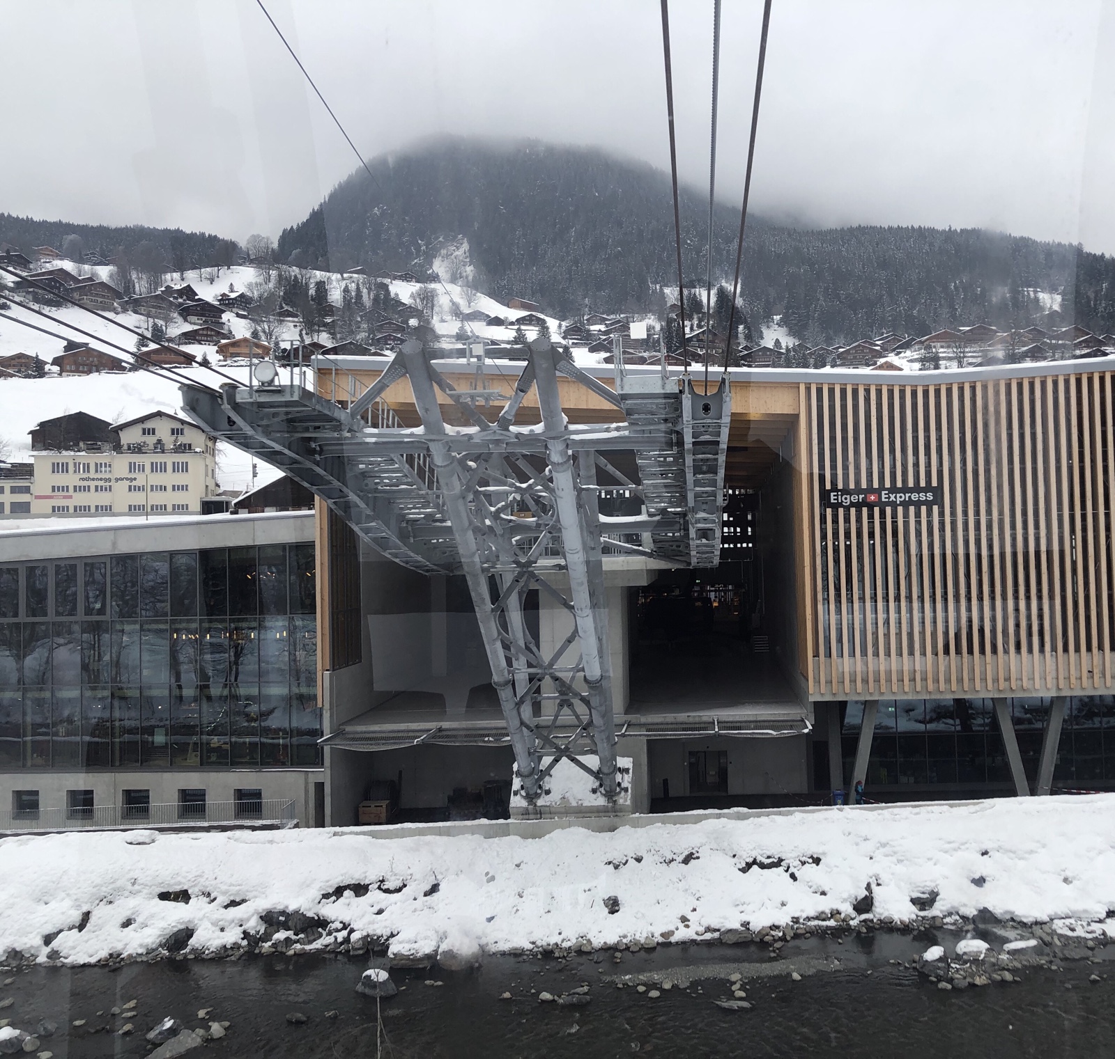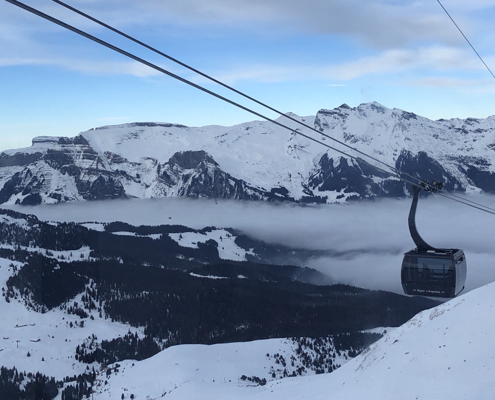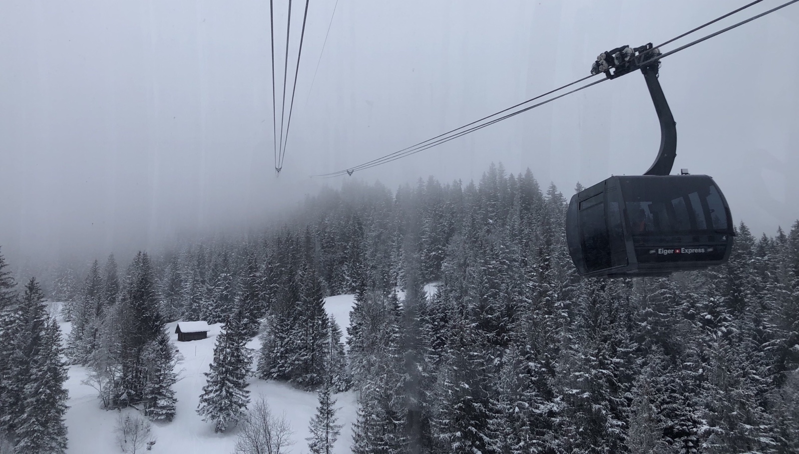 Rechts raus fährt die 10er Gondelbahn auf den Männlichen; im Hintergrund sieht Mensch die Gondeln des Eiger Express