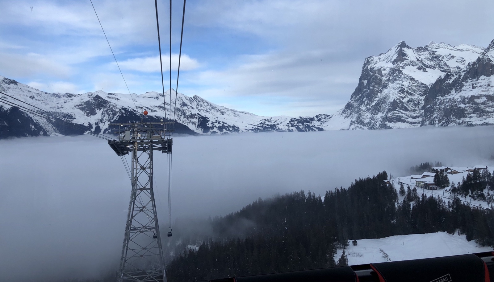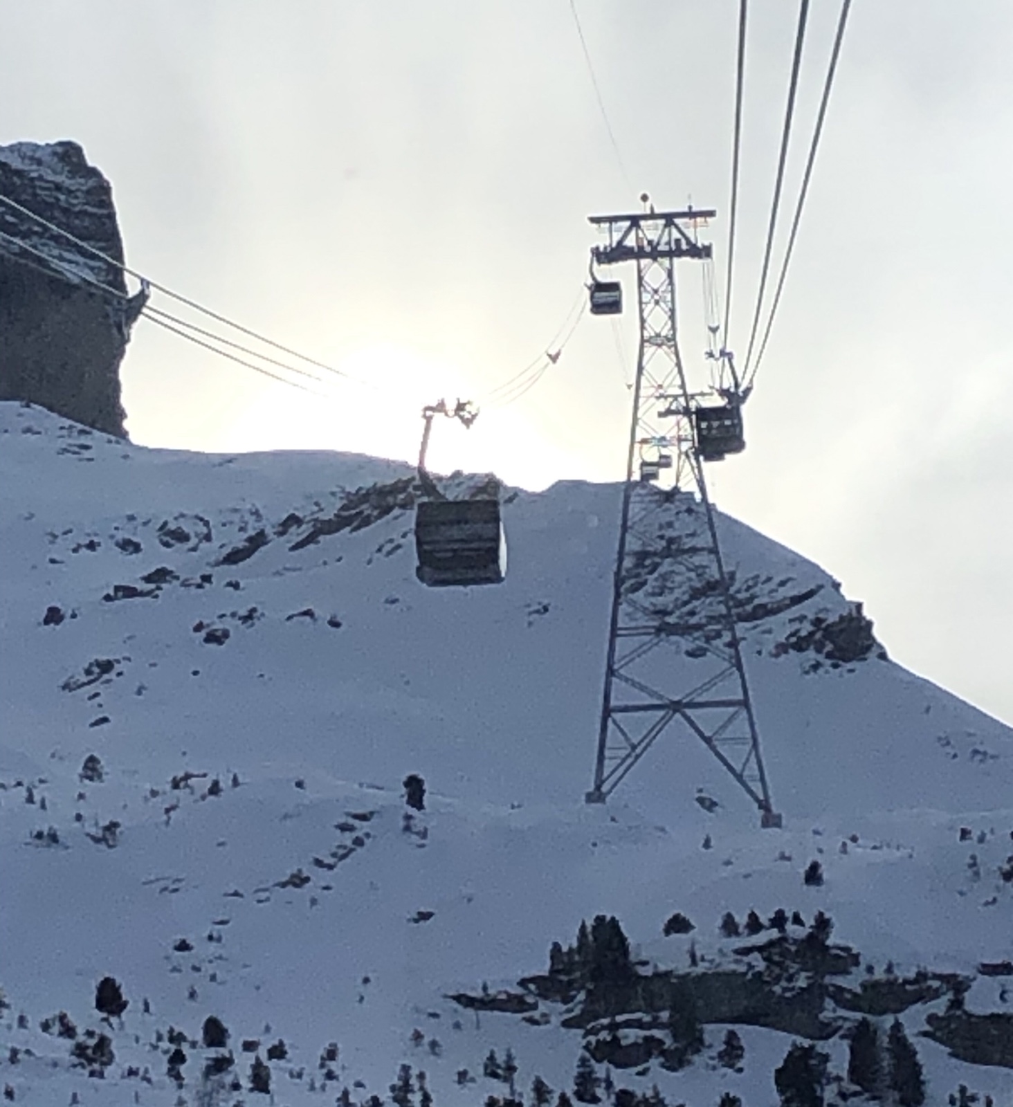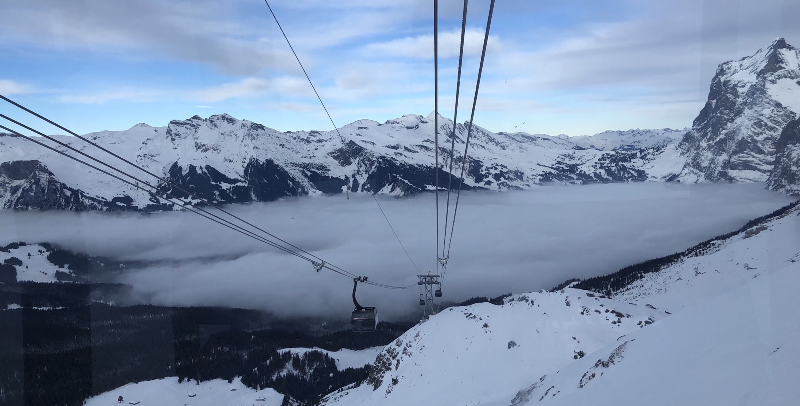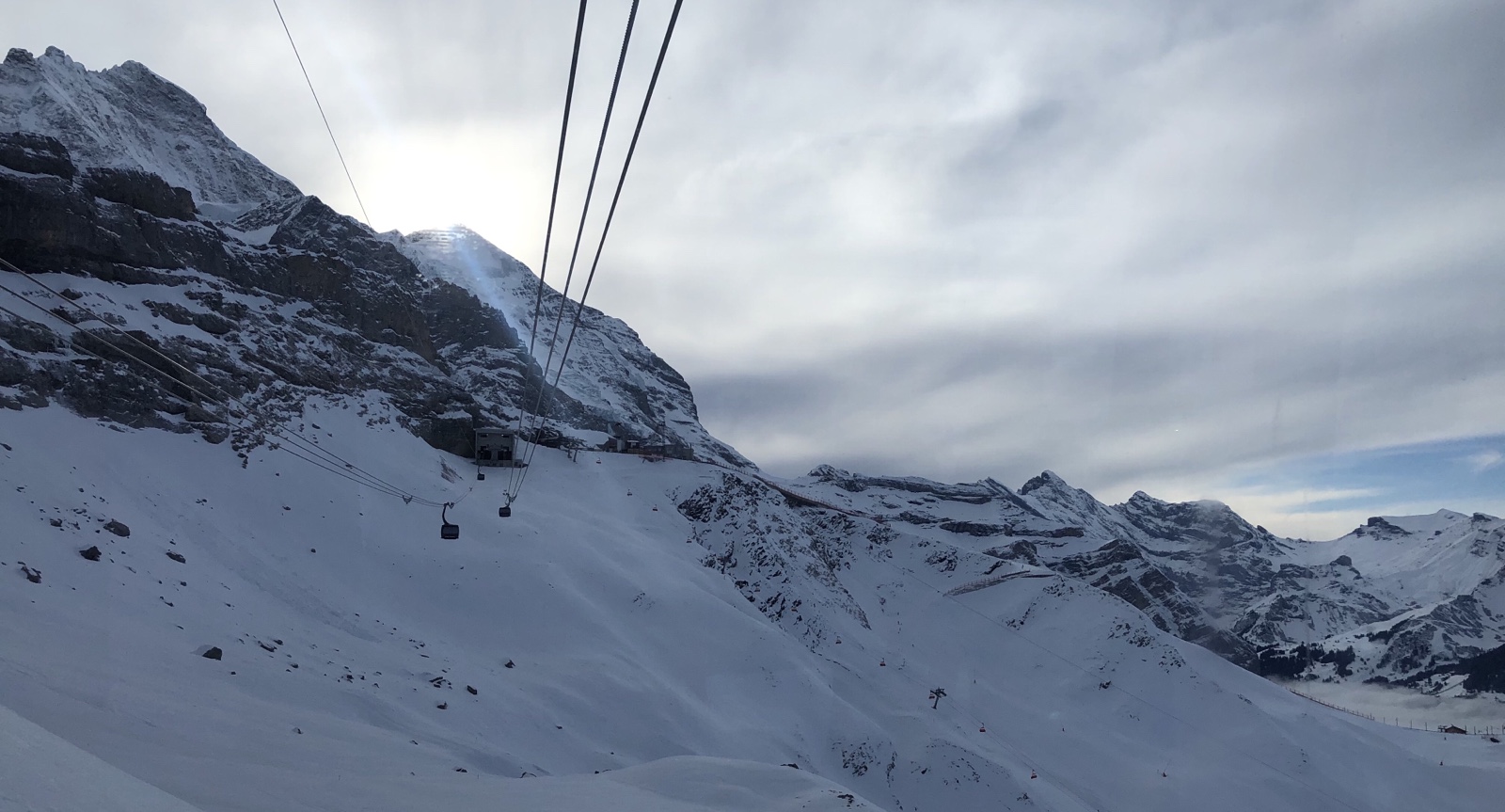 Rechts raus fährt die 10er Gondelbahn auf den Männlichen; im Hintergrund sieht Mensch die Gondeln des Eiger Express