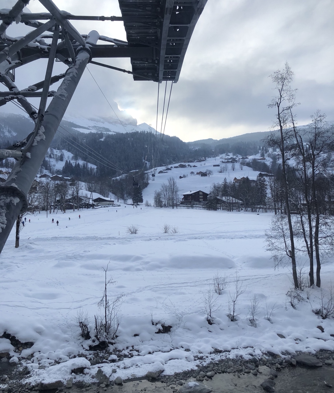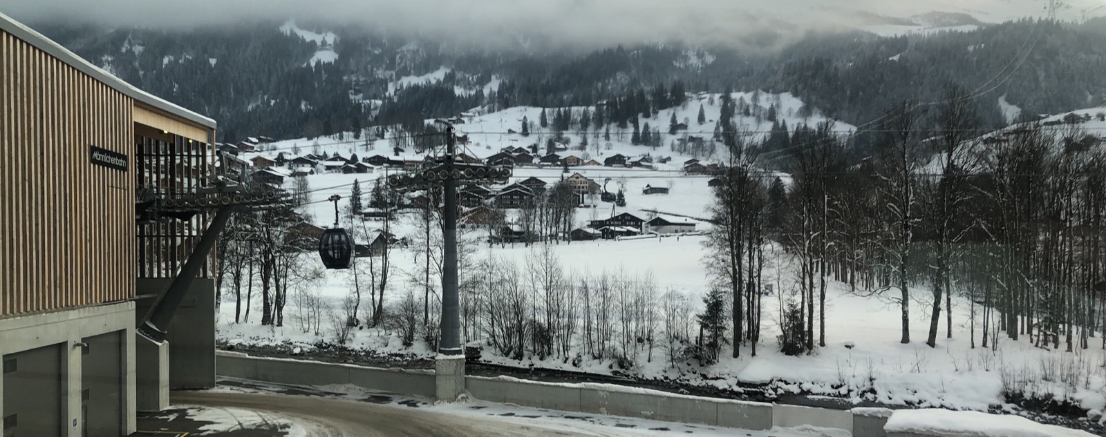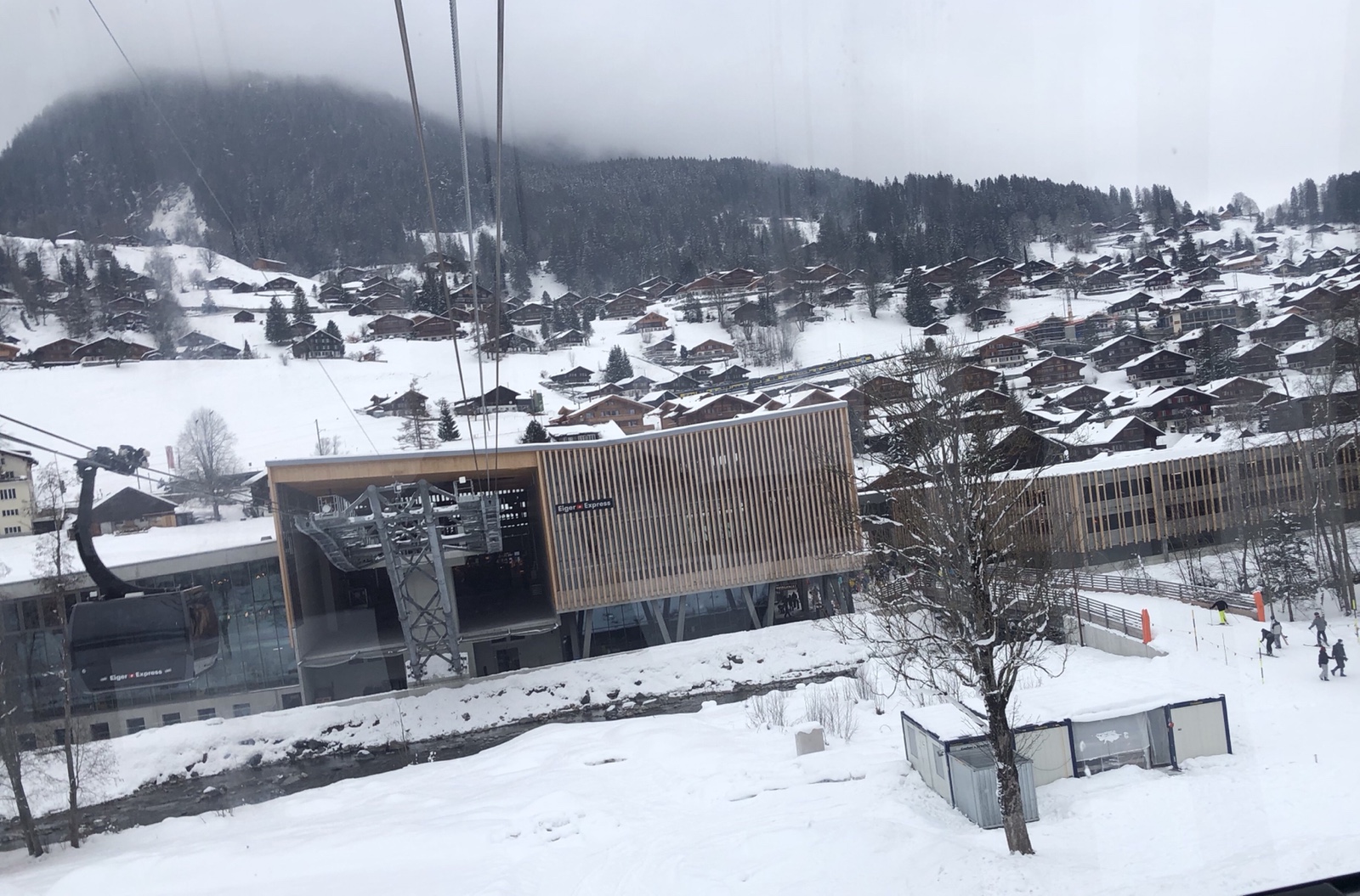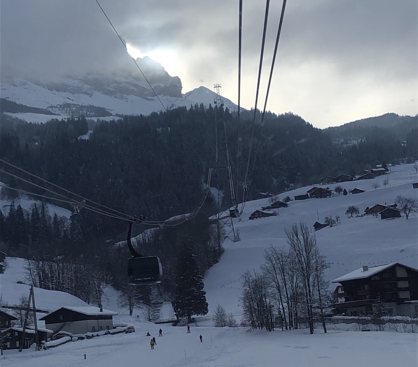 Rechts raus fährt die 10er Gondelbahn auf den Männlichen; im Hintergrund sieht Mensch die Gondeln des Eiger Express