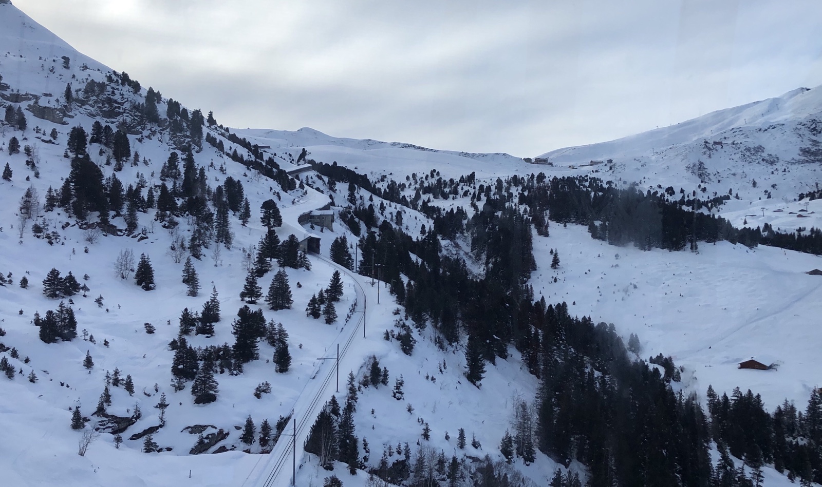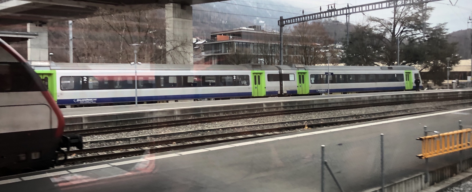 Ein Dutzend WintersportlerInnen nimmt neben beziehungsweise hinter mir Platz. Mehr als zehn Mitreisende starren die ganze Fahrt lang auf den Bildschirm ihres Mobilfons und haben kein Interesse für die Landschaft oder ihre Mitreisenden. Mehrere der ausnahmslos jüngeren Leute haben ihre Skischuhe selbstverständlich auf leere Polster ihnen gegenüber ausgestreckt.
