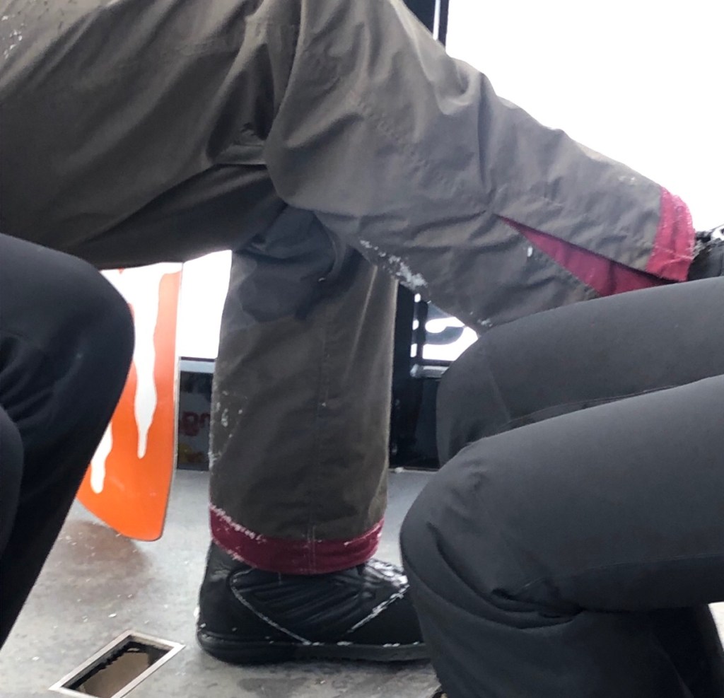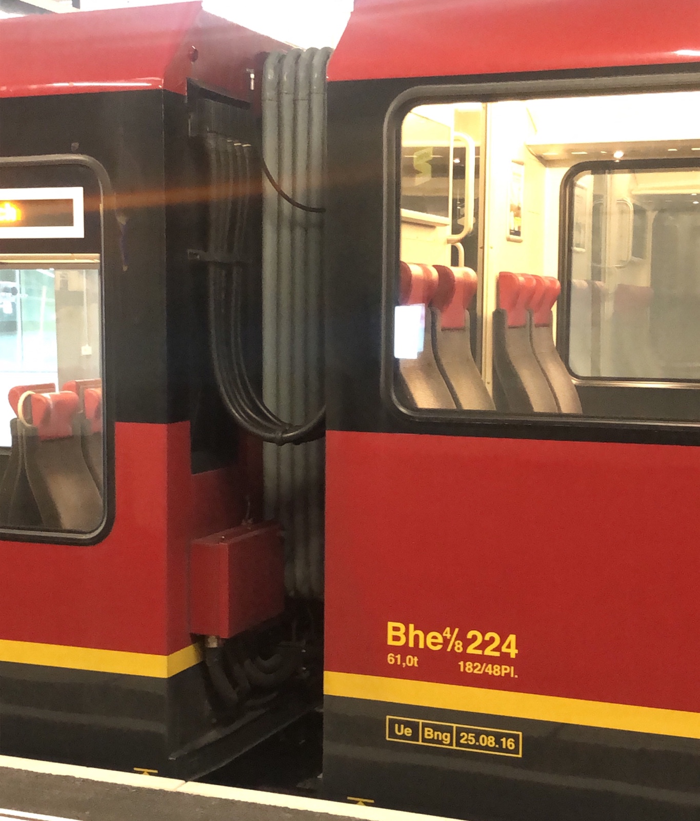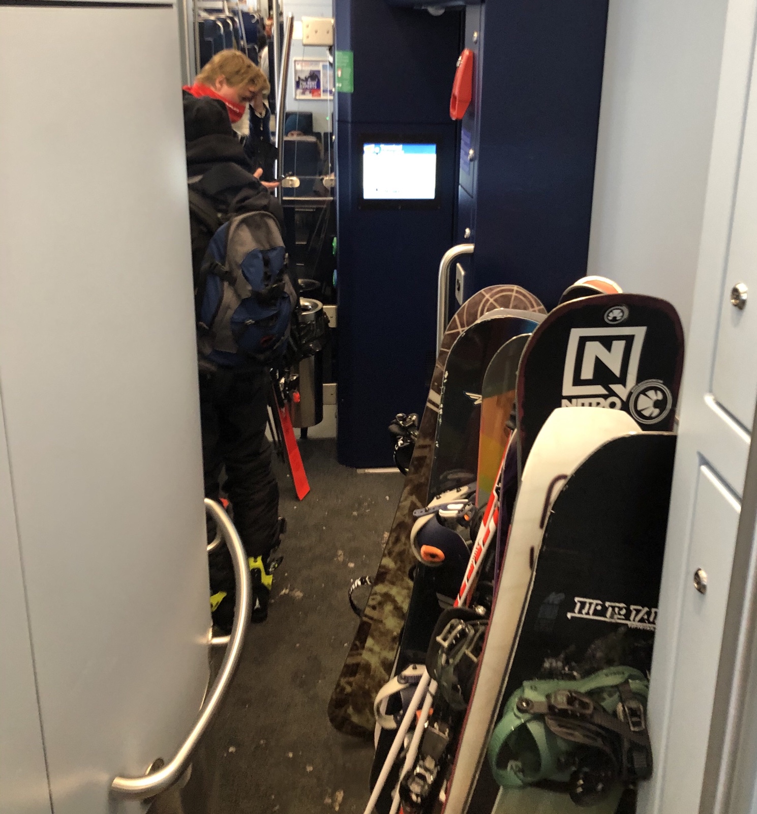 Im Zug der Berner Oberlandbahn sind die Sitzplätze der zweiten Klasse fast alle belegt. Viele, vor allem junge Reisende, ziehen es vor, anstatt zu stehen auf dem Boden und im WC zu sitzen. Notausgänge sind mit Skis und Schneebrettern zugestellt, Abfall des Tages allüberall, nur nicht in den vorgesehenen Behältnissen.