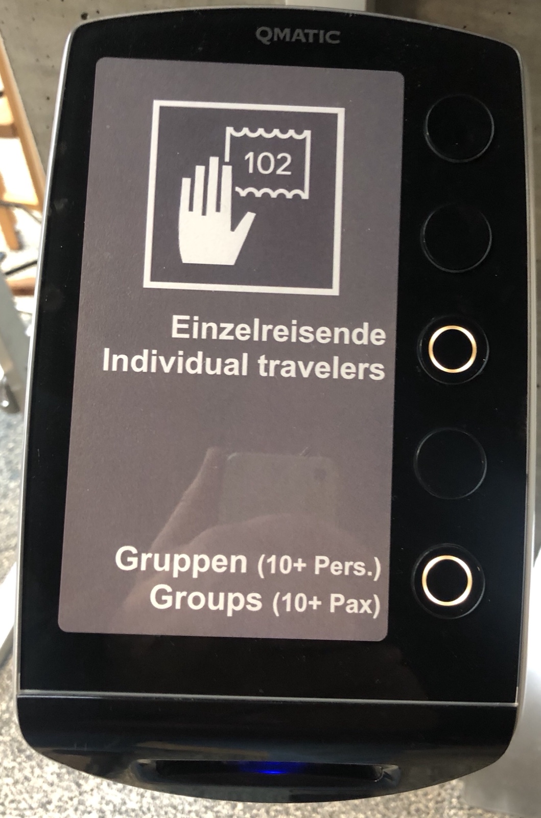 Obwohl klar beschriftet, nehmen die meisten Leute ein Nummerticket für Gruppenreisende, bemerken hinterher bzw. teils erst am Schalter ihren Irrtum und ziehen eine weitere Nummer. Andere wiederum ziehen extra eine Nummer für Gruppenreisende, werden somit sofort bedient; mit gespielt hilfloser Unschuldsmiene entschuldigen sie sich am Schalter und werden deswegen sofort bedient.