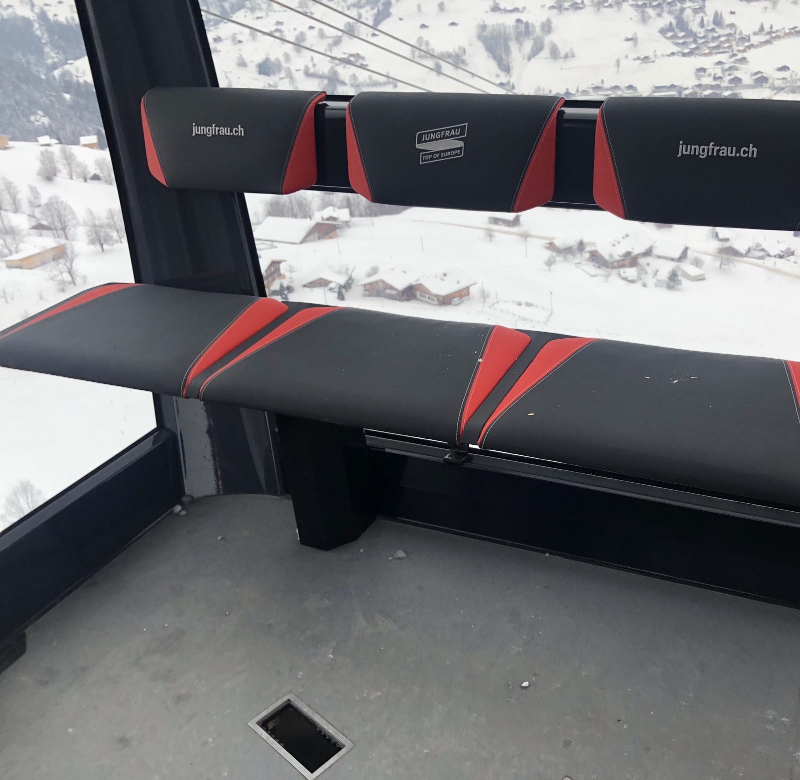 Jede der 44 Gondeln bietet Platz für 26 Reisende auf geheizten Sitzplätzen in total 4 Sitzreihen. Für die Skis sind im Boden der Gondeln, extra formatierte Löcher ausgespart worden, so dass die Skis stehen können. Daran dass ein grosser Teil der Wintersportler heute aber auf Snowboards den Berg runter rutscht, hat offenbar niemand gedacht.