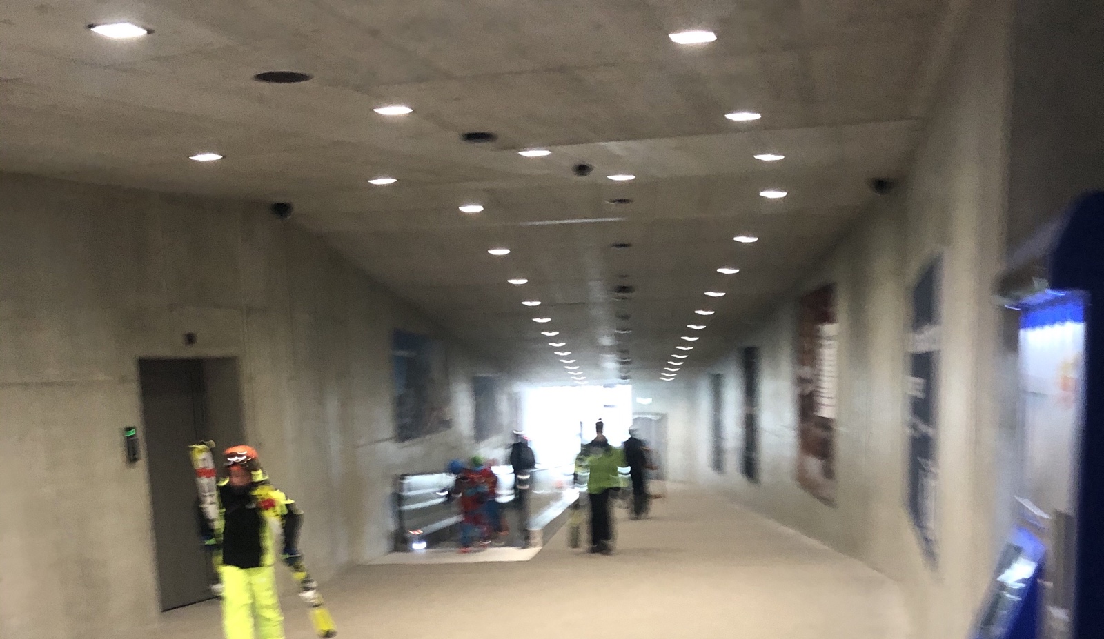 Nur rund 300 Meter sind bis zu den Gondelbahnen zu laufen. 2 kurze Rollbänder zwischen der Unterführung und der Gondelbahnhalle sollen müde Wintersportler unterstützen.
