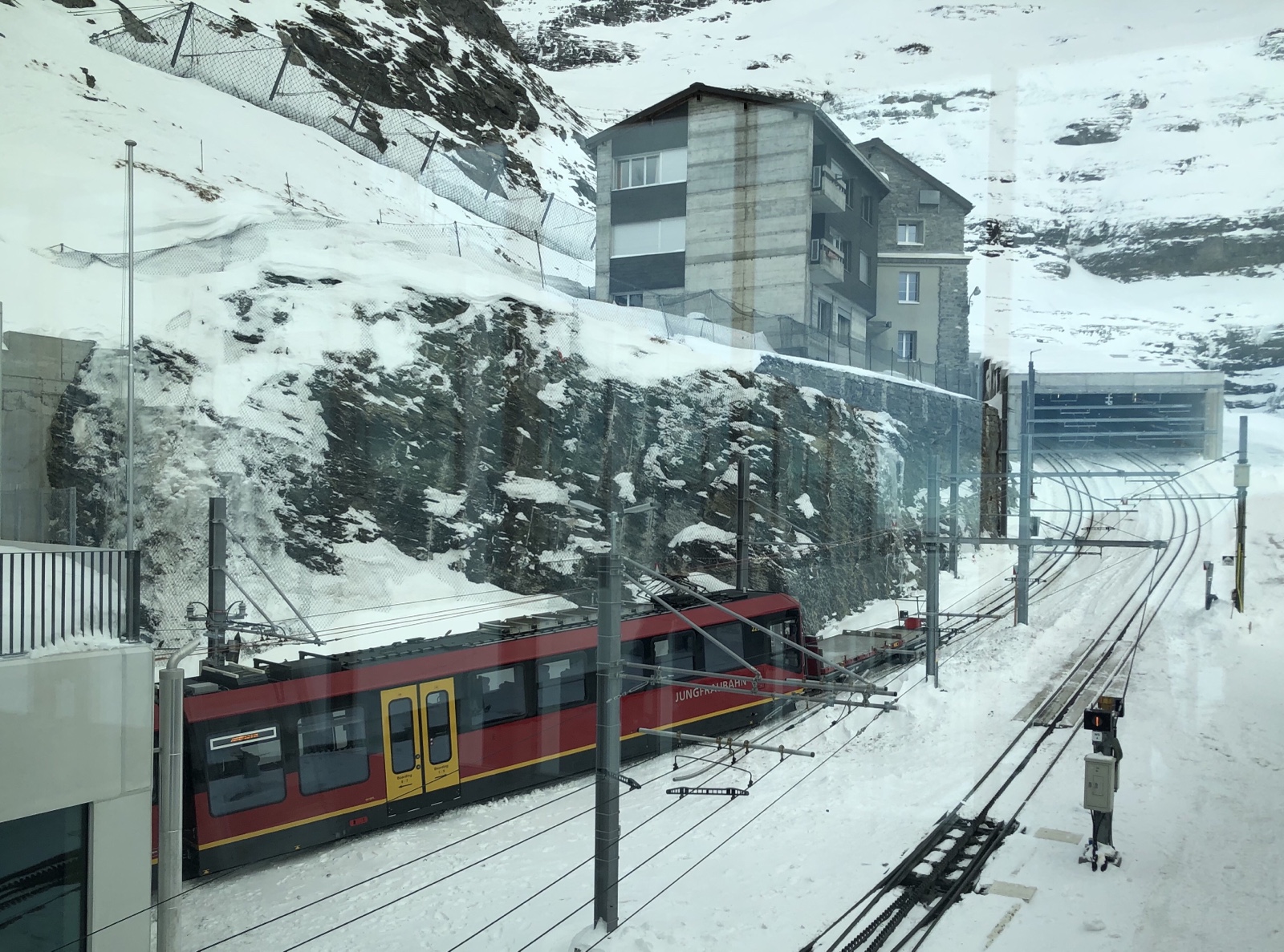 Jene Reisenden die unbedingt mit der Zahnradbahn via Kleine Scheidegg reisen wollen, müssen hier im Eigergletscher die Überführung benützend,