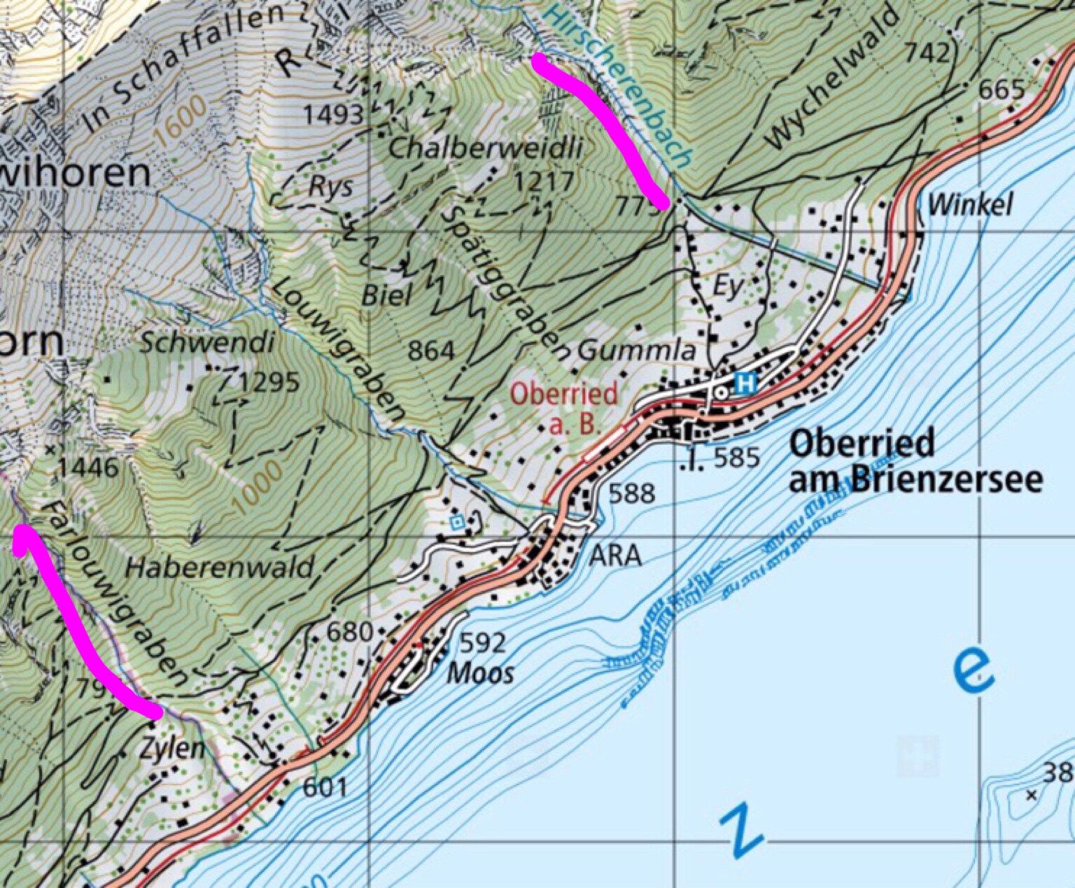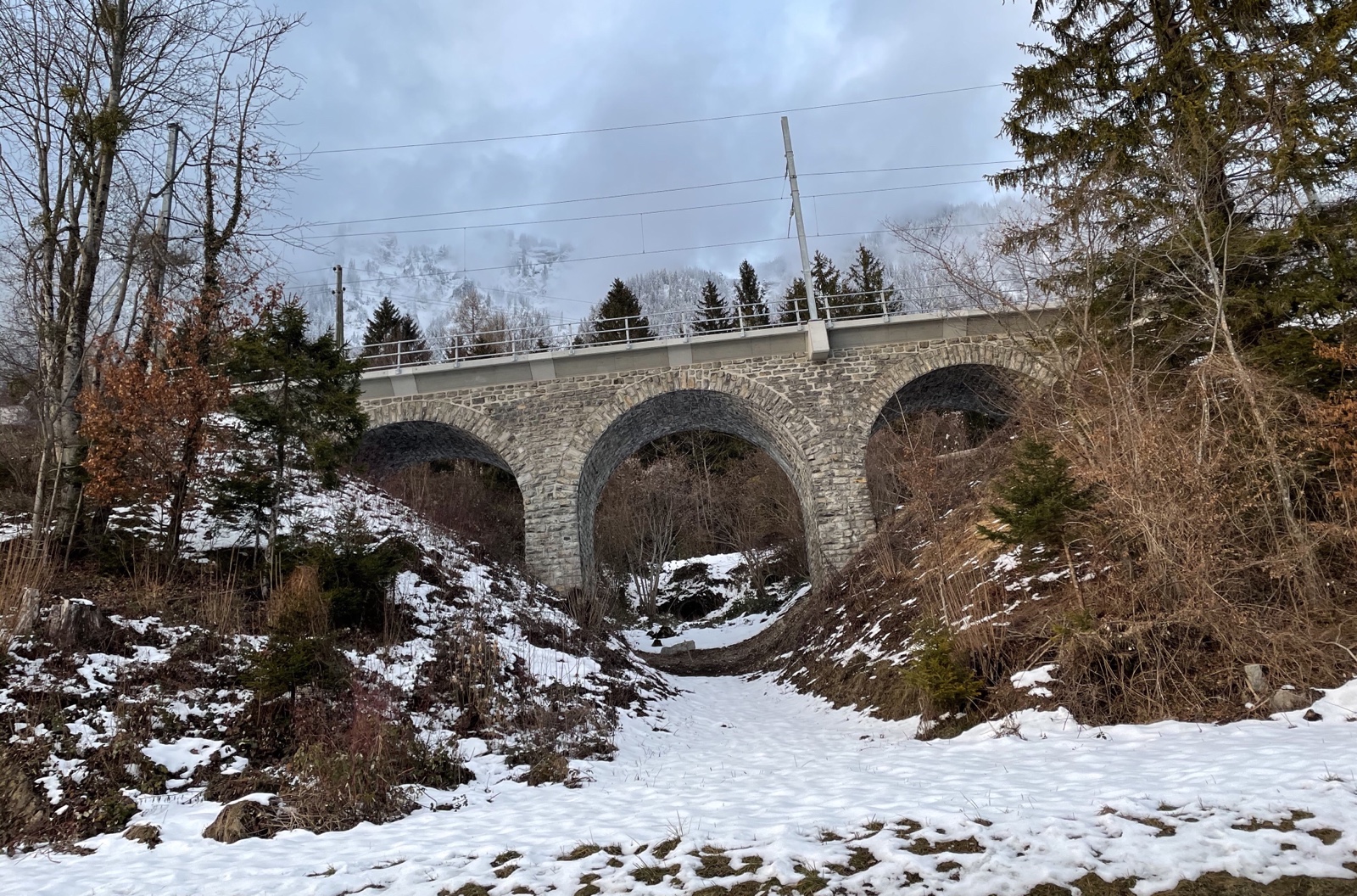 Auf der Weiterfahrt nach Brienz bremst der Lokführer vor der Brücke über den Hirscherengraben deutlich ab, so als ob er sich vergewissern wollte, ob die Brücke noch da und die Durchfahrt ohne Gefahr möglich sei.