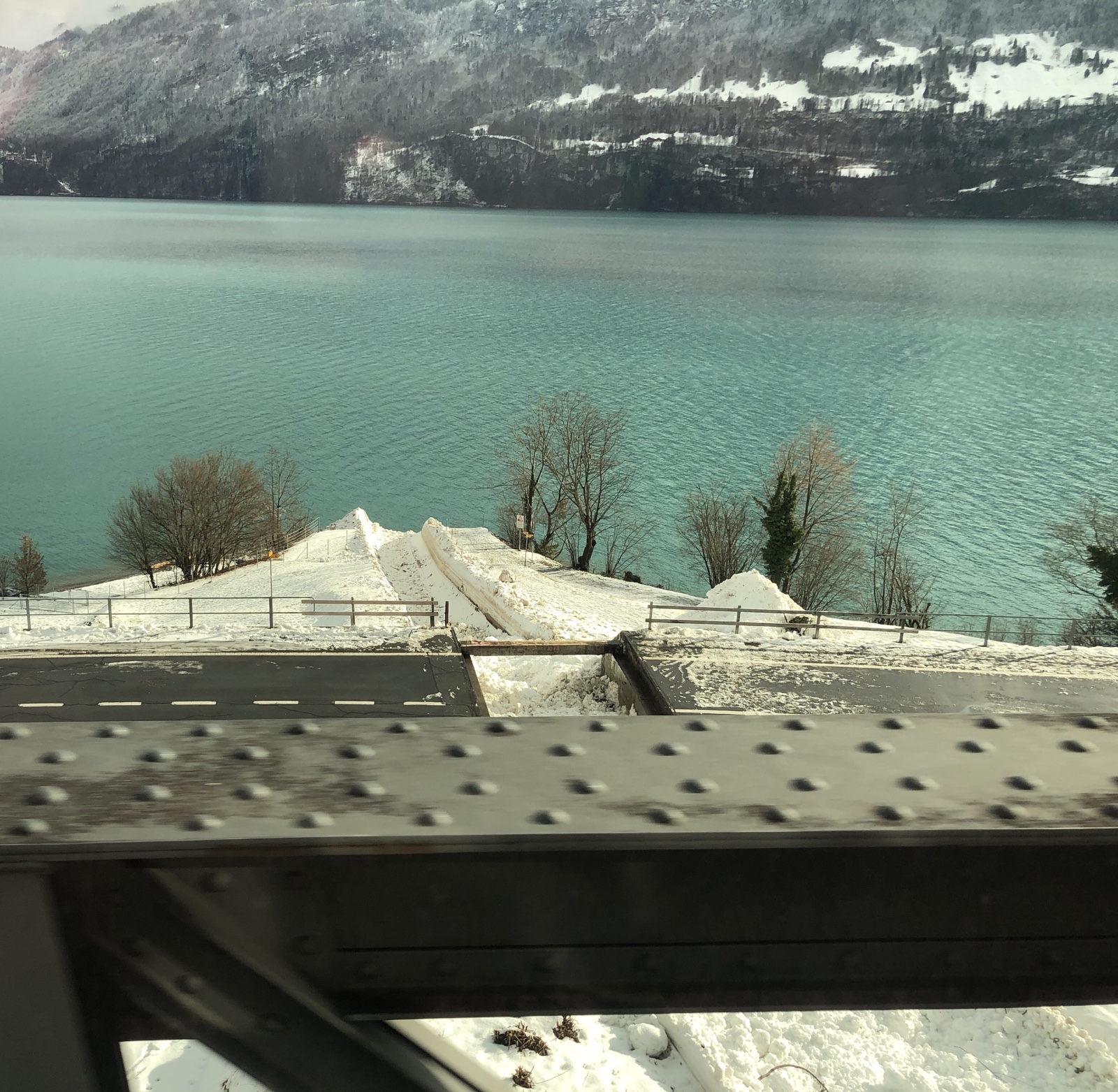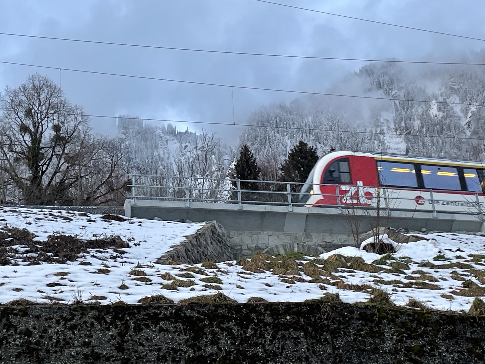 Nach dem Mittagsschlaf gehe ich raus. Schäfchenwolken stehen jetzt am Himmel – wird es bald regnen bzw schneien? Noch scheint die Sonne warm vom Himmel. Also mache ich kurzentschlossen eine erste Ausfahrt mit dem Dreirad. Die Farben am See sind sehr intensiv; und es dünkt mich, auch das Rot und Weiss der Züge würde intensiver leuchten.