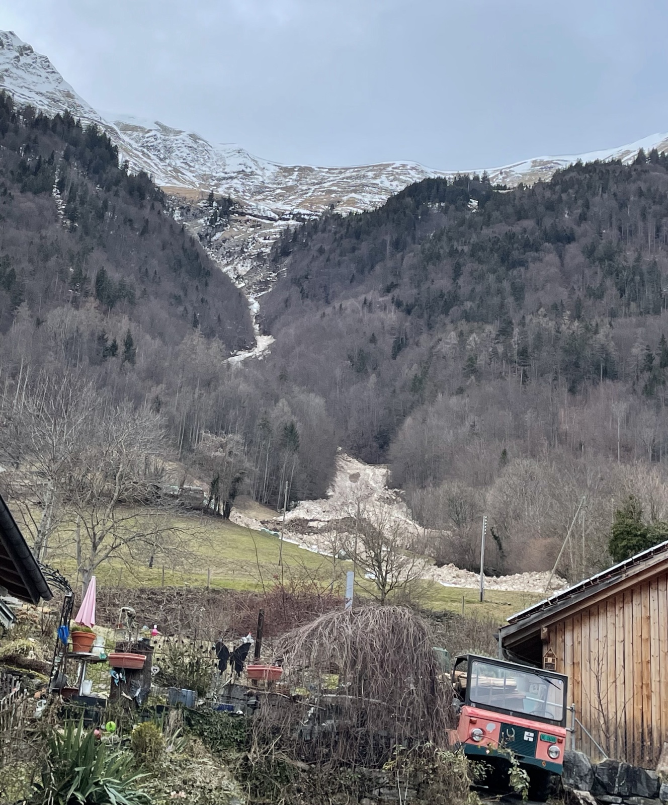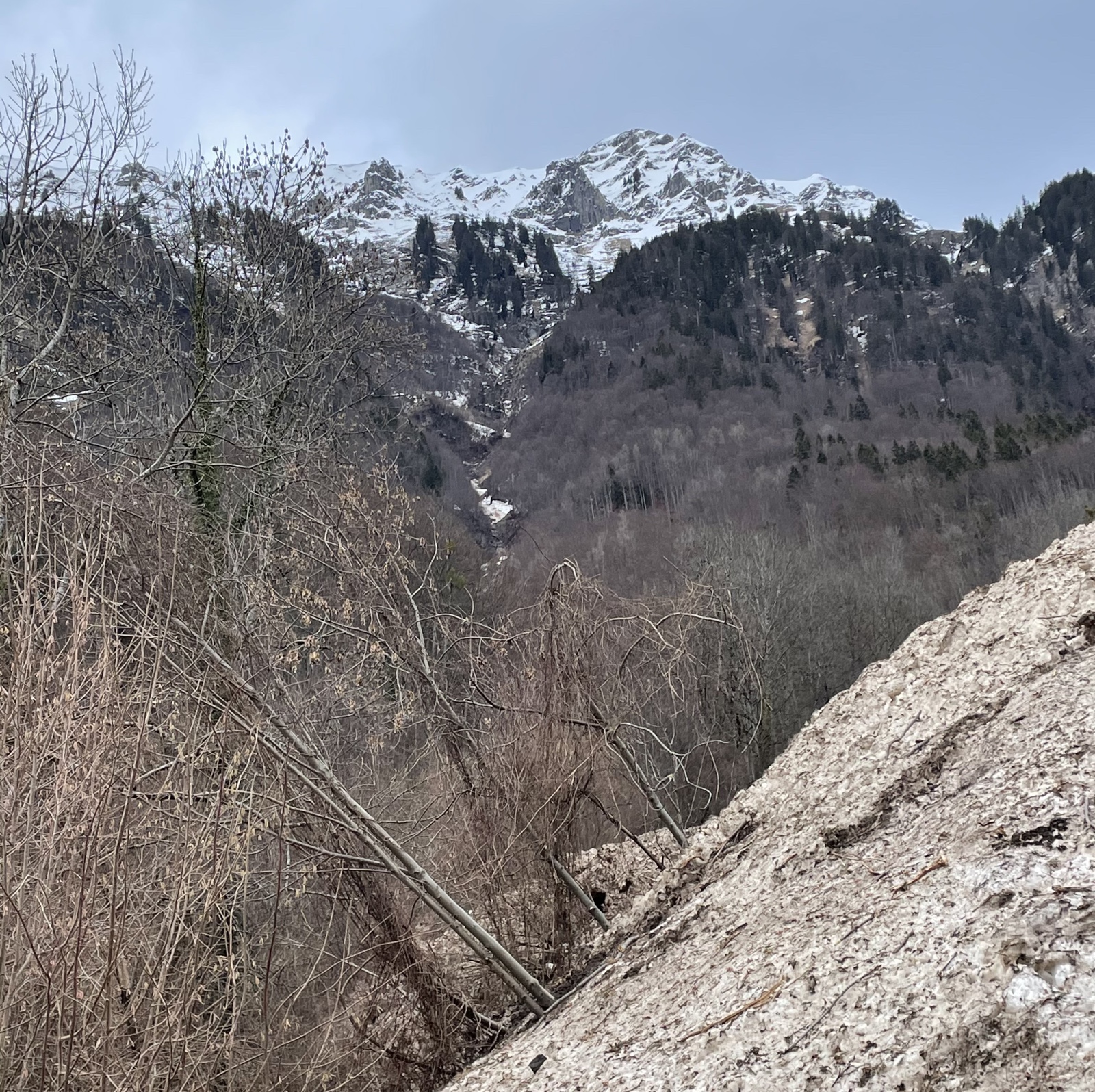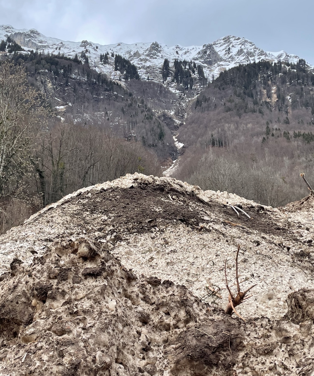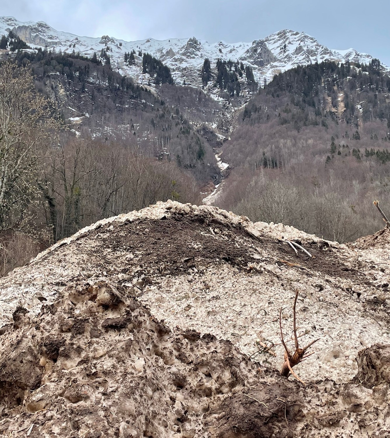 Die Lawine ist dieses Mal in zwei Zungen auseinandergegangen. Die westliche Zunge blieb mehr oder weniger im Bachbett und ist bis in den See hinaus. Das Bachbett ist dadurch teils leer.