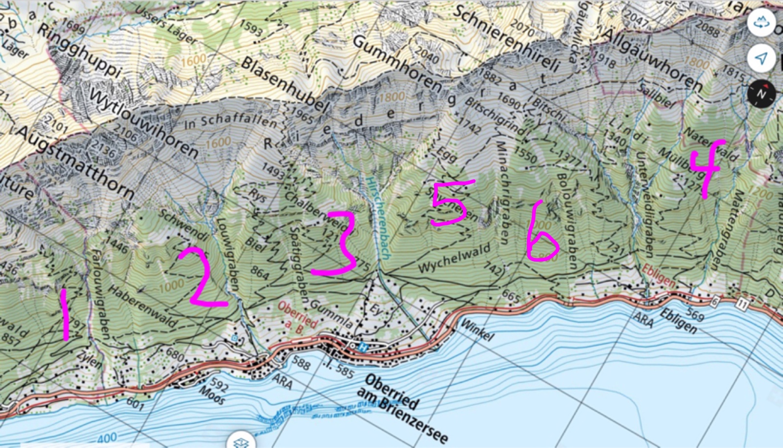 Am Grat oben befindet sich das Wytlouwihorn (2’106) über Meer und die (ehemalige?) Alp „in Schaffallen‘. Das Anrissgebiet ist relativ gross. Im Trichtereingang zum Louwigraben befindet sich aber eine Felsenformation. Der Graben ist zudem relativ eng und wird immer wieder abgeknickt. Auch der Auslauf des Grabens wird von Bäumen und Buschwerk gesäumt. Die Strecke der Brienzersee Uferbahn verläuft hier in einem Tunnel.