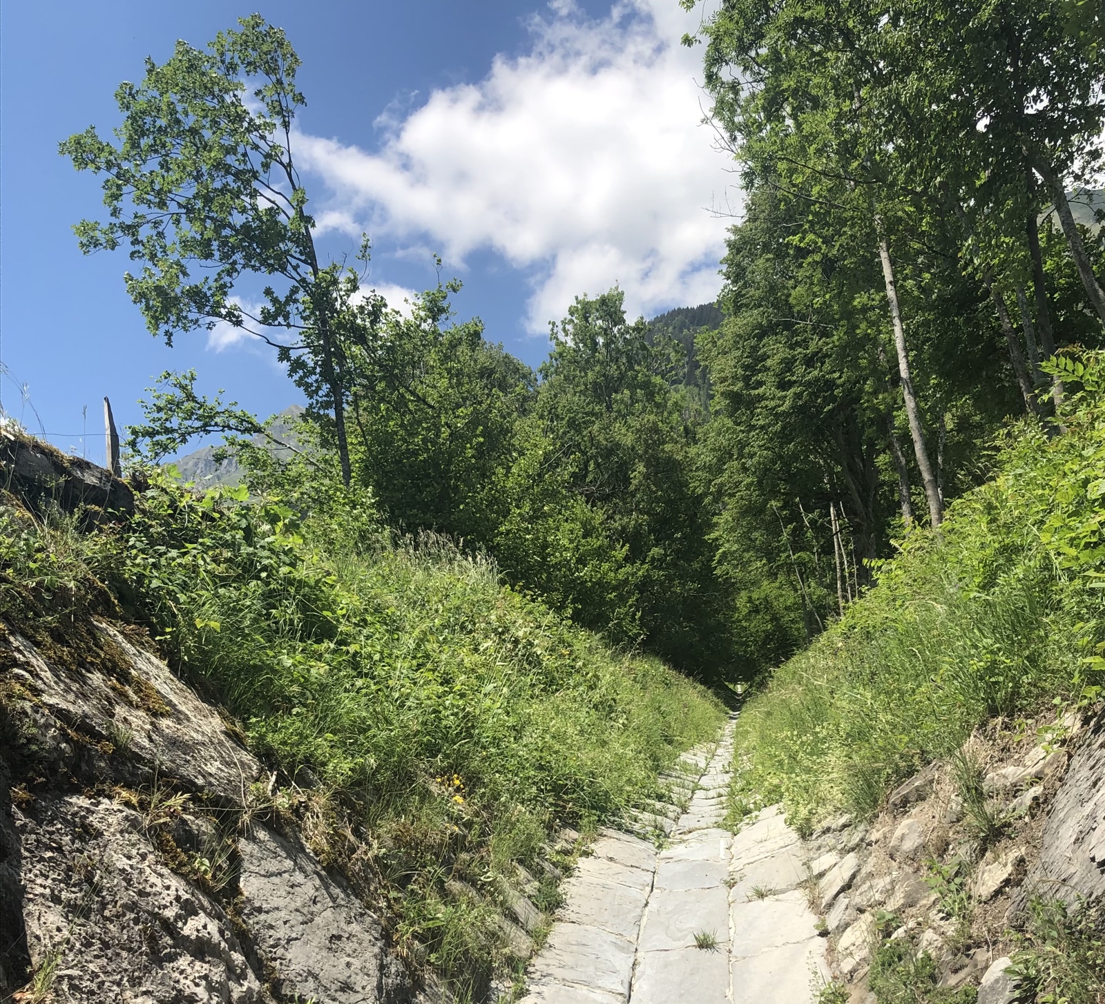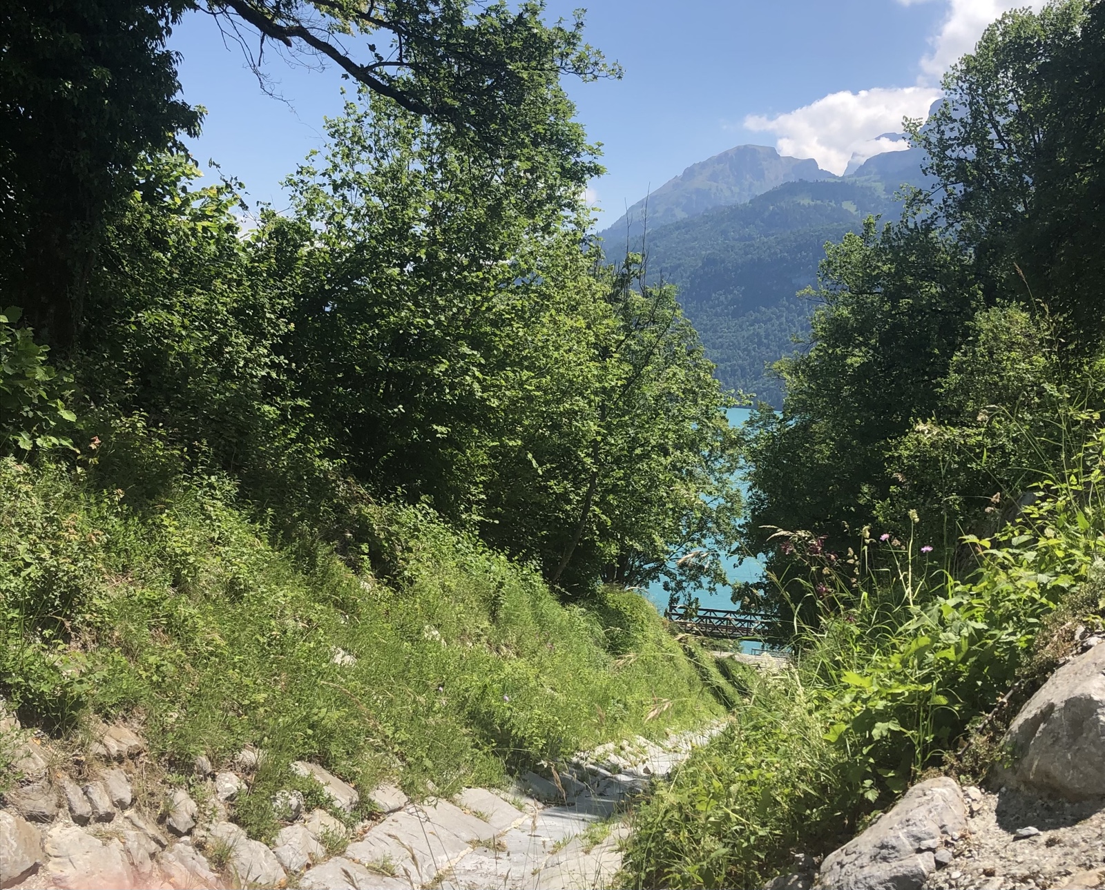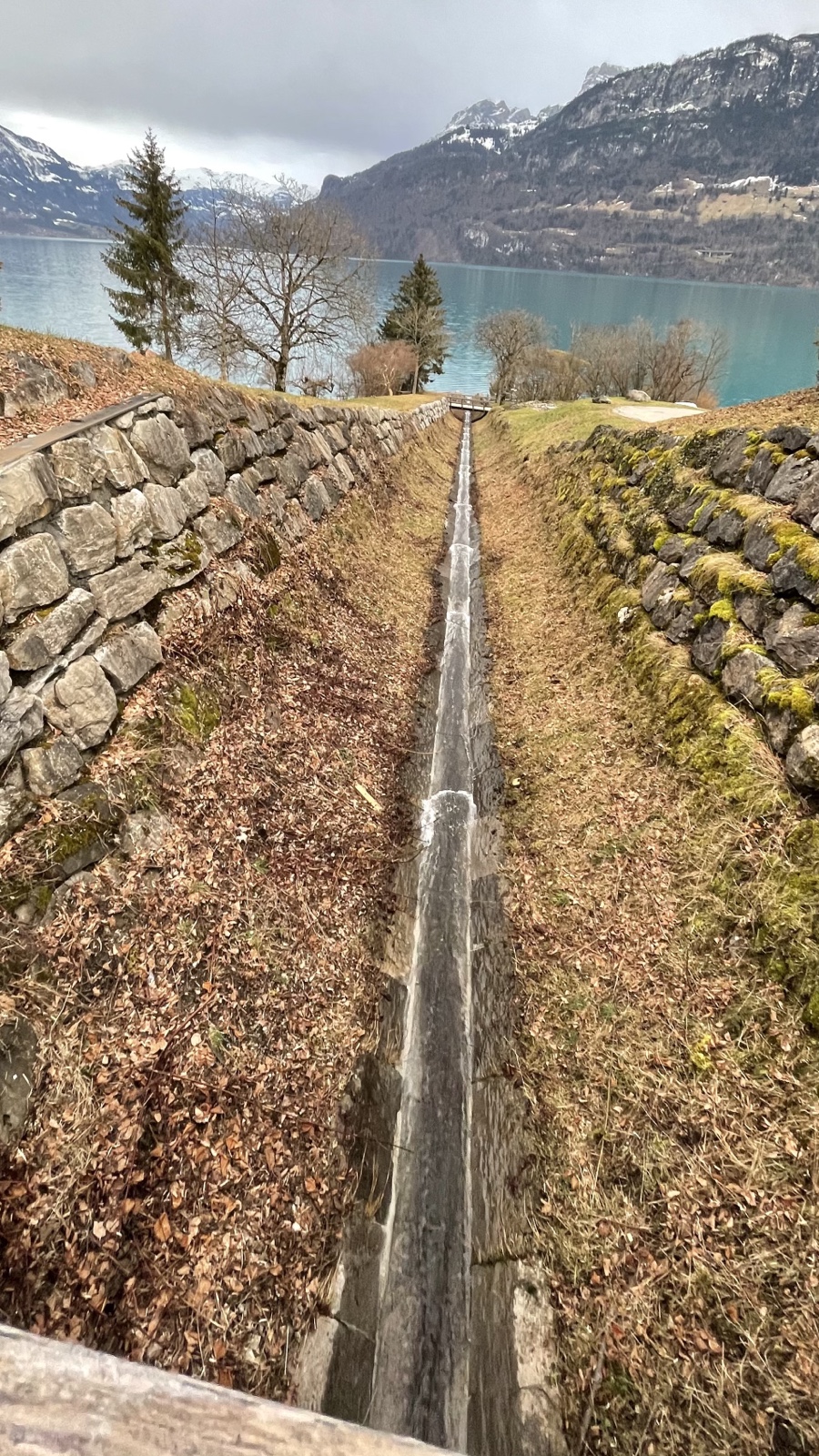 vom Tannhoren hinab in den See. Der Graben ist dicht bewaldet und führt nicht geradewegs den Hang runter. Im unteren Teil ist er mit natürlichen Steinquadern eingefasst; Stufen sollen die Geschwindigkeit des Wassers bzw Schnees mindern.