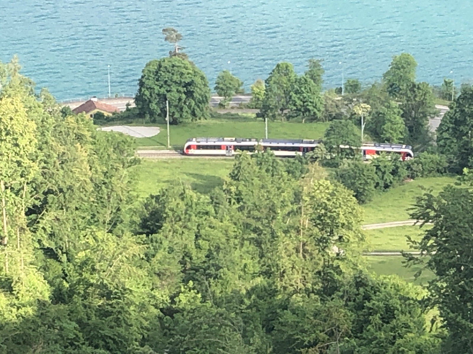 Während die Strasse noch oben, mehr oder weniger auf gleicher Höhe wie der Bahnhof Oberried verläuft, befindet sich die Bahnstrecke im Abstieg nach Niederried bereits relativ weit unten.