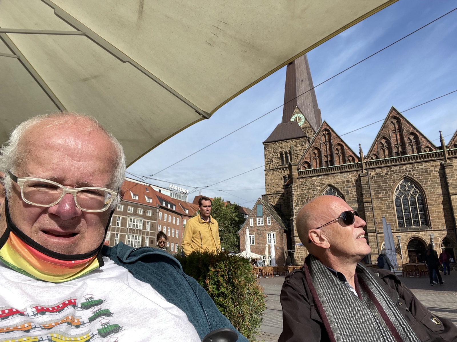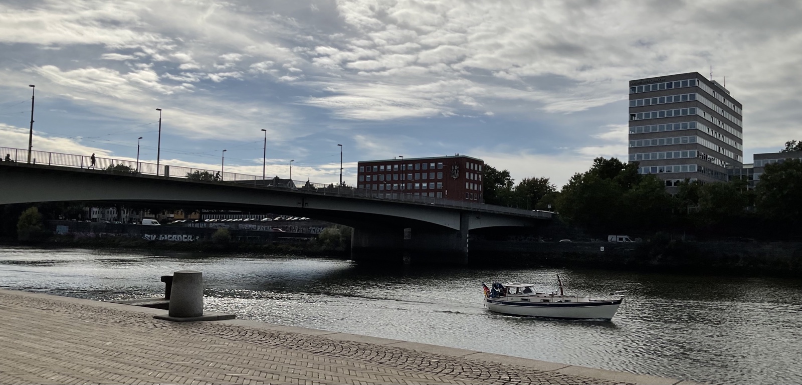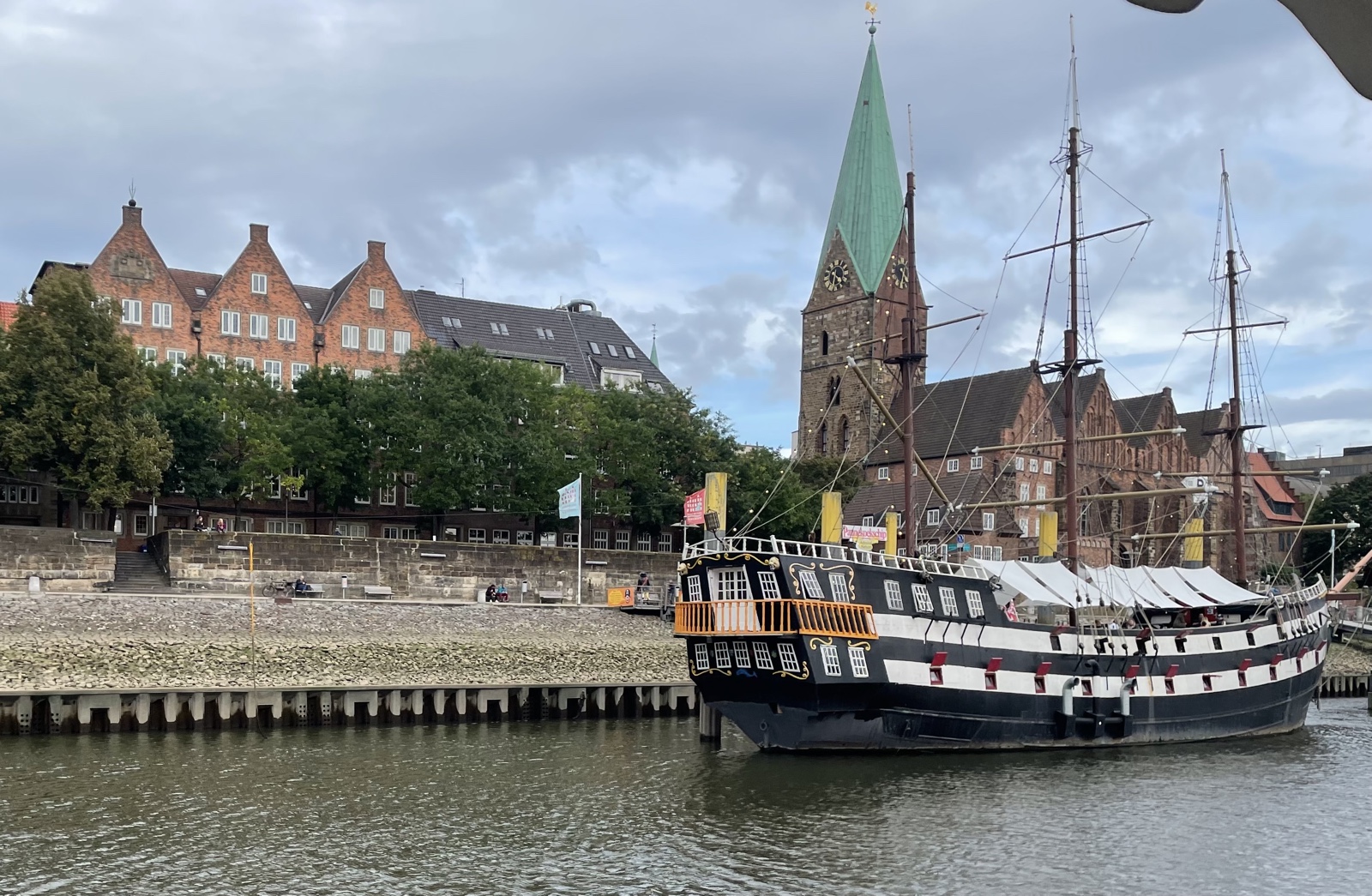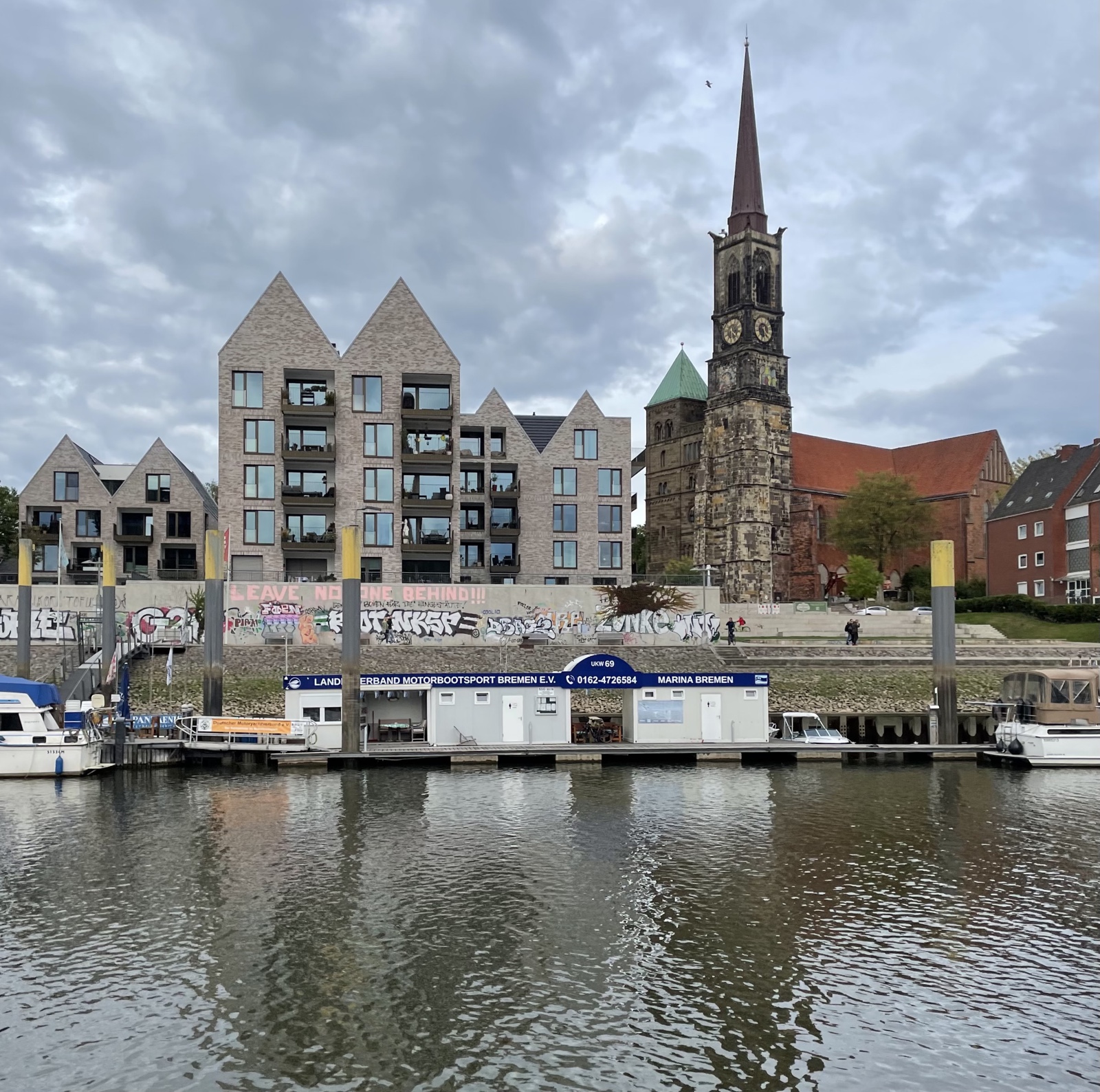 Ich muss noch kurz aufs Zimmer, den Akku des Tabletts bzw des Handys ein paar Minuten lang laden und anderes mehr. Mit der Strassenbahn fahre ich dann wieder zurück, runter zur Weser, zum Martinihafen.