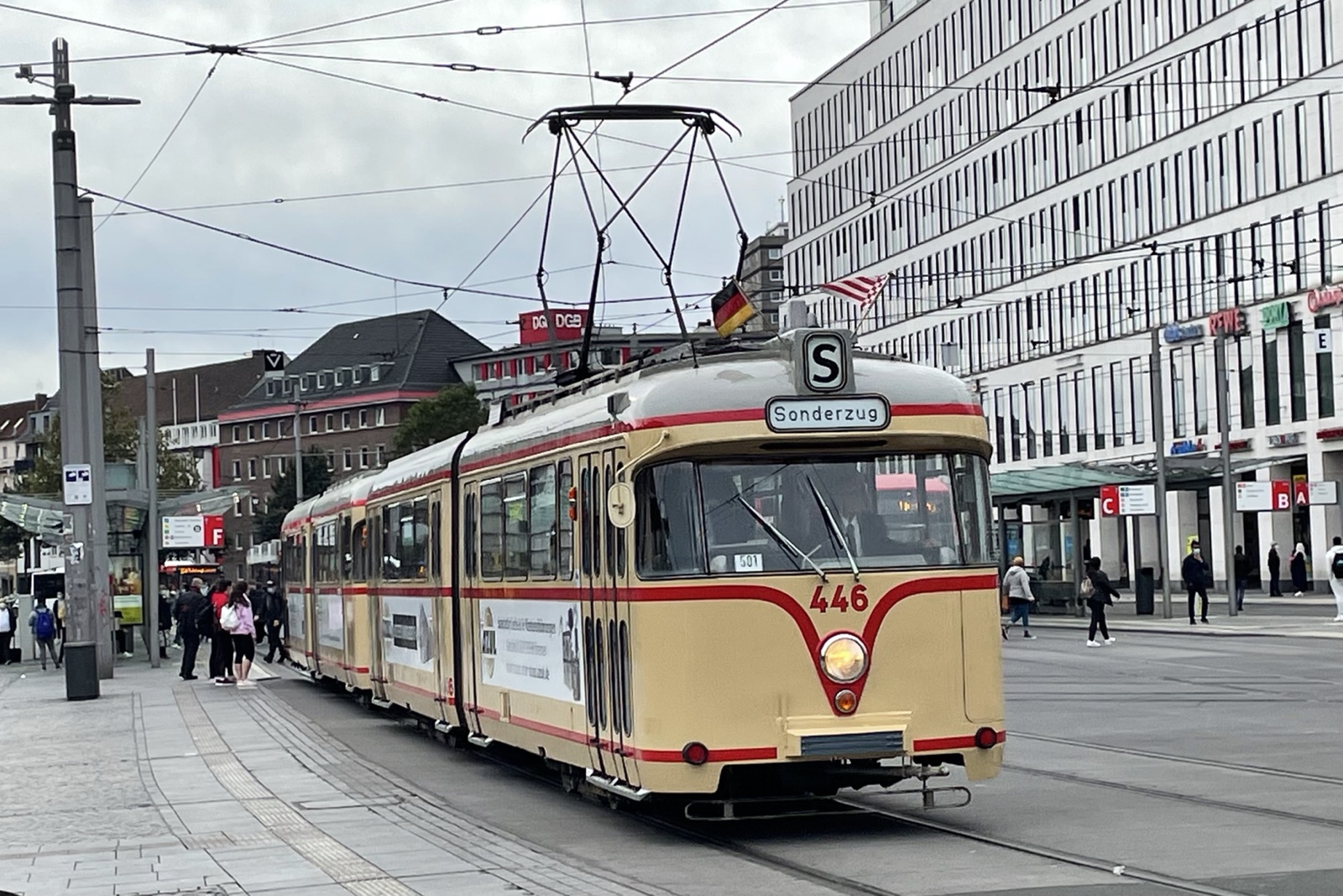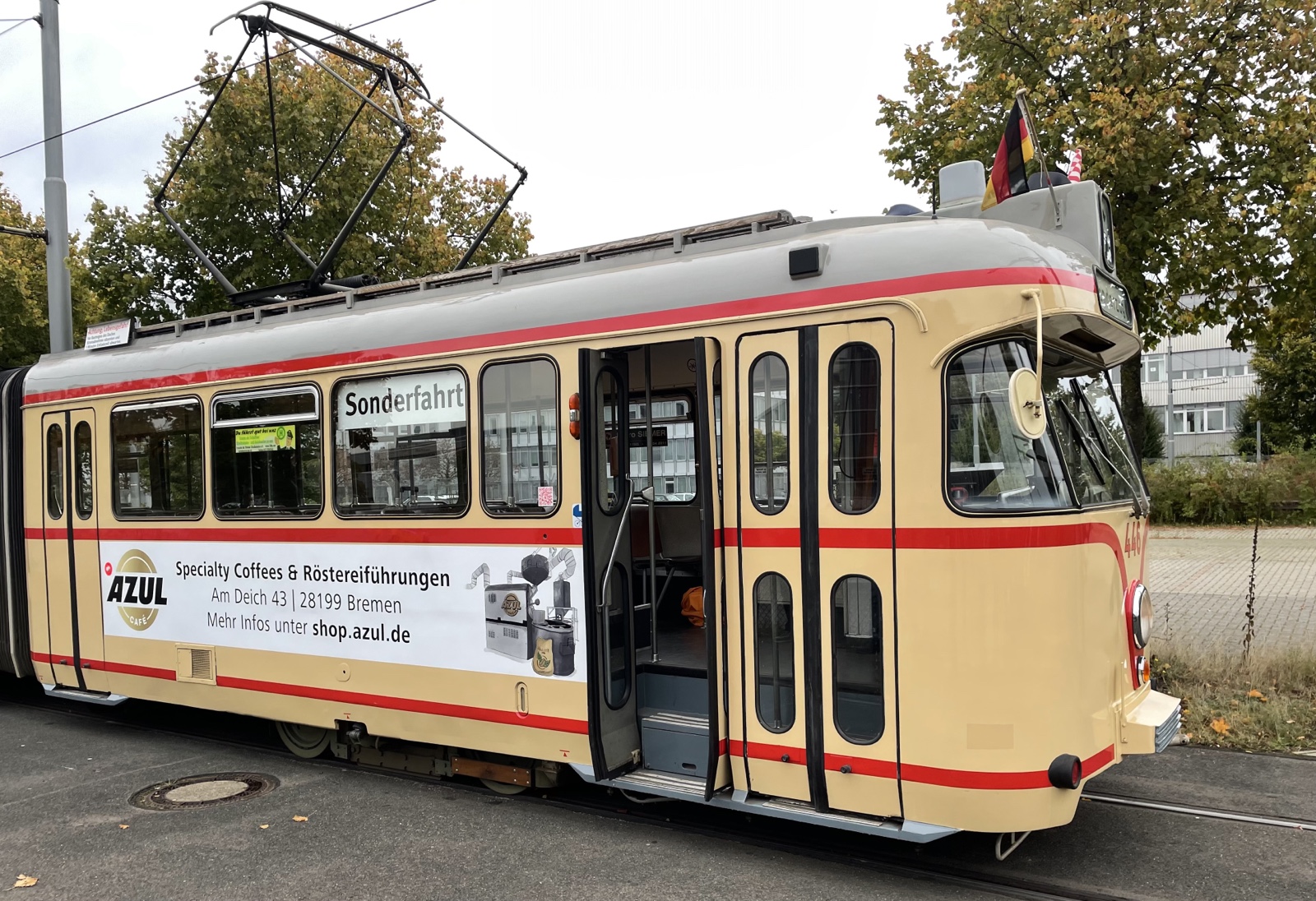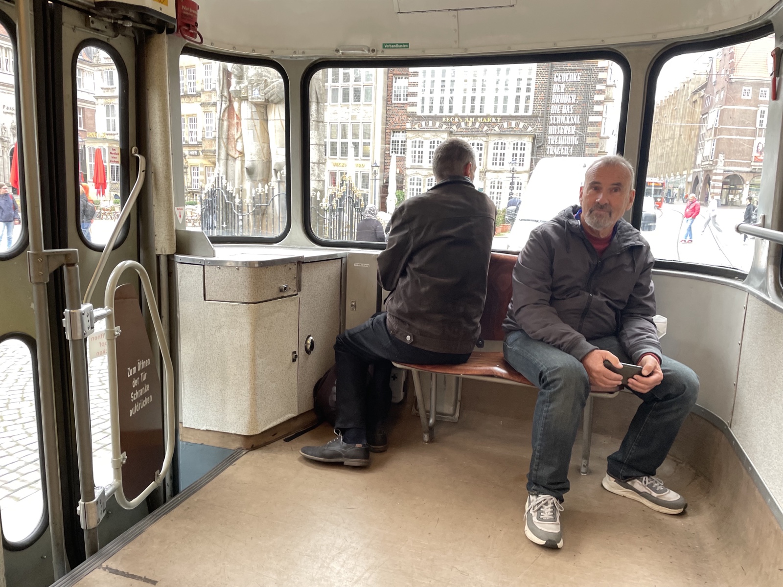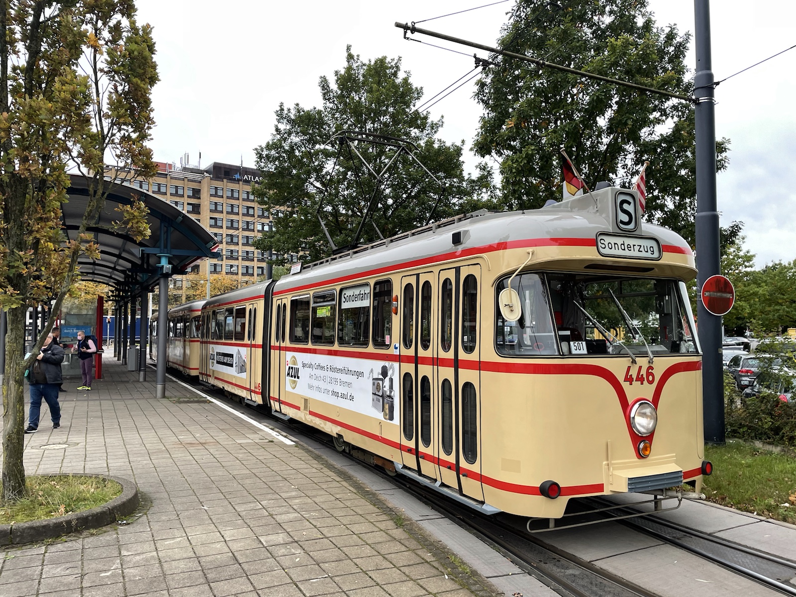 Das Herbsttreffen endet heute am frühen Nachmittag. Alle müssen Koffer packen – nur wir Schweizer nicht! Nach einem reichhaltigen Frühstück verlassen wir deshalb erst um 9 Uhr das Hotel, spazieren durch den Bahnhof und erwarten auf dem Bahnhofplatz unser Extratram des Strassenbahnmuseums Bremen.