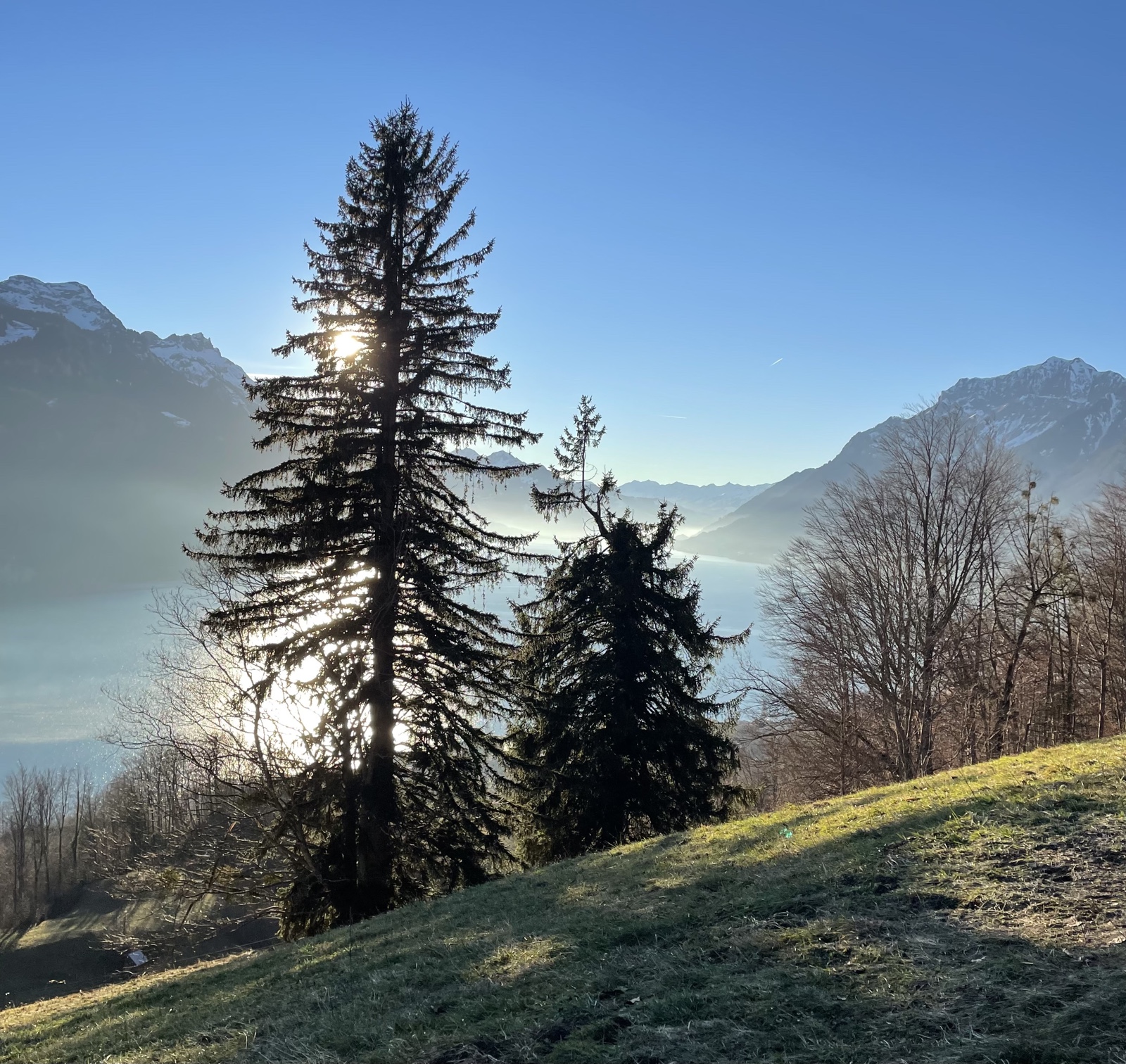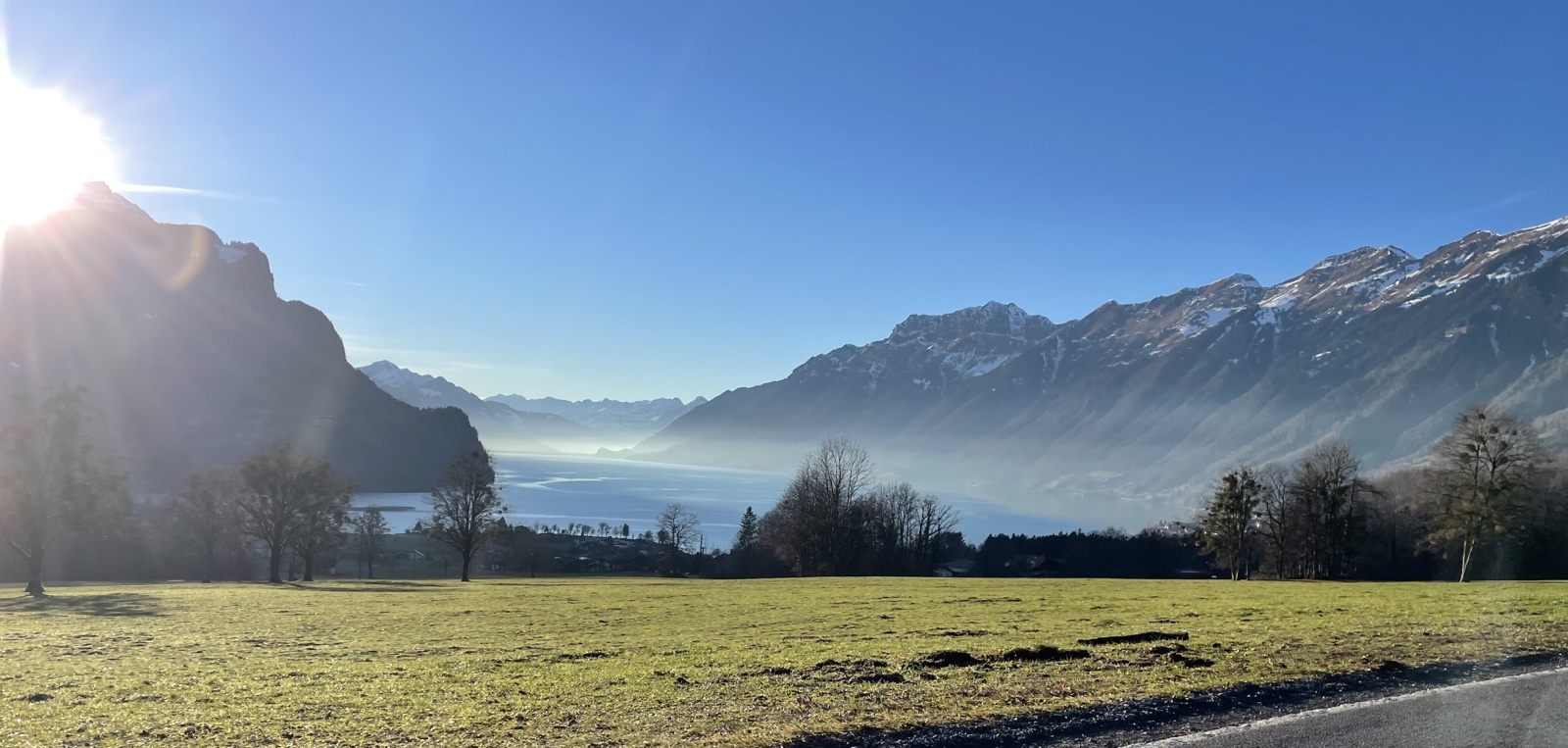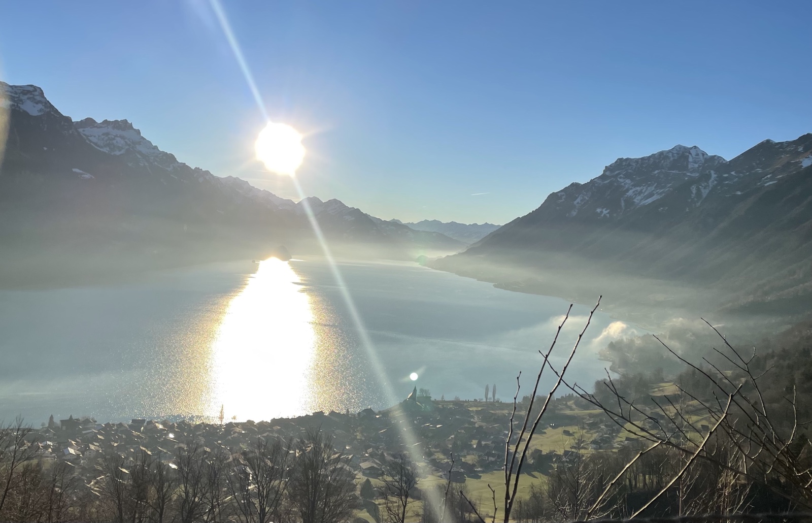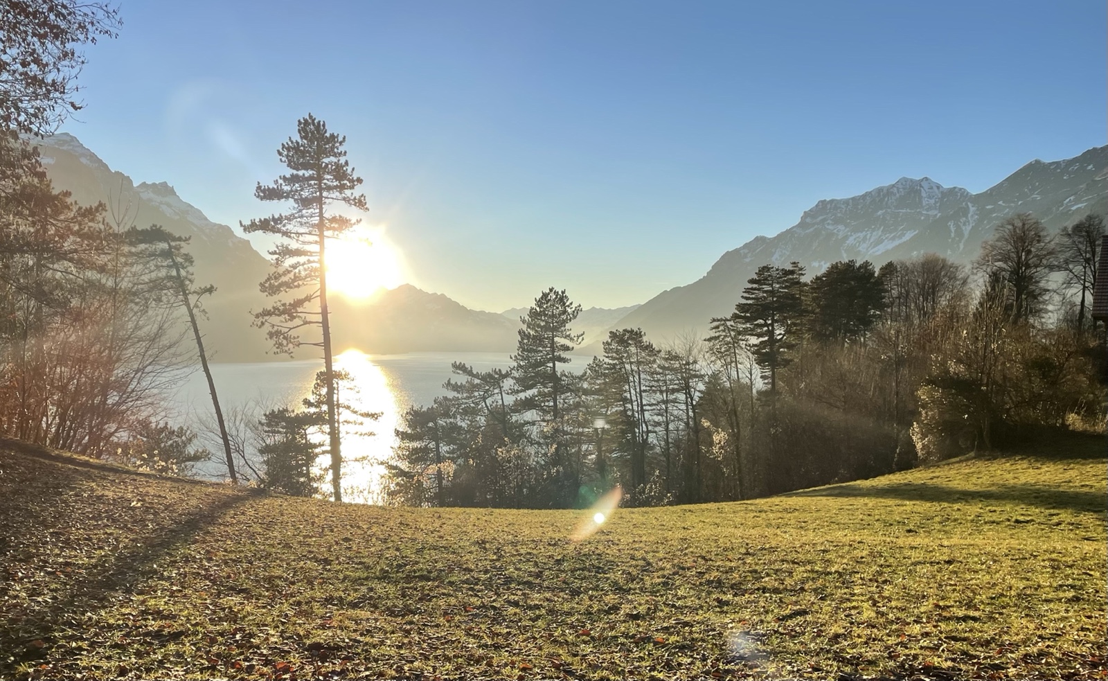 trotz der tief stehenden Sonne die Aussicht auf die Berge und den See zu geniessen.