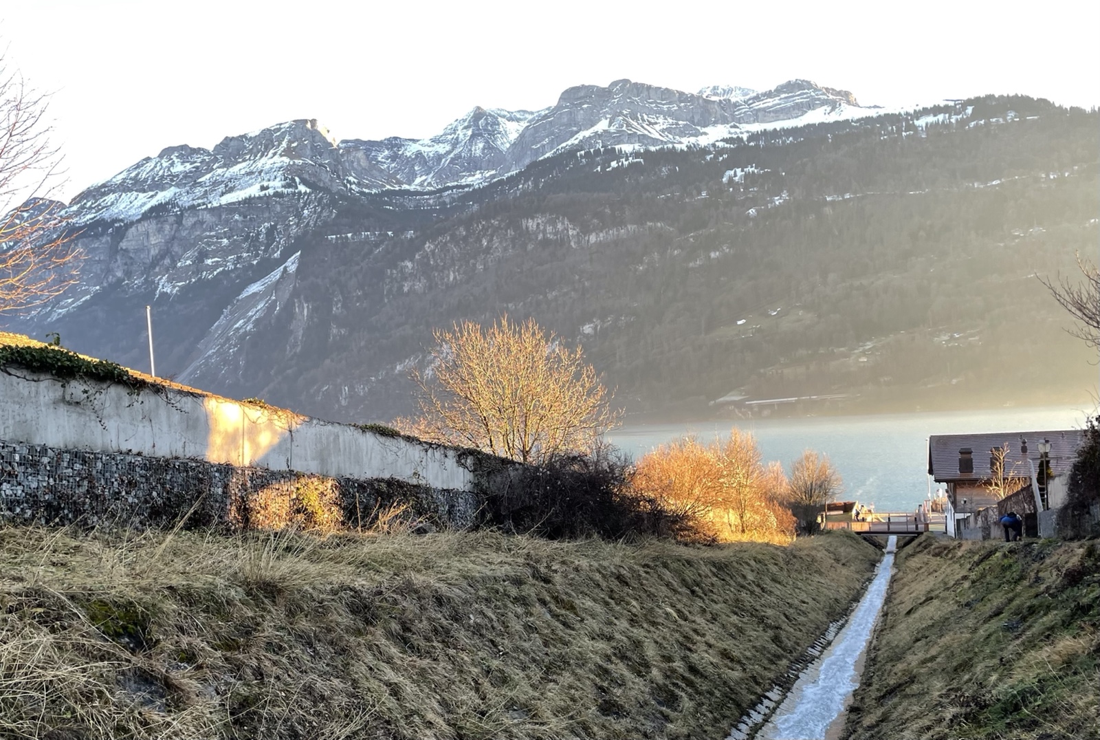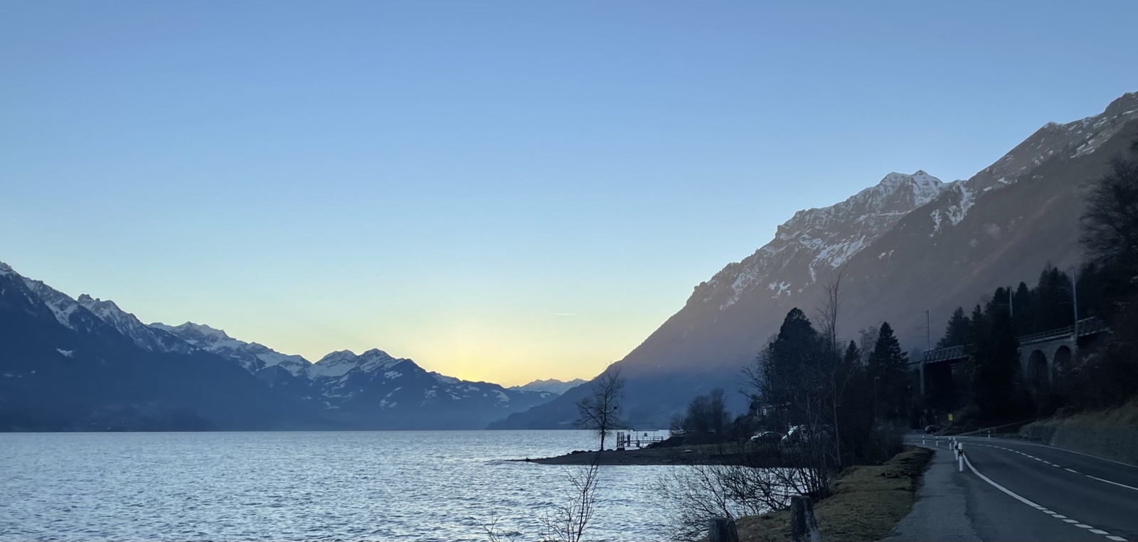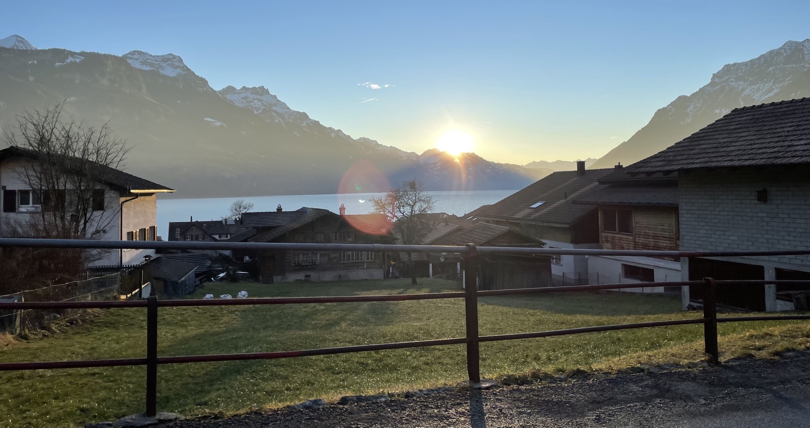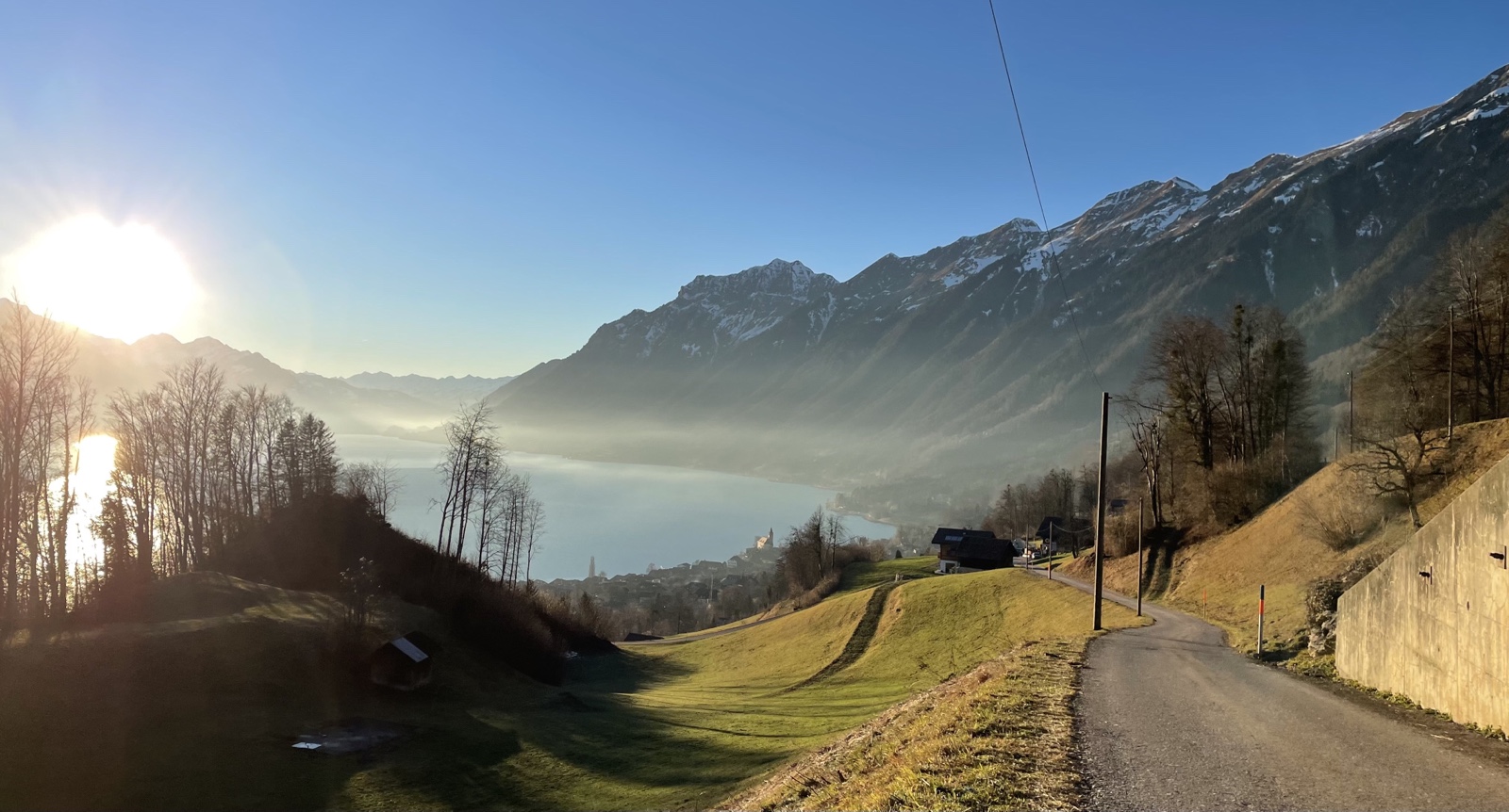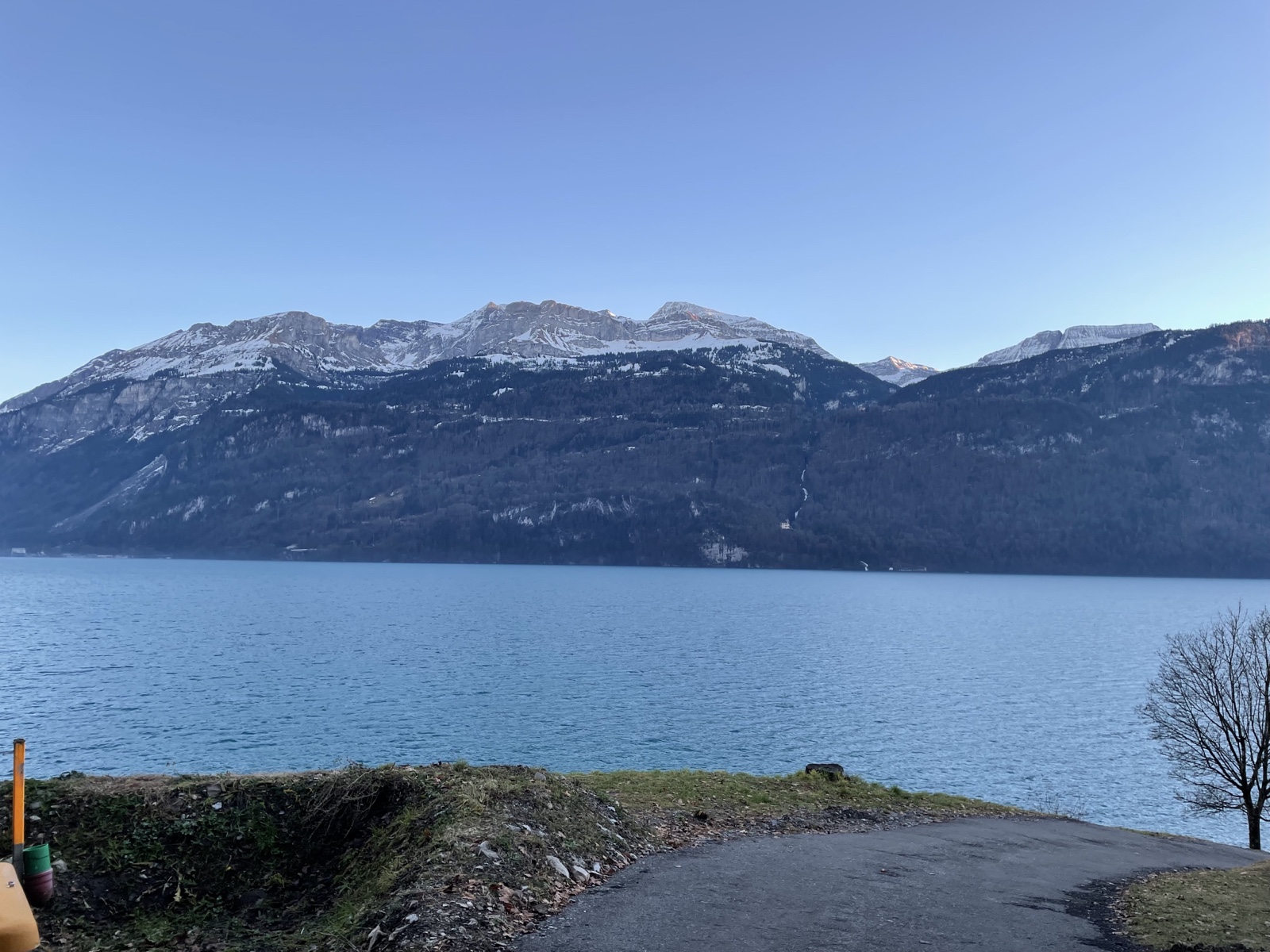 trotz der tief stehenden Sonne die Aussicht auf die Berge und den See zu geniessen.