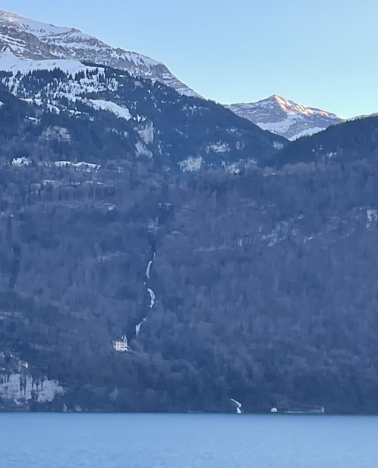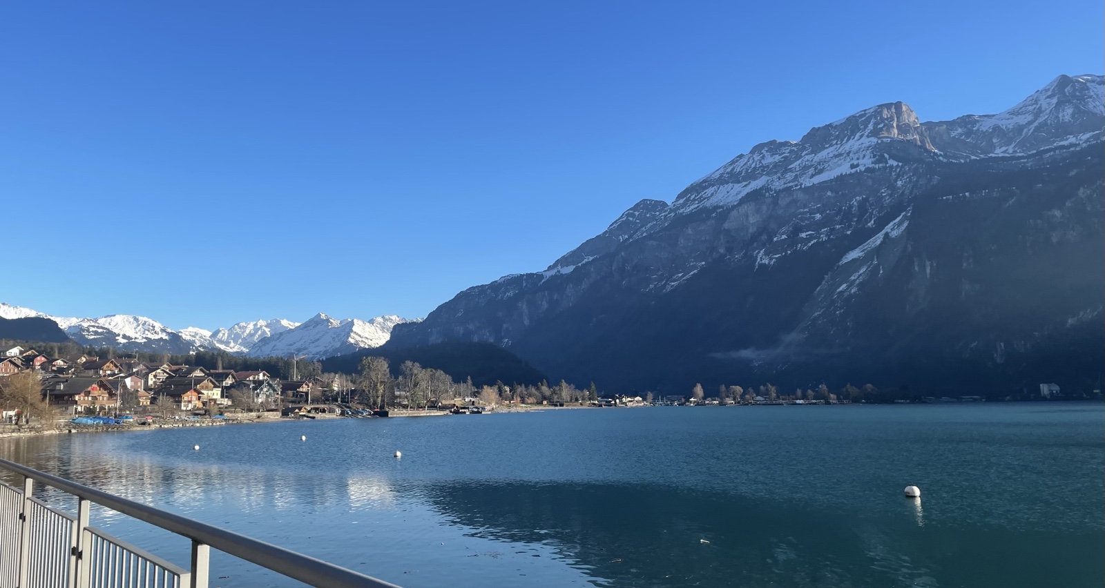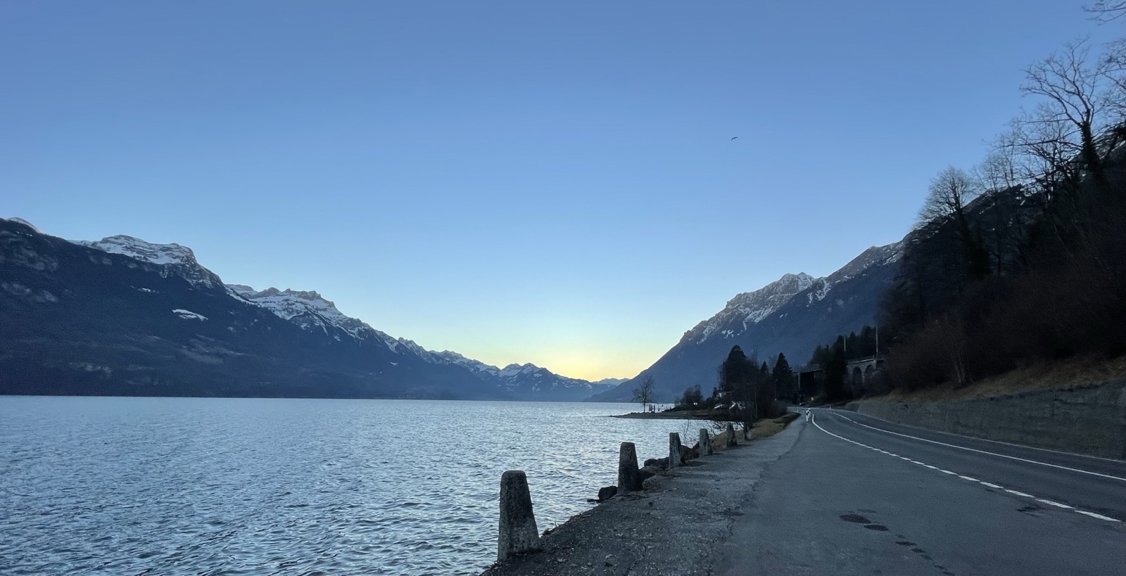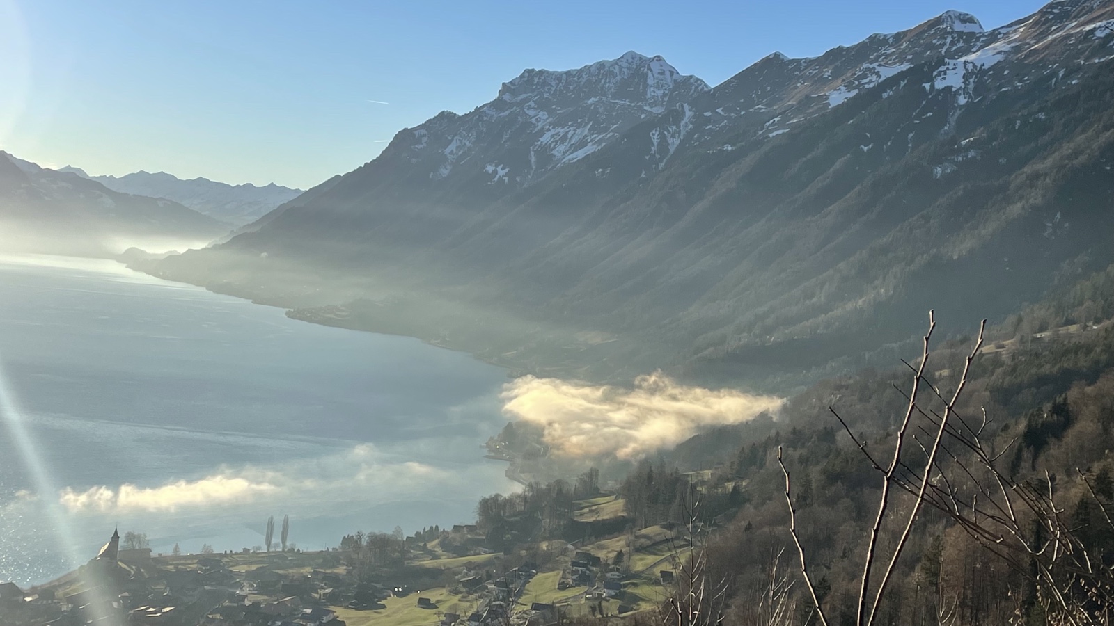 trotz der tief stehenden Sonne die Aussicht auf die Berge und den See zu geniessen.