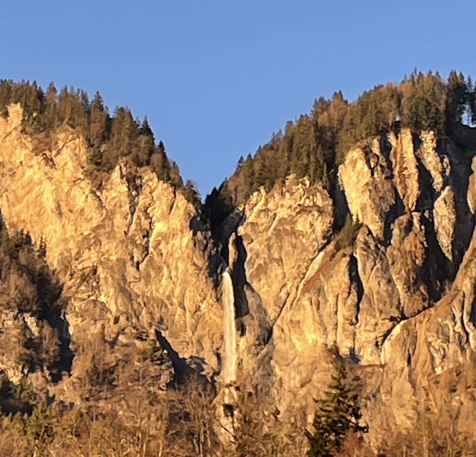 Es wird empfindlich kühl, zudem drückt mir nun die Blase. Rasch noch ein paar letzte Fotos der in der Abendsonne leuchtenden Flühe und Schneeberge.