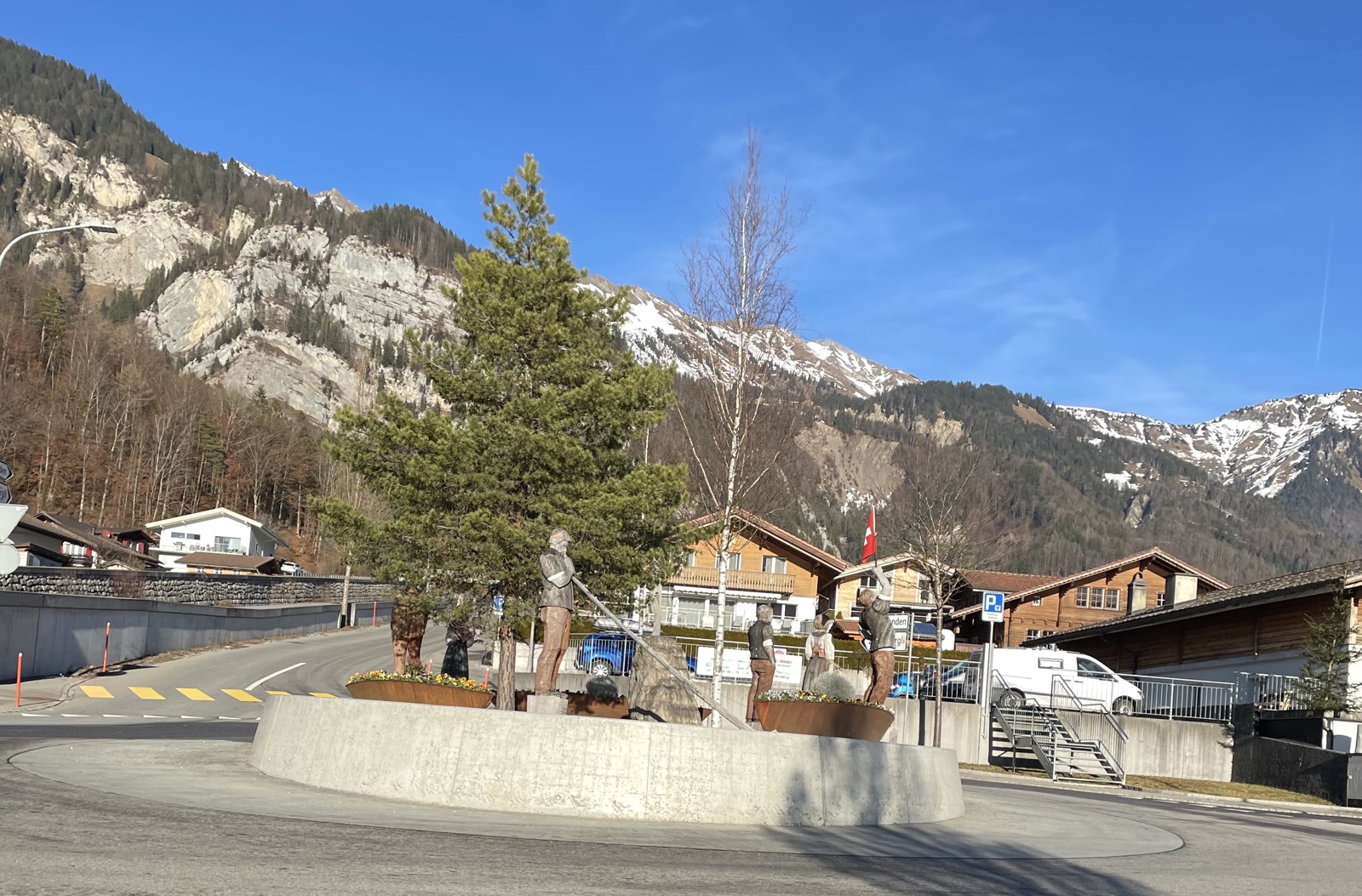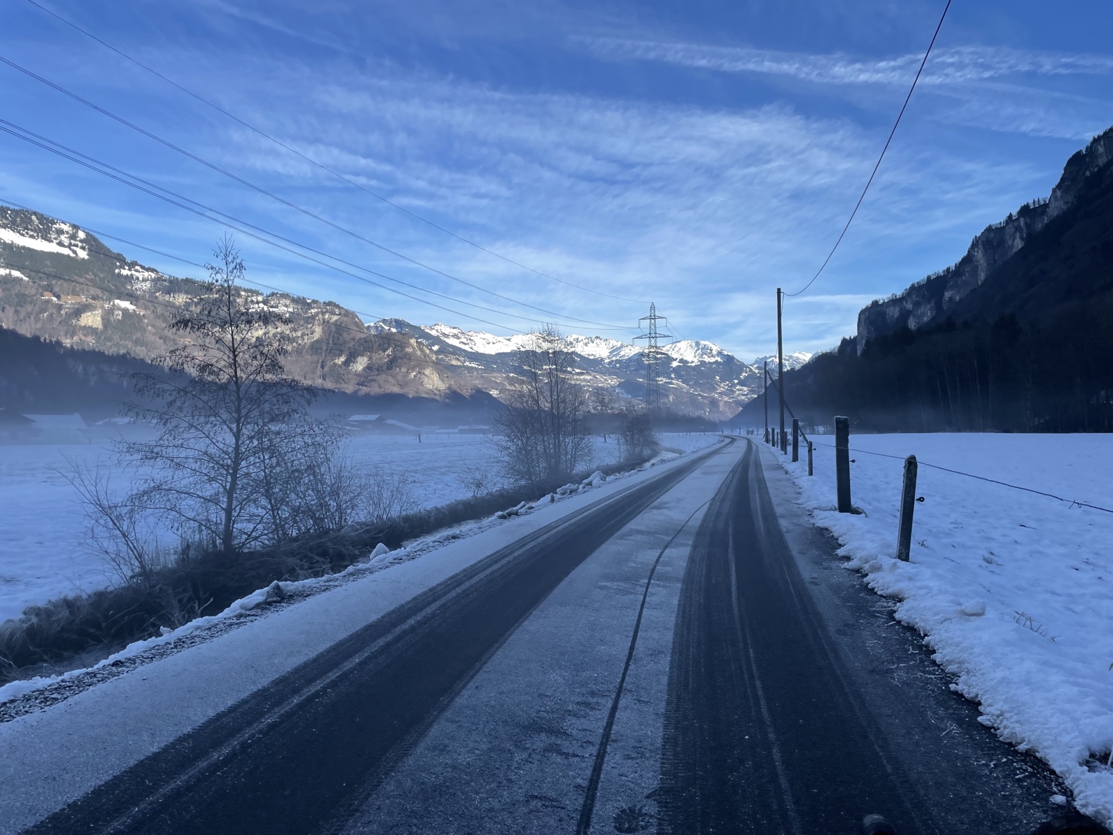 Zügig pedale ich auf der Hauptstrasse nach Brienz, unterdessen nagelt es mich nämlich in meinen eiskalten Zehen. Rasant fahre ich nach Brienz rein und erreiche allsbald das Sonnenlicht. Am Gemeindekreisel, beim Glyssibach