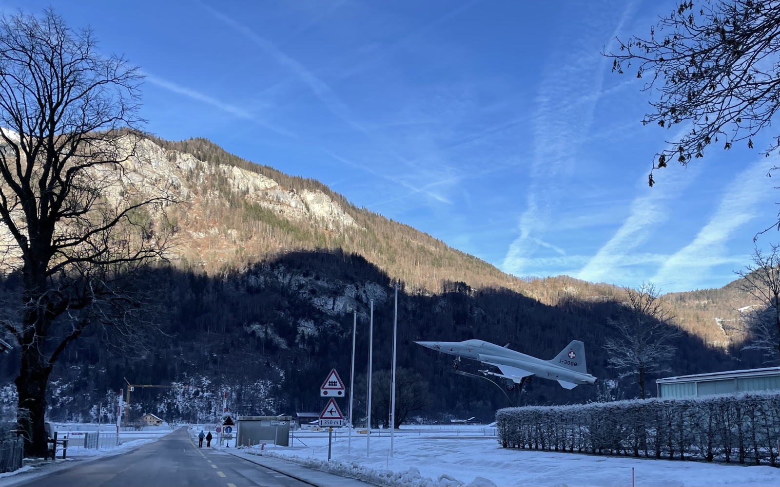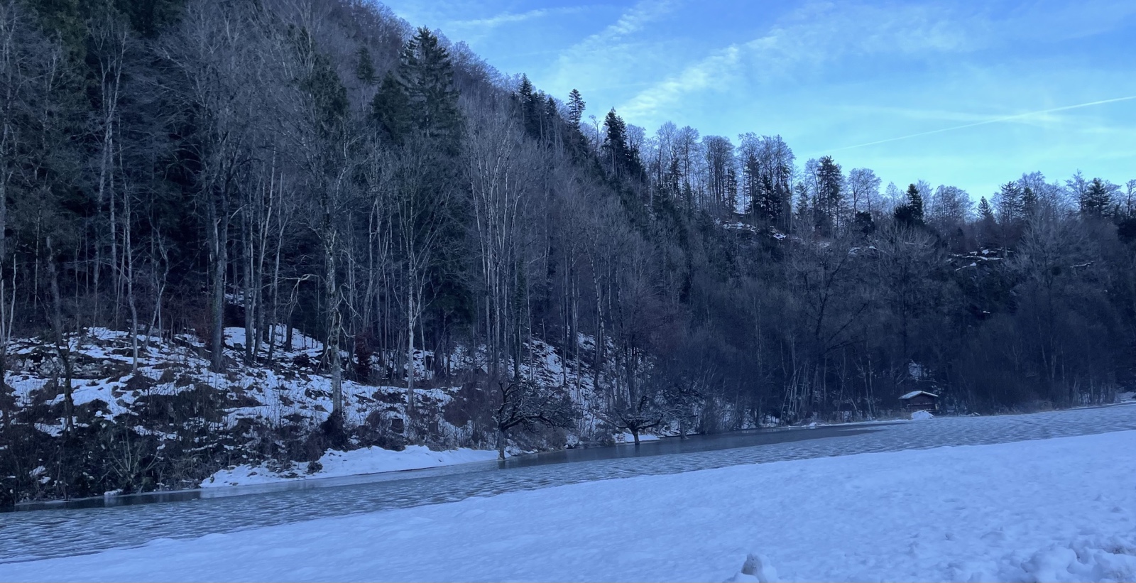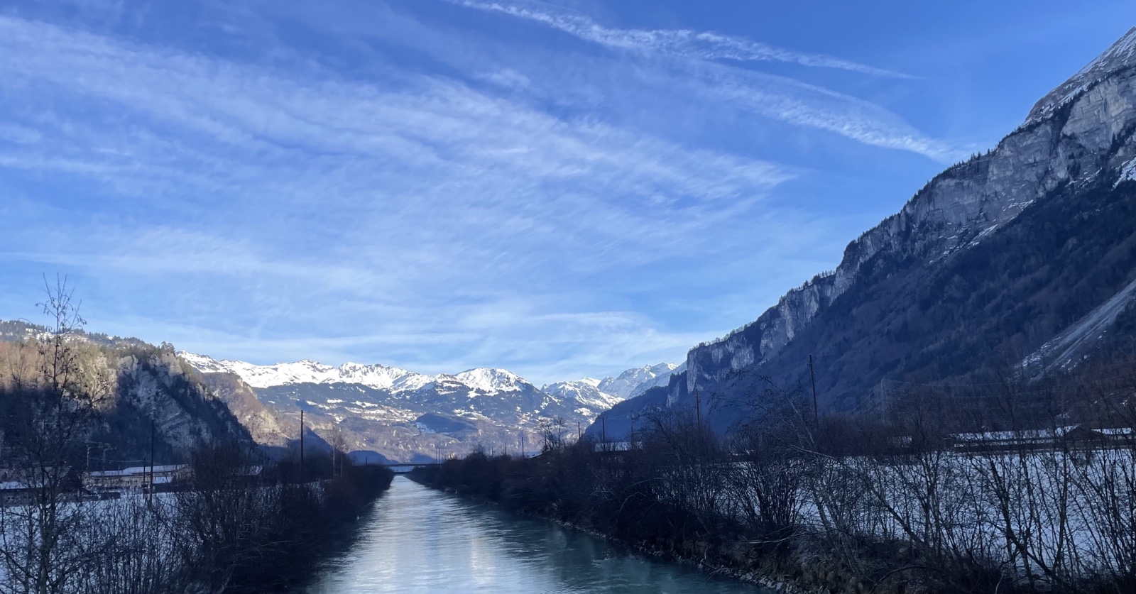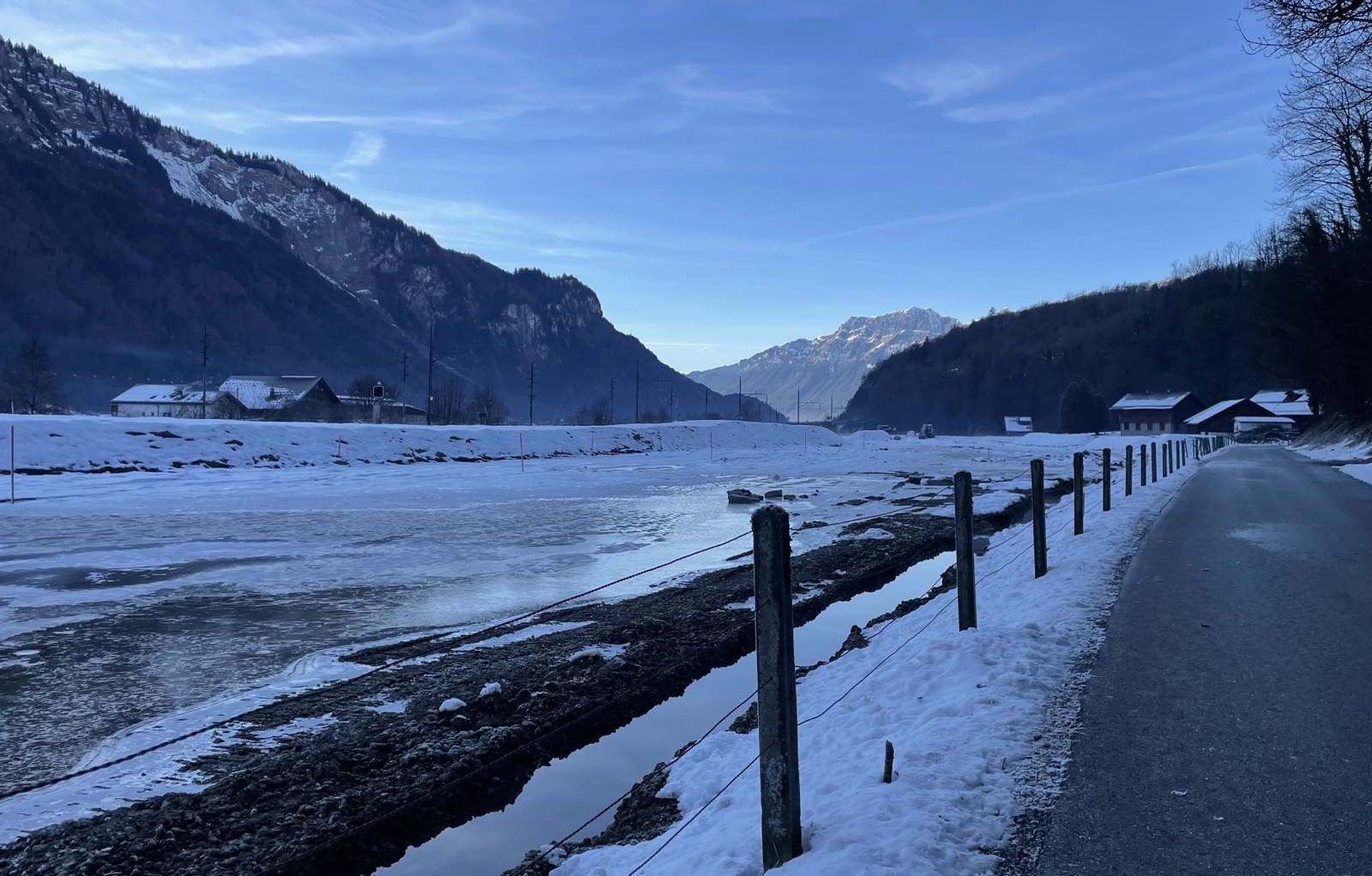 Unterhalb der Brunnenfluh zweige ich nach links ab und rolle die nächsten paar Kilometer entlang des Oltschibachkanals. Die Strasse ist mit Raureif bedeckt, Es knirscht unter den Reifen. Hin und wieder ist aber auch gar kein Rollgeräusch zu hören – Achtung Glatteis! Ein feiner Bodennebel ist auf Teilstrecken zu sehen. Am Himmel sind wiederum viel mehr Kondensstreifen zu sehen, als zu den hohen Zeiten der Pandemie.