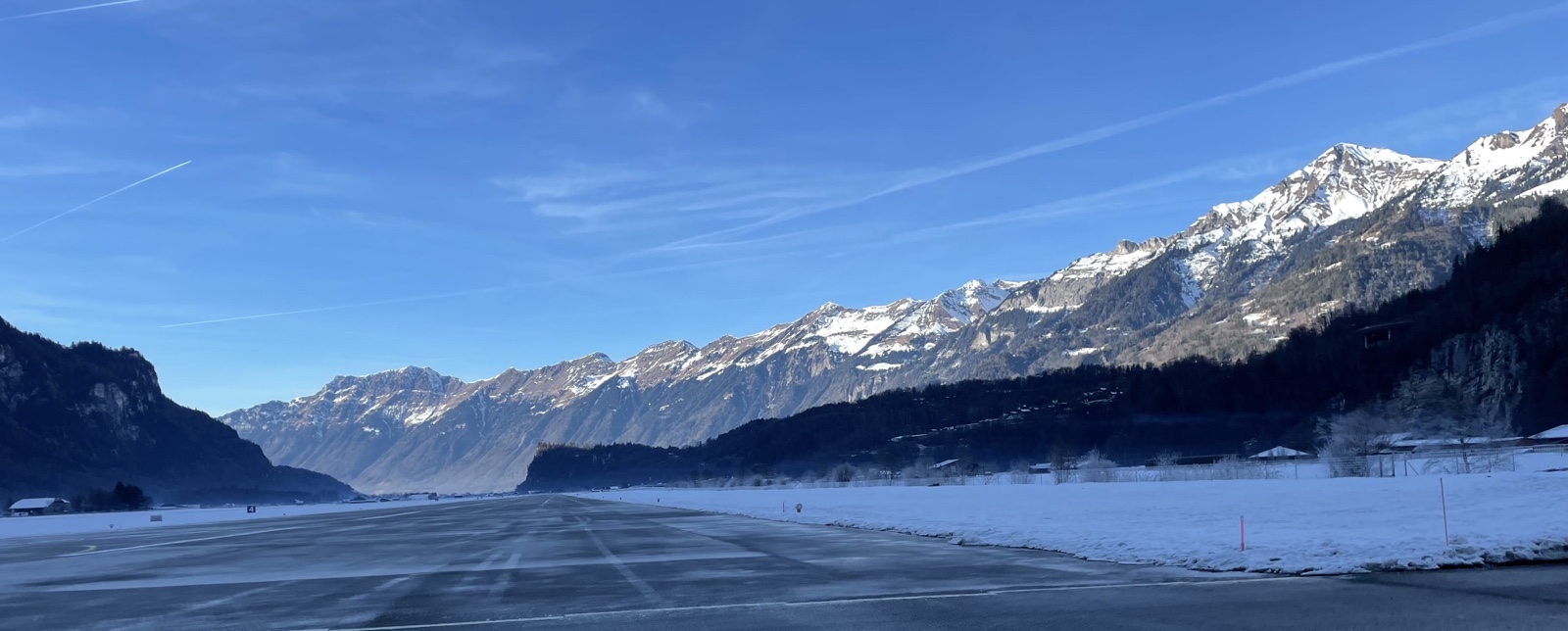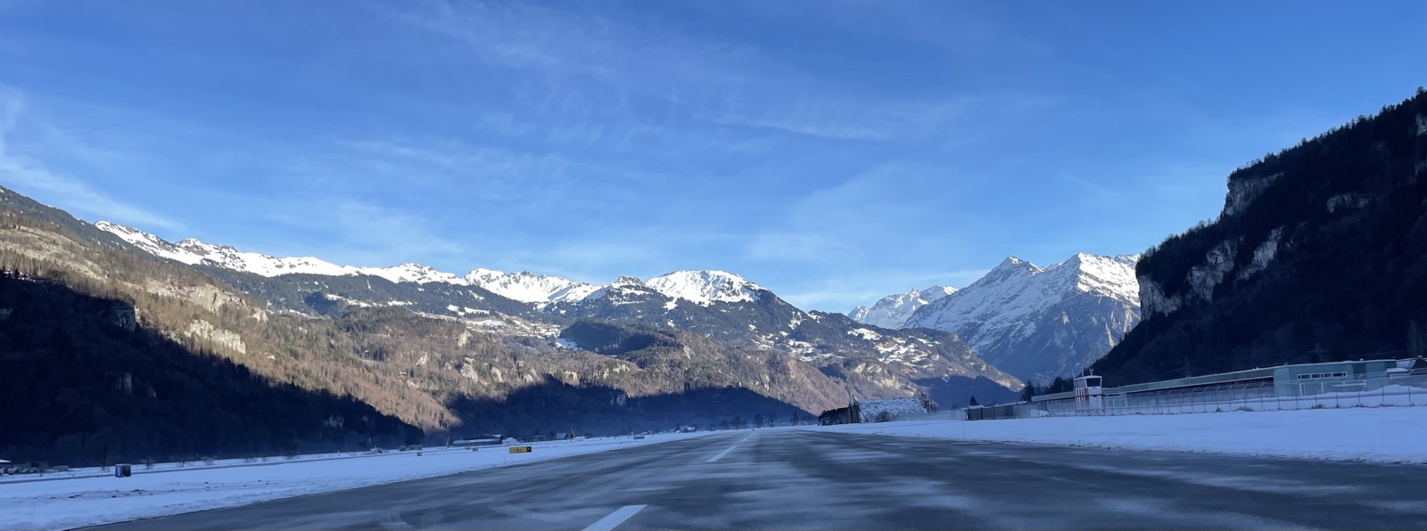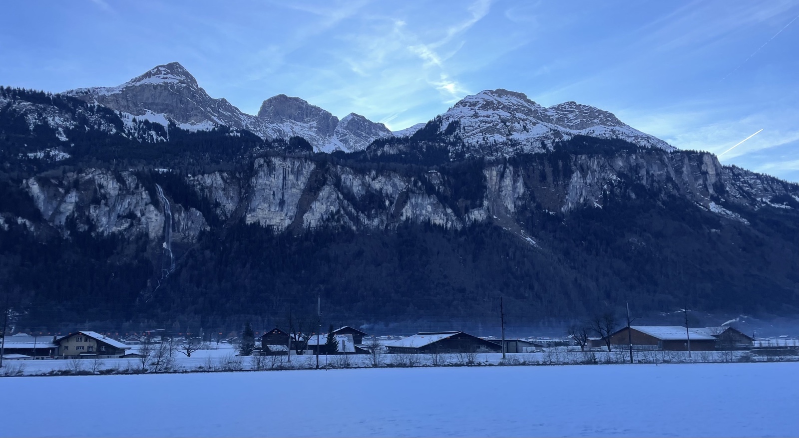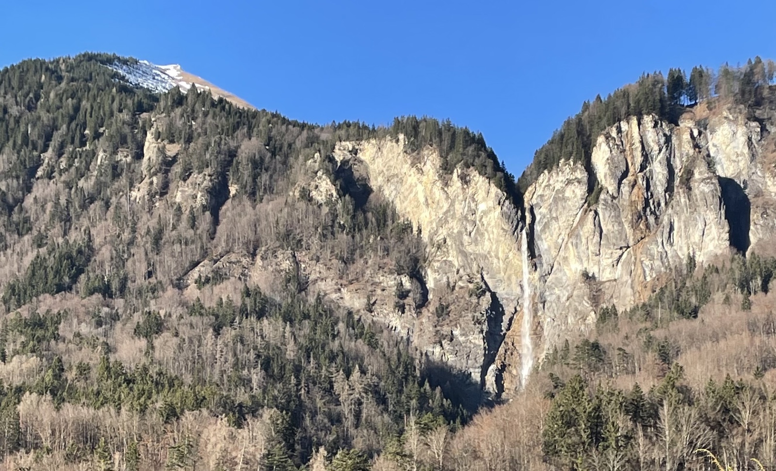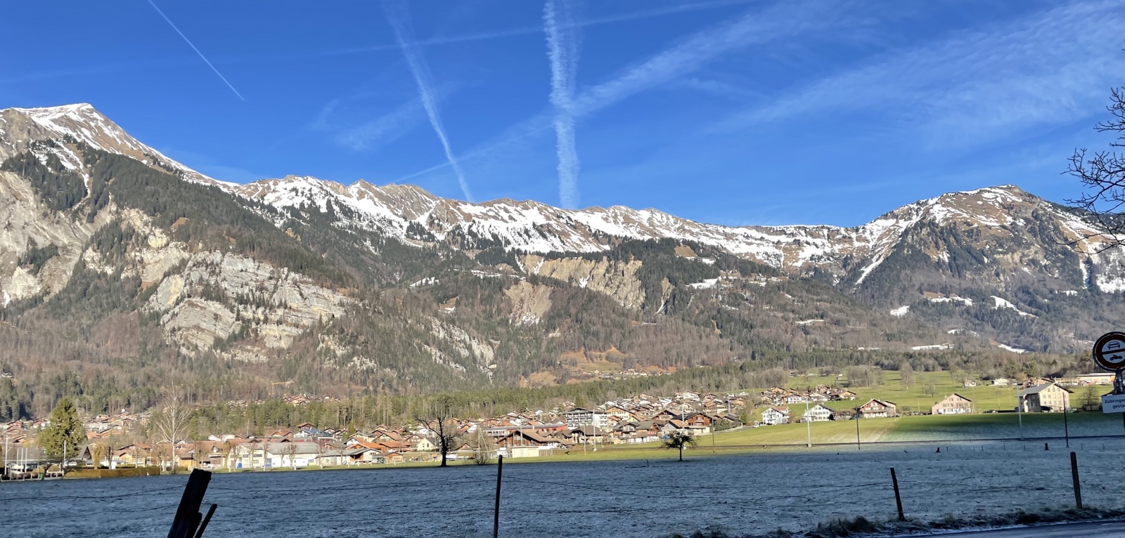 Unterhalb der Brunnenfluh zweige ich nach links ab und rolle die nächsten paar Kilometer entlang des Oltschibachkanals. Die Strasse ist mit Raureif bedeckt, Es knirscht unter den Reifen. Hin und wieder ist aber auch gar kein Rollgeräusch zu hören – Achtung Glatteis! Ein feiner Bodennebel ist auf Teilstrecken zu sehen. Am Himmel sind wiederum viel mehr Kondensstreifen zu sehen, als zu den hohen Zeiten der Pandemie.