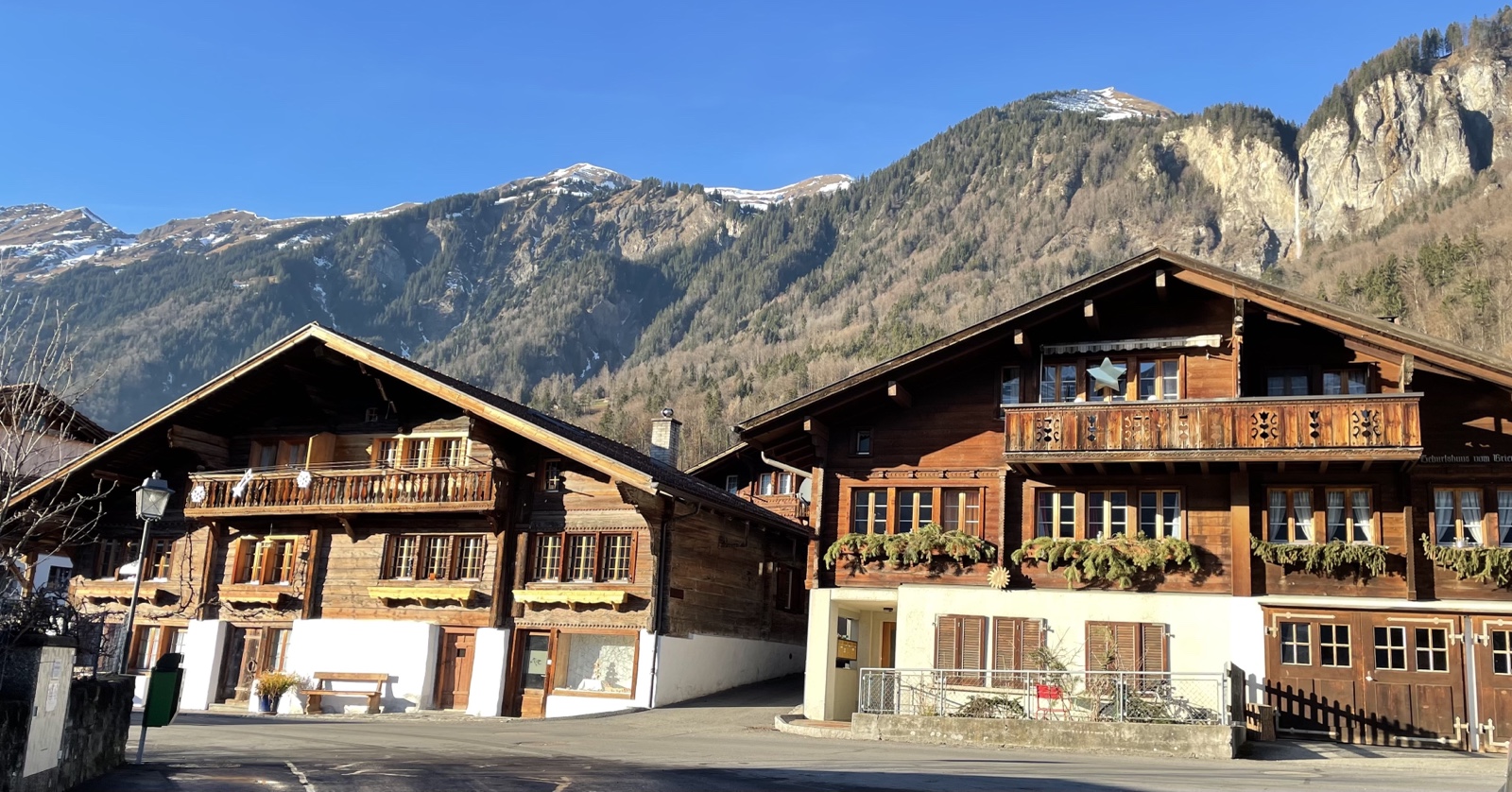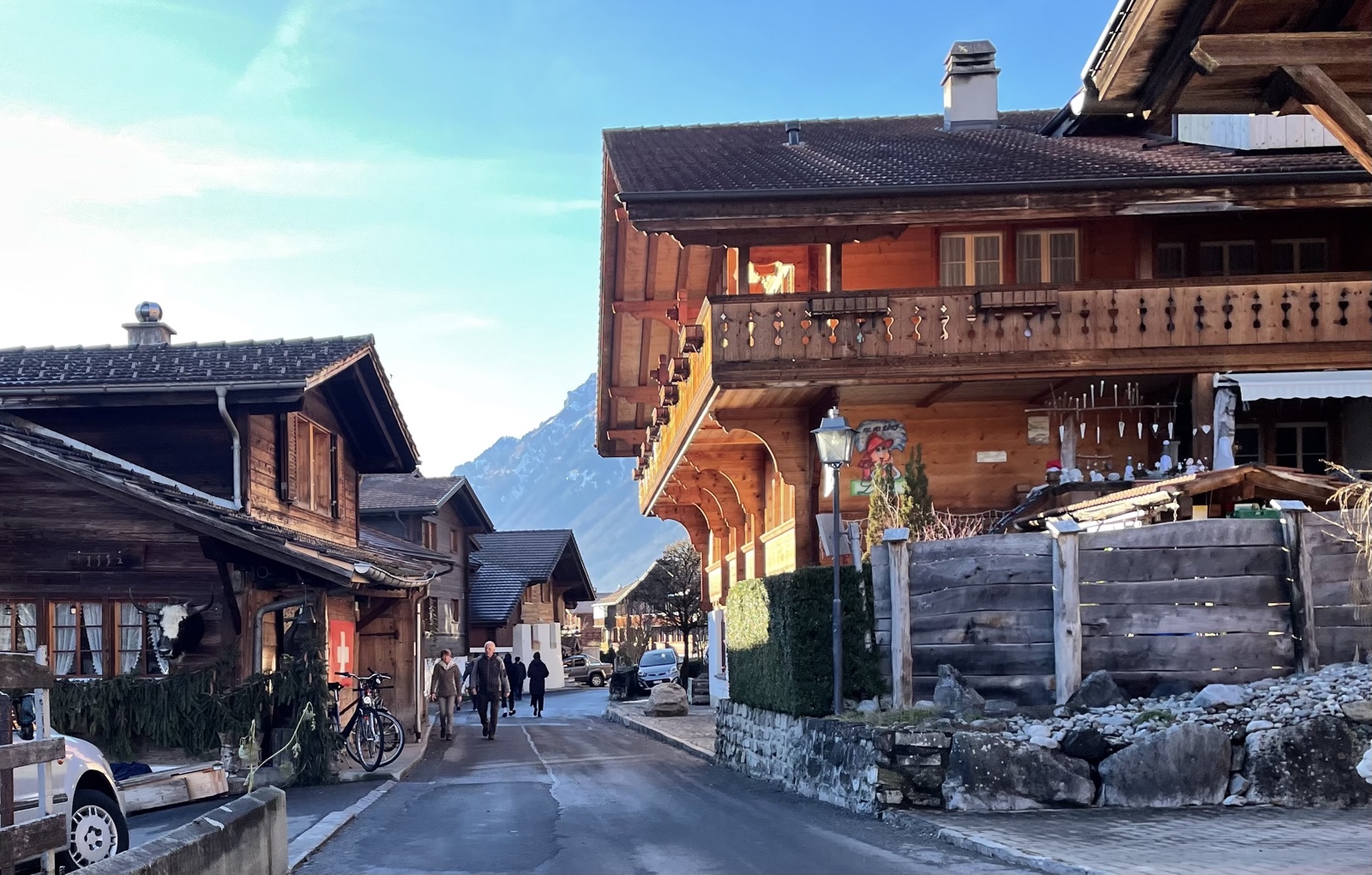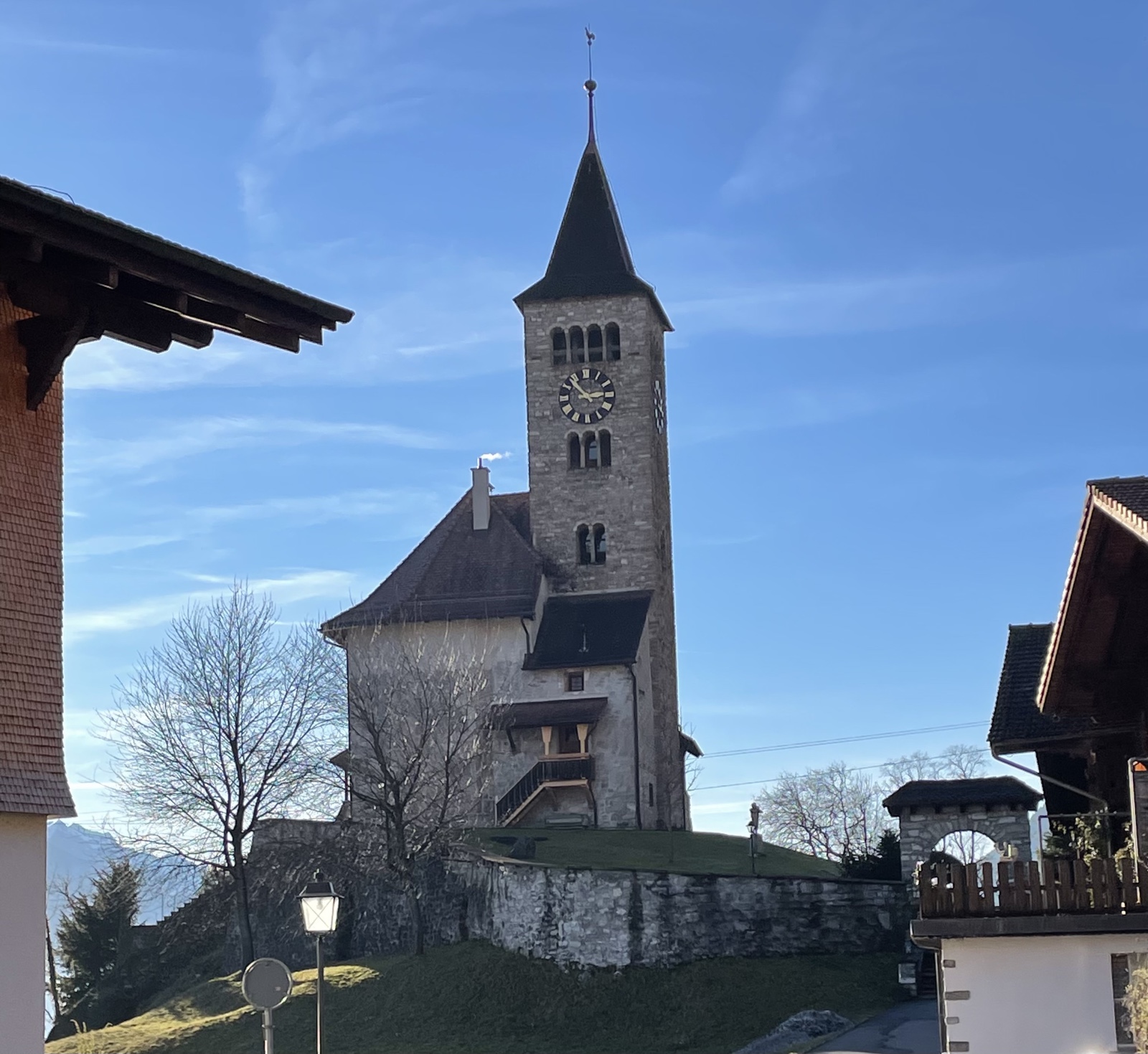 zur Schnätzi (Schule für Holzbildhauerei, links) und weiter zur Kirche. Ich geniesse den Anblick dieser schönen alten Häuser und der reformierten Kirche auf dem Hügel immer wieder sehr!