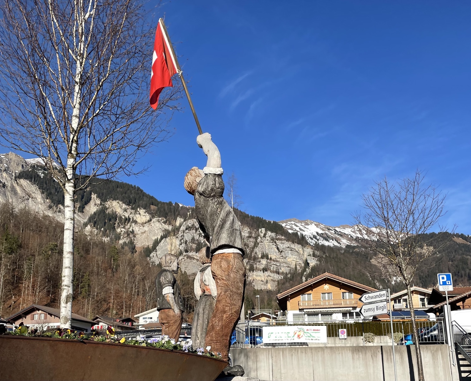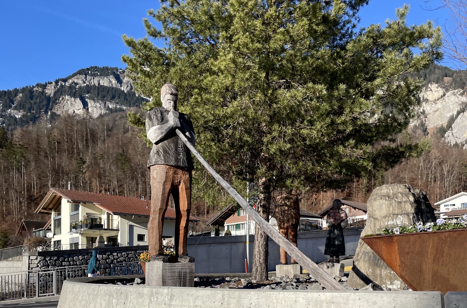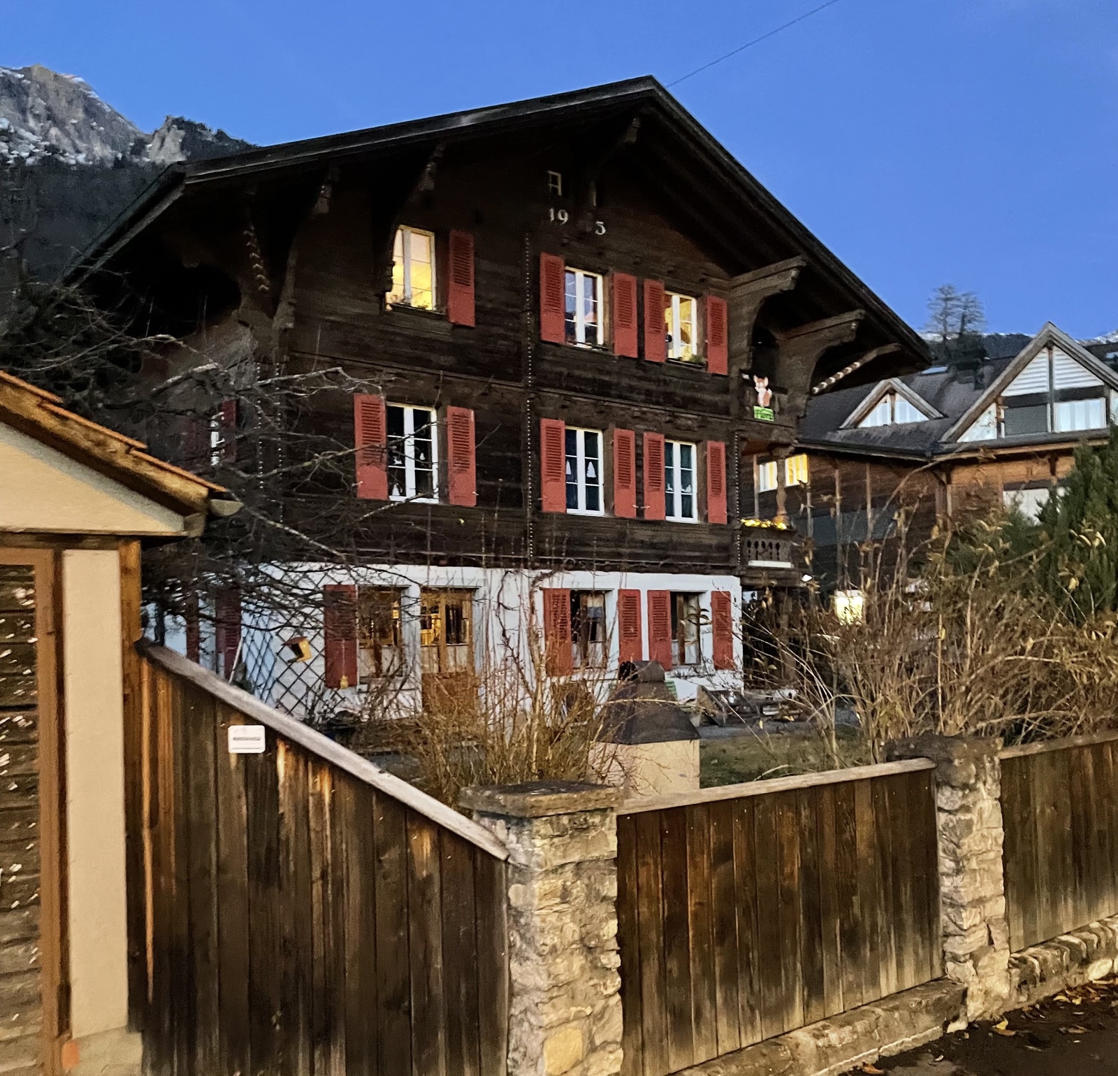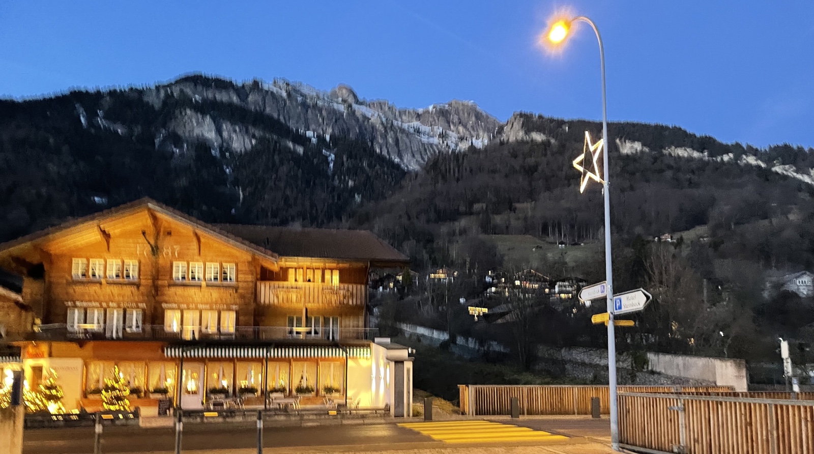 zur Schnätzi (Schule für Holzbildhauerei, links) und weiter zur Kirche. Ich geniesse den Anblick dieser schönen alten Häuser und der reformierten Kirche auf dem Hügel immer wieder sehr!