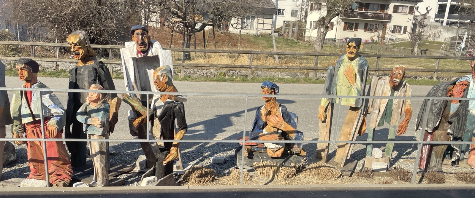 Nach dem Essen spazieren wir auf dem gleichen Weg, mitten auf der dörflichen Hauptstrasse heimwärts. Es bleibt uns gar nichts anderes übrig, Gehsteige gibt es so oder so keine und der Strassenrand ist total vereist!